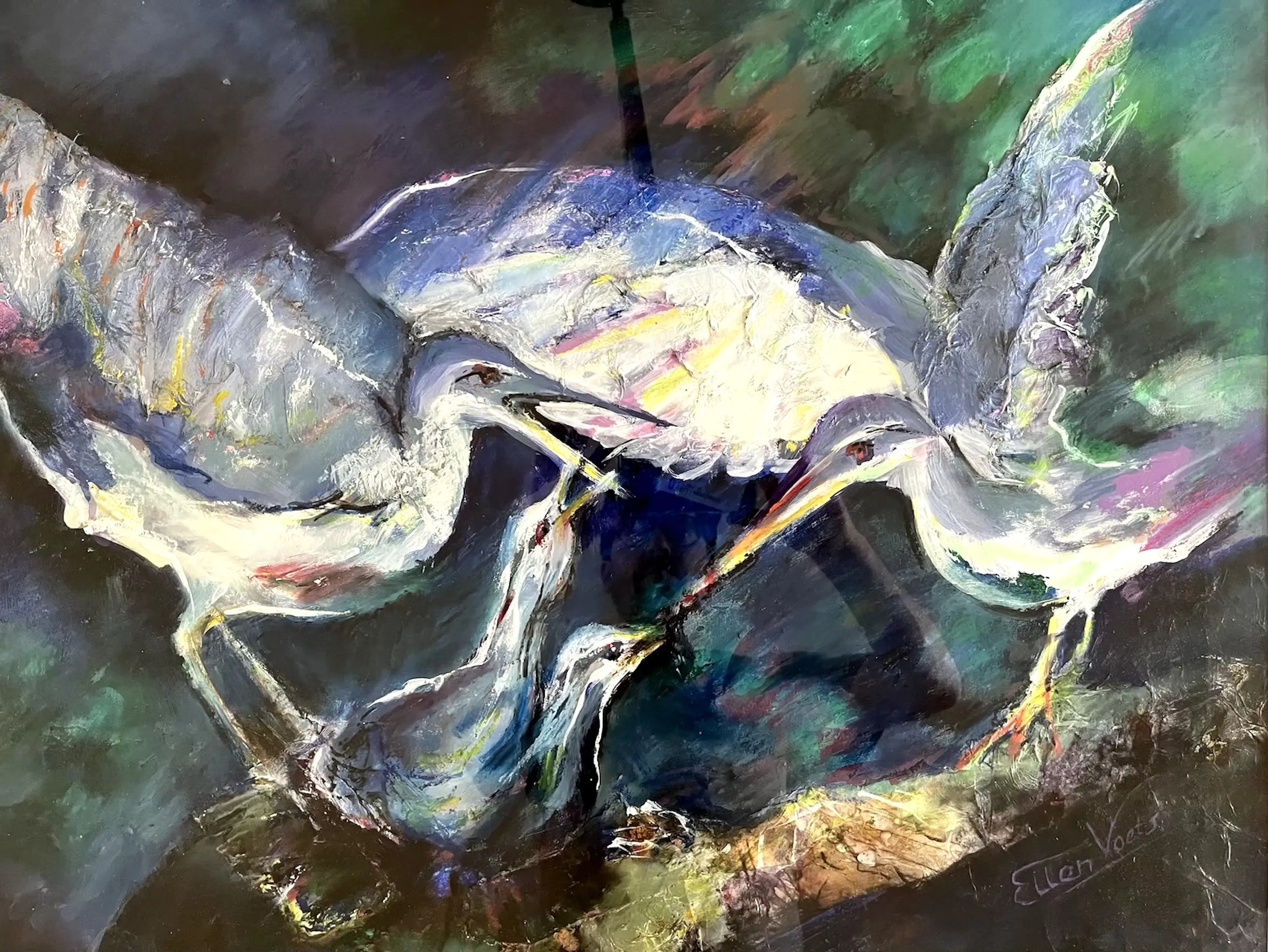 SCH 16 Ellen Voets Vogels op nest Gouache 50 x 68 cm 82 x 91 cm Glas in de lijst is kapot