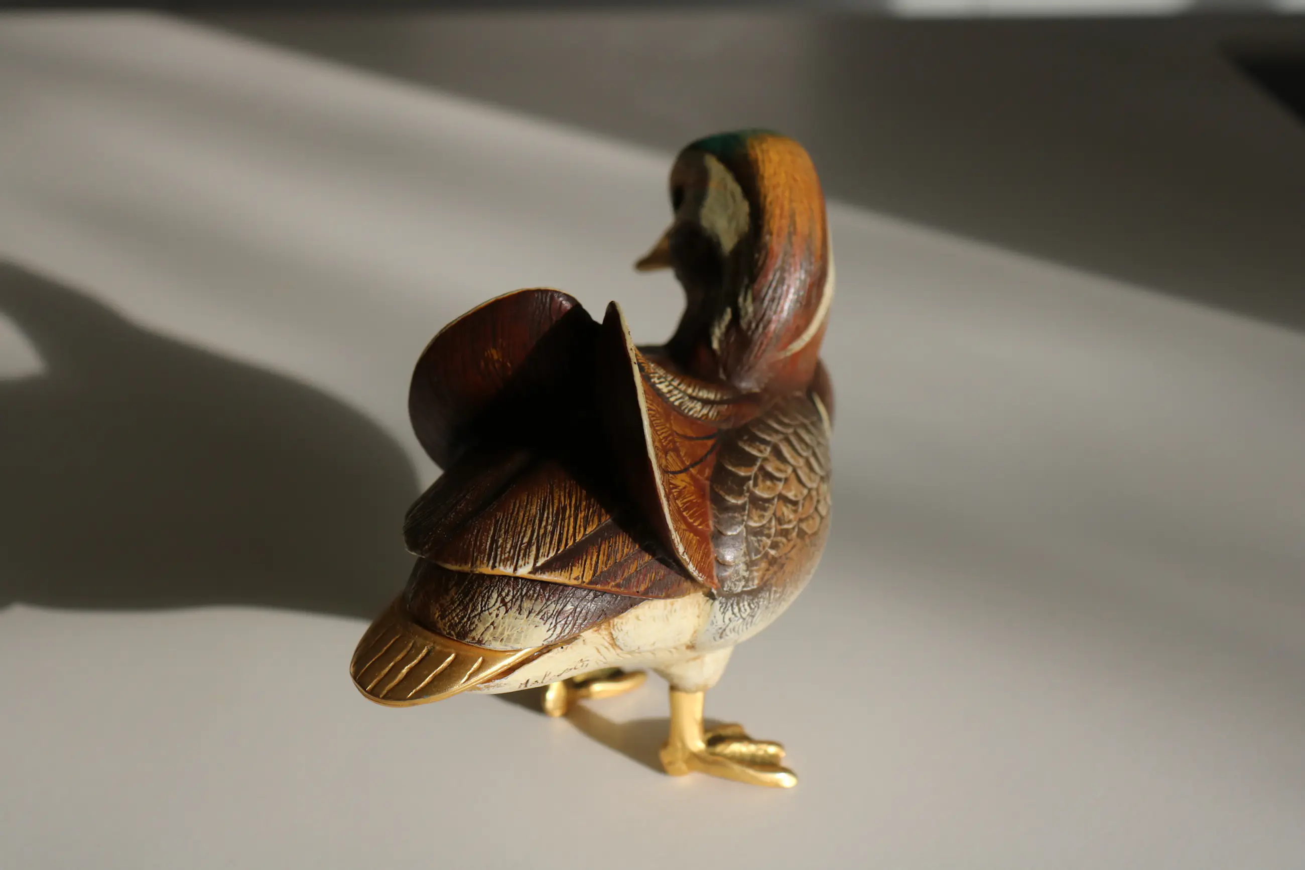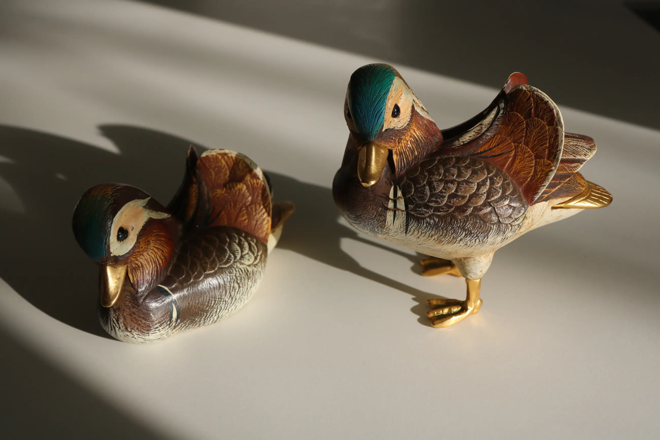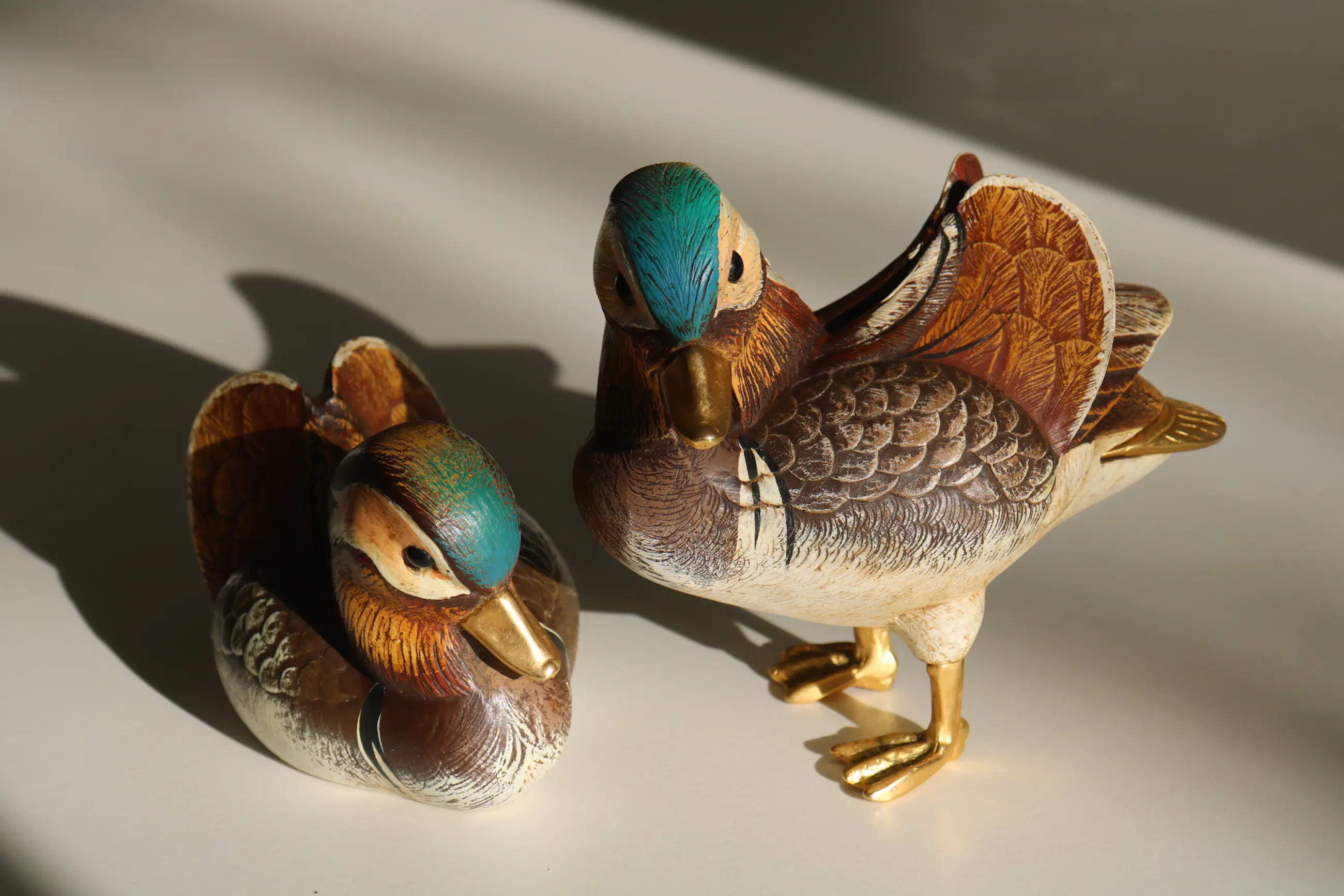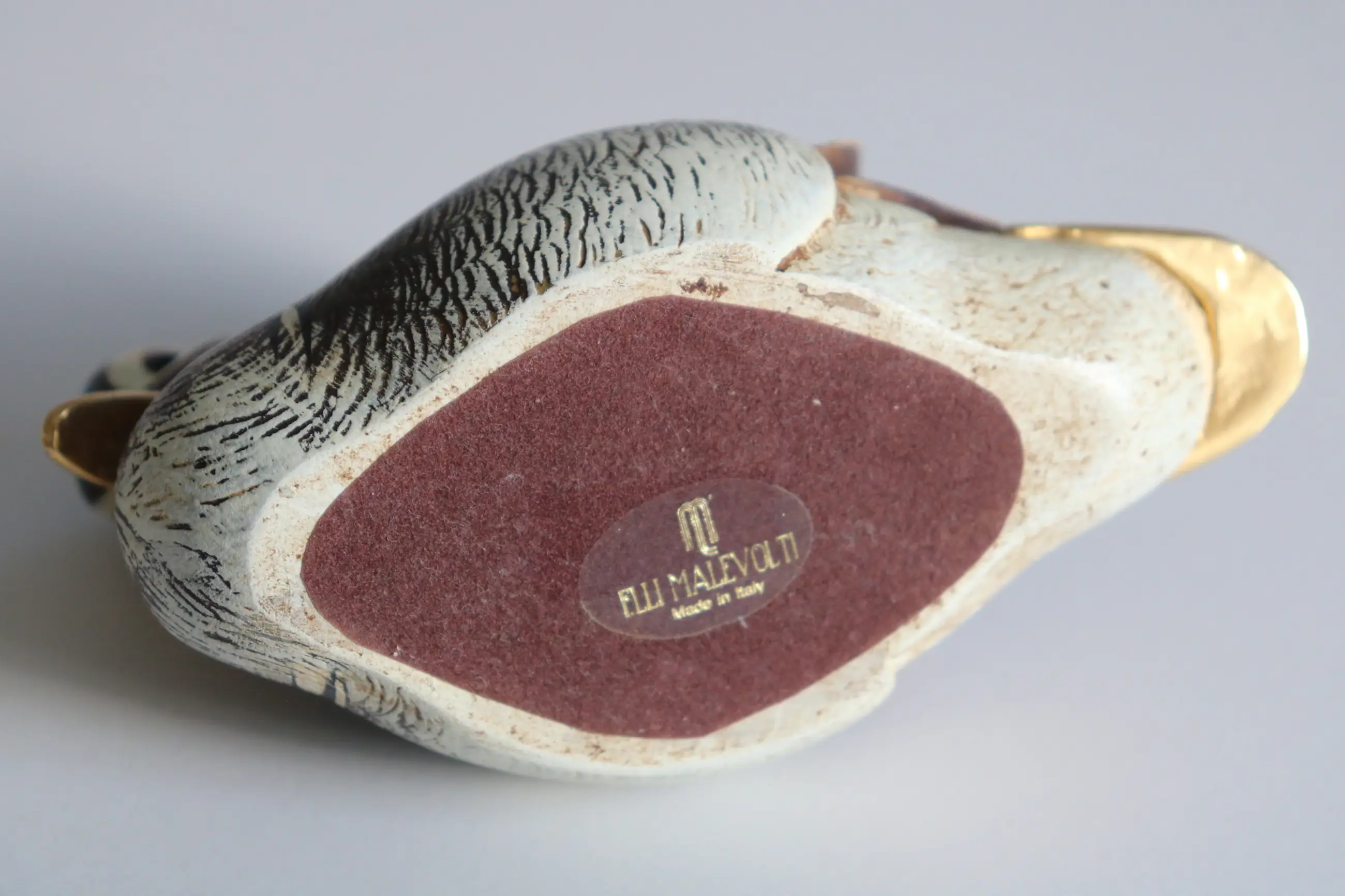 Opvallende set schattige handgemaakte eendjes ontworpen door Elli Malevolti uit Italië. Met glazen ogen. Poten, snavels en staarten zijn gemaakt van messing. Dit zijn verzamelaarsstukken.