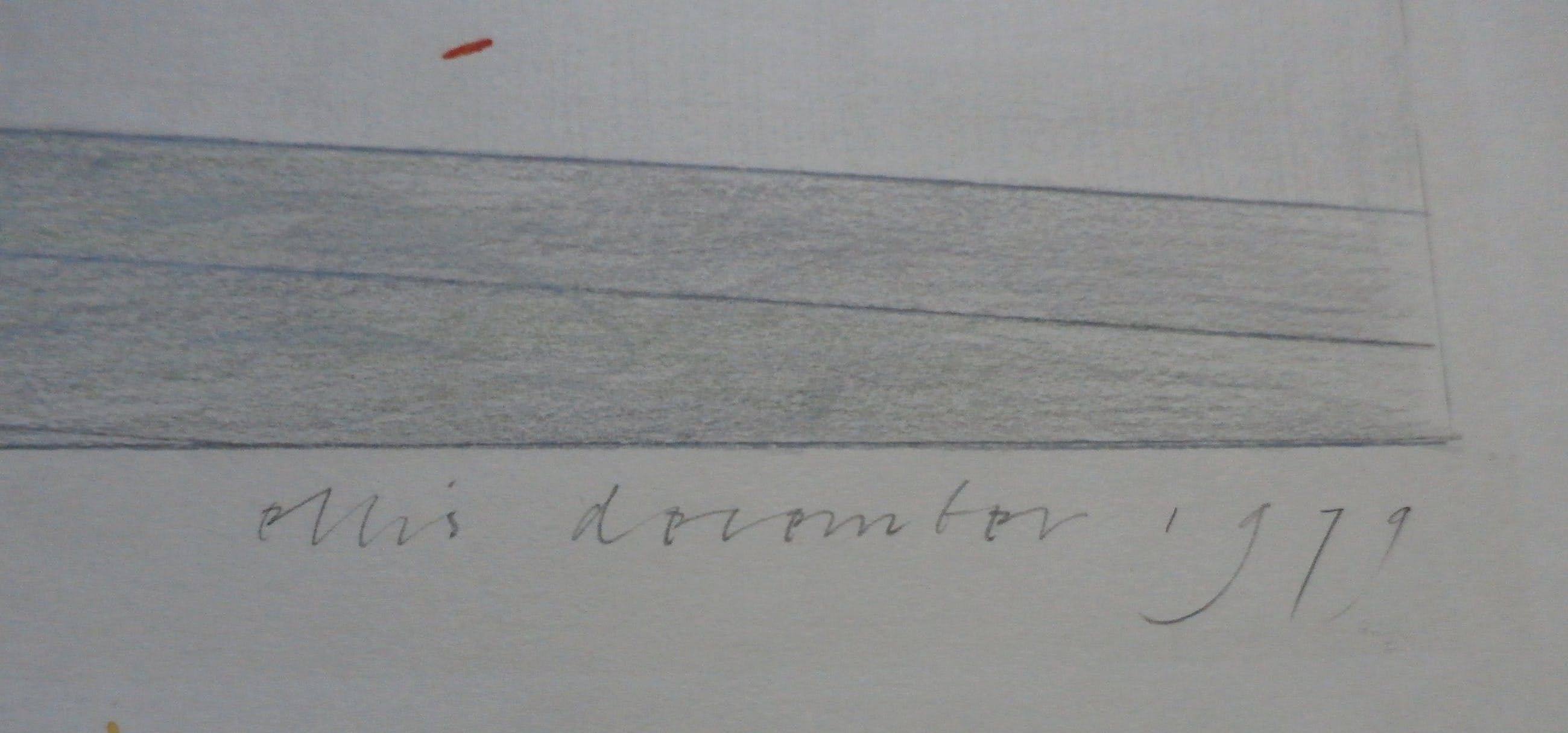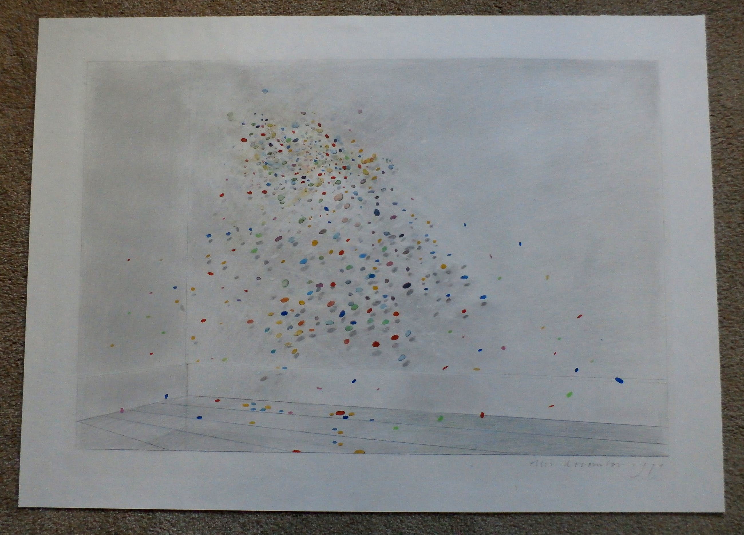 Fraaie tekening van Ellis Tertoolen: interieur met stippen. Techniek: potlood en waterverf. Afmetingen blad: h65,5 x b90 cm. Afmetingen voorstelling: h52,5 x b76 cmGesigneerd en gedateerd (december 1979) rechtsonder met potlood.