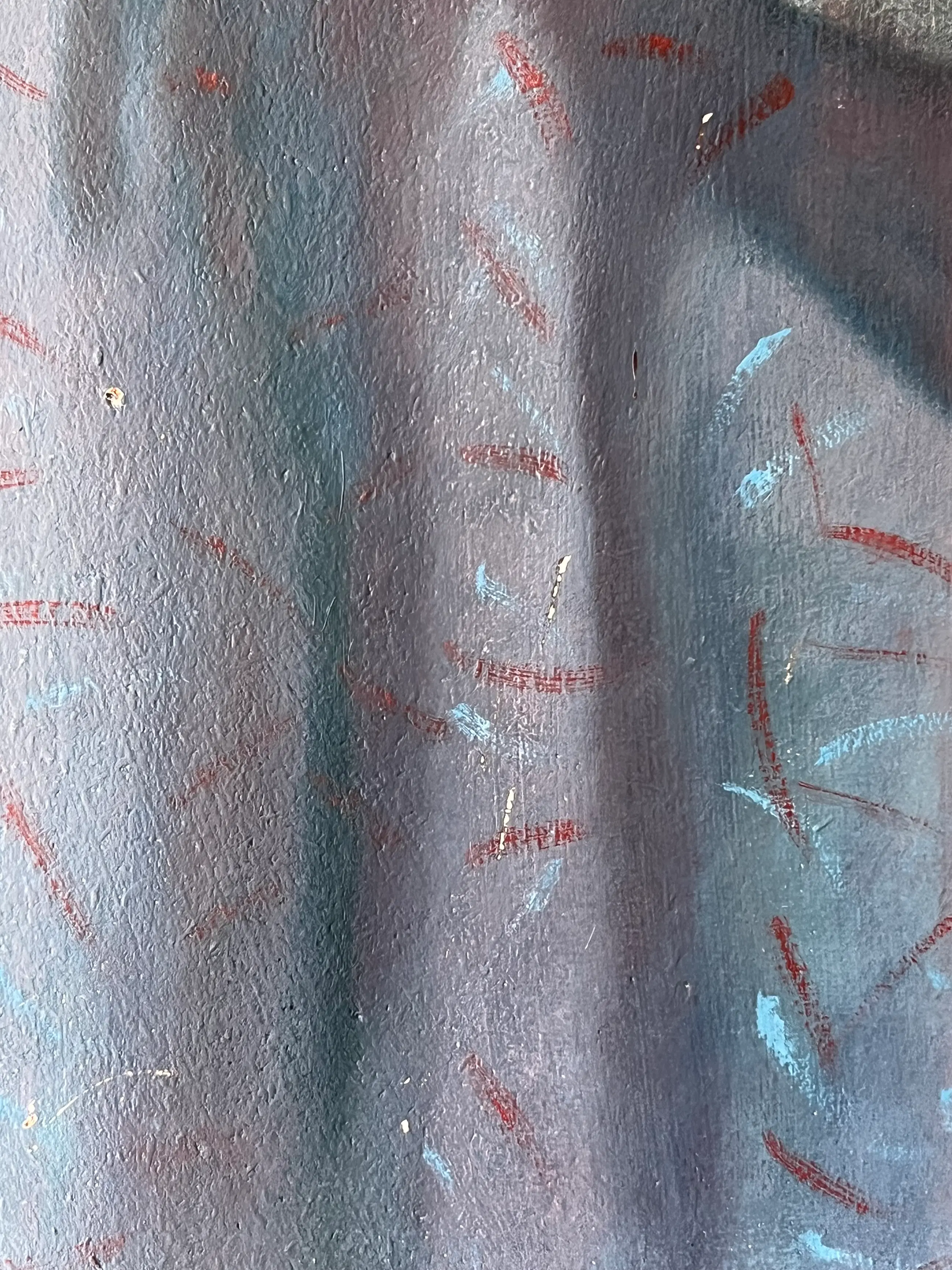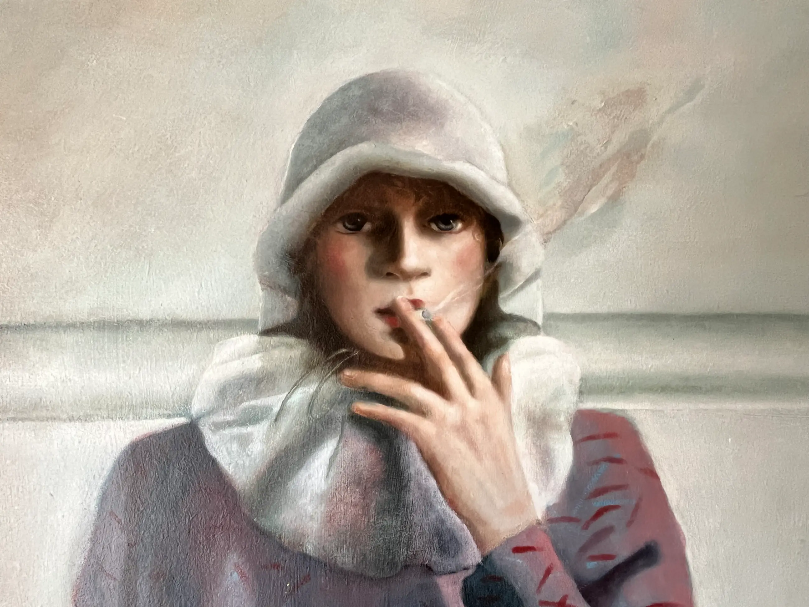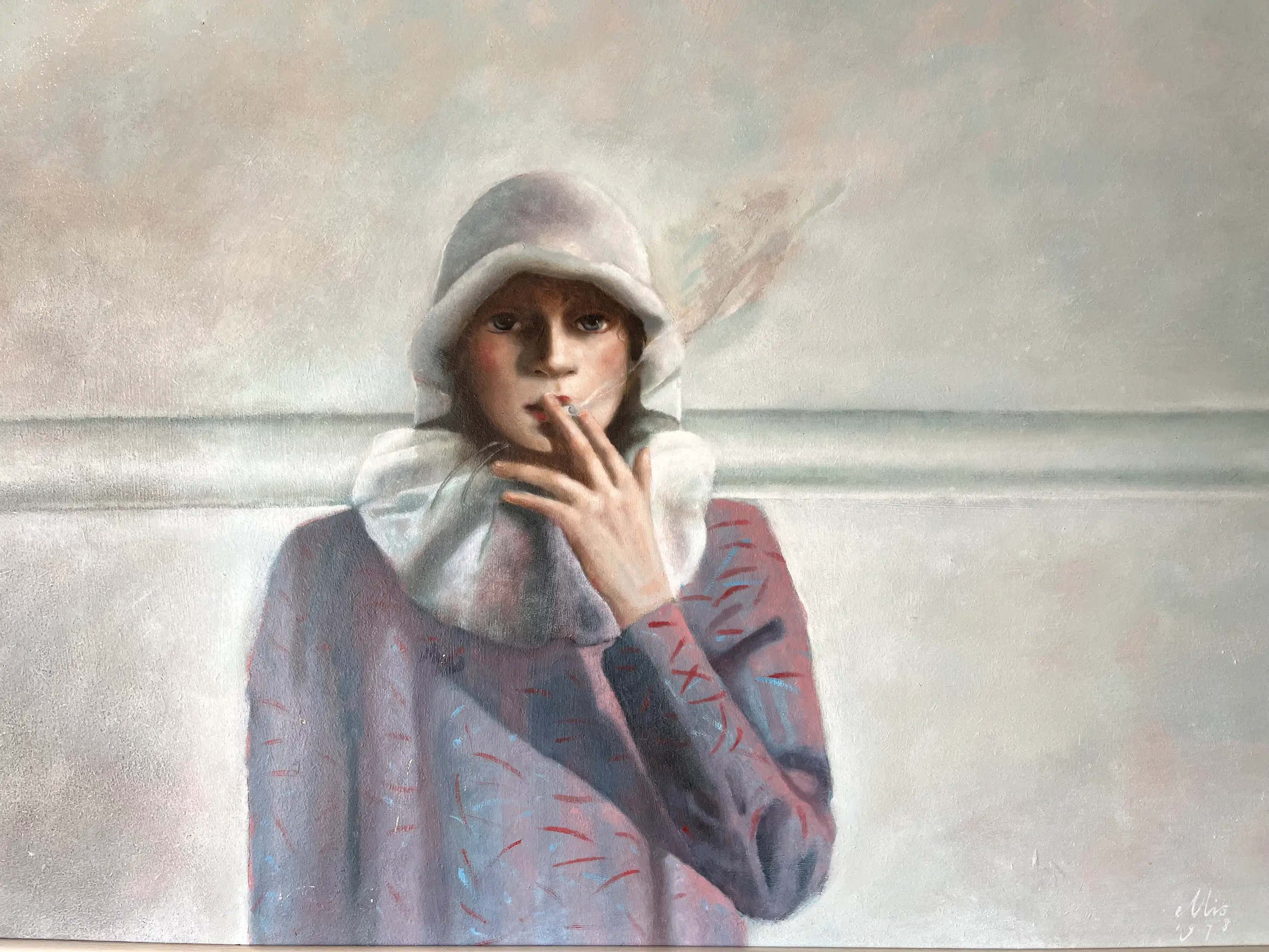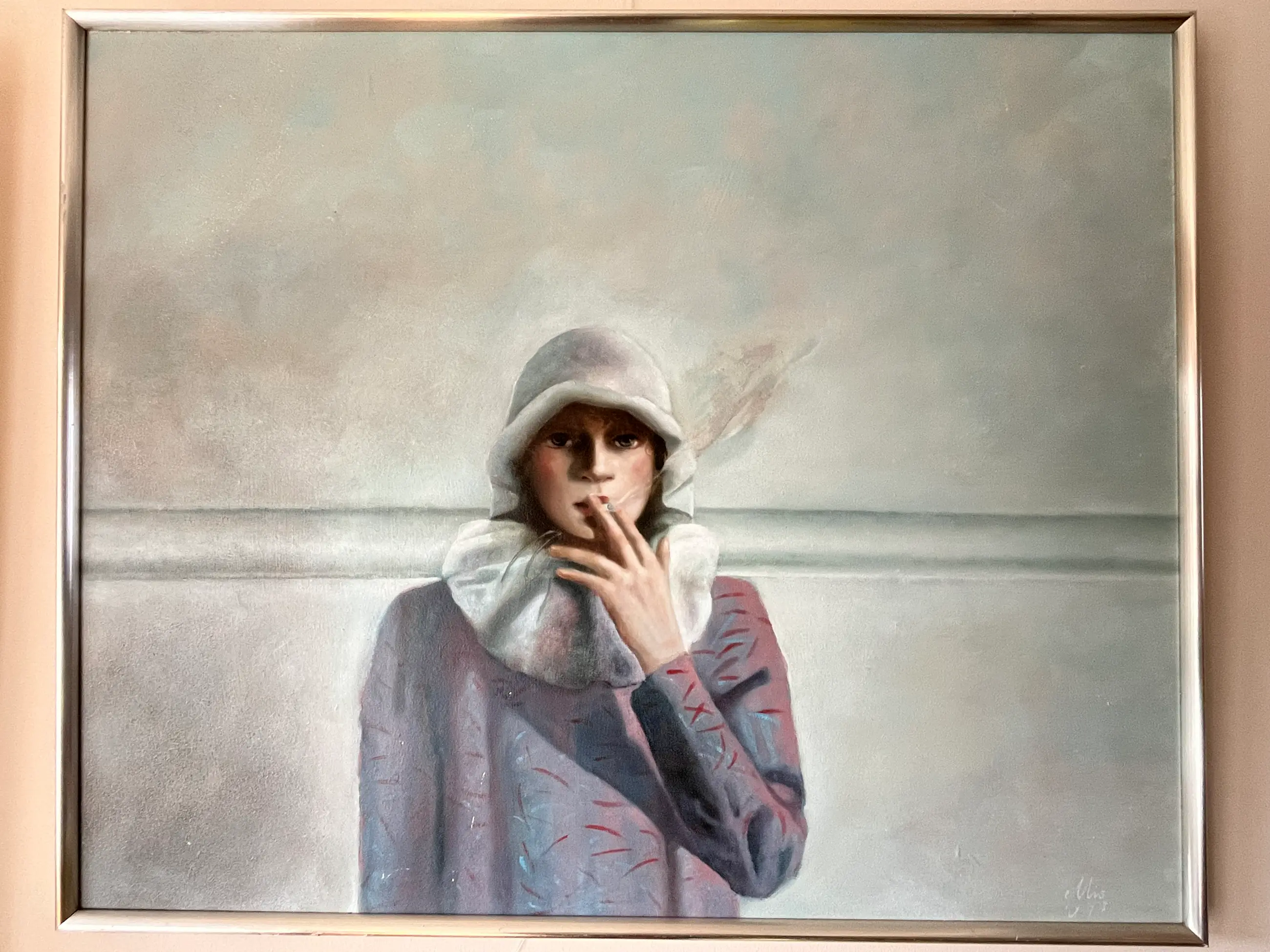 Olieverf op board uit 1978. Werk is “koud” gelijst in zilverkleurige lijst met zichtbare gebruikssporen op m.n. de onderkant. Werk verdient een betere lijst. In het werk zitten aan de linkerkant van de persoon witte streepjes. Ook zitten op die plek twee puntjes met verfverlies. (Detailfoto’s) Afmeting schilderij 65 x 80 cm. Inclusief lijst 67 x 82 cm.