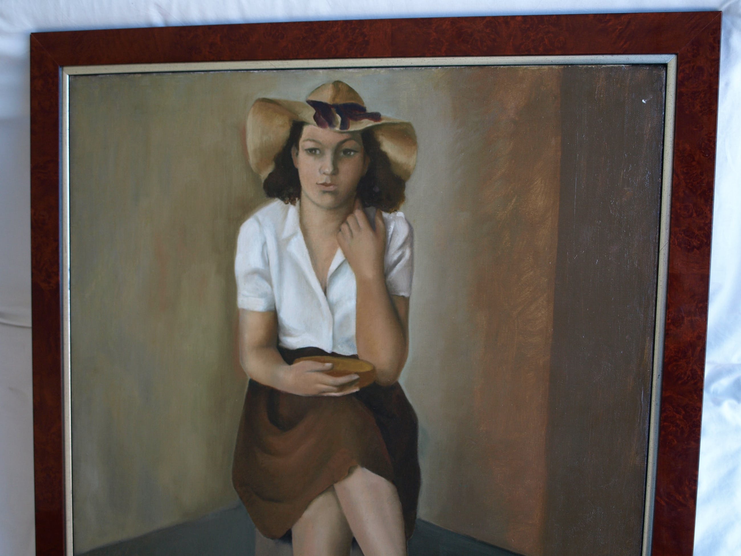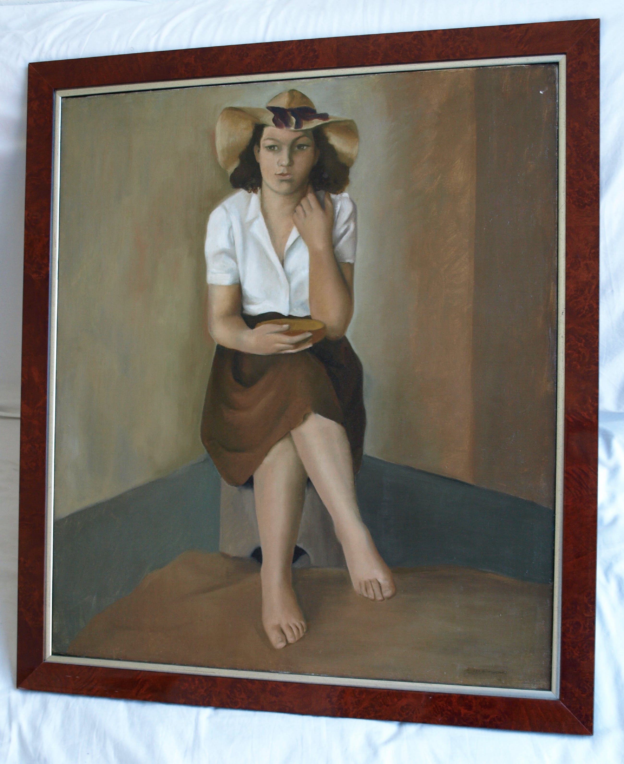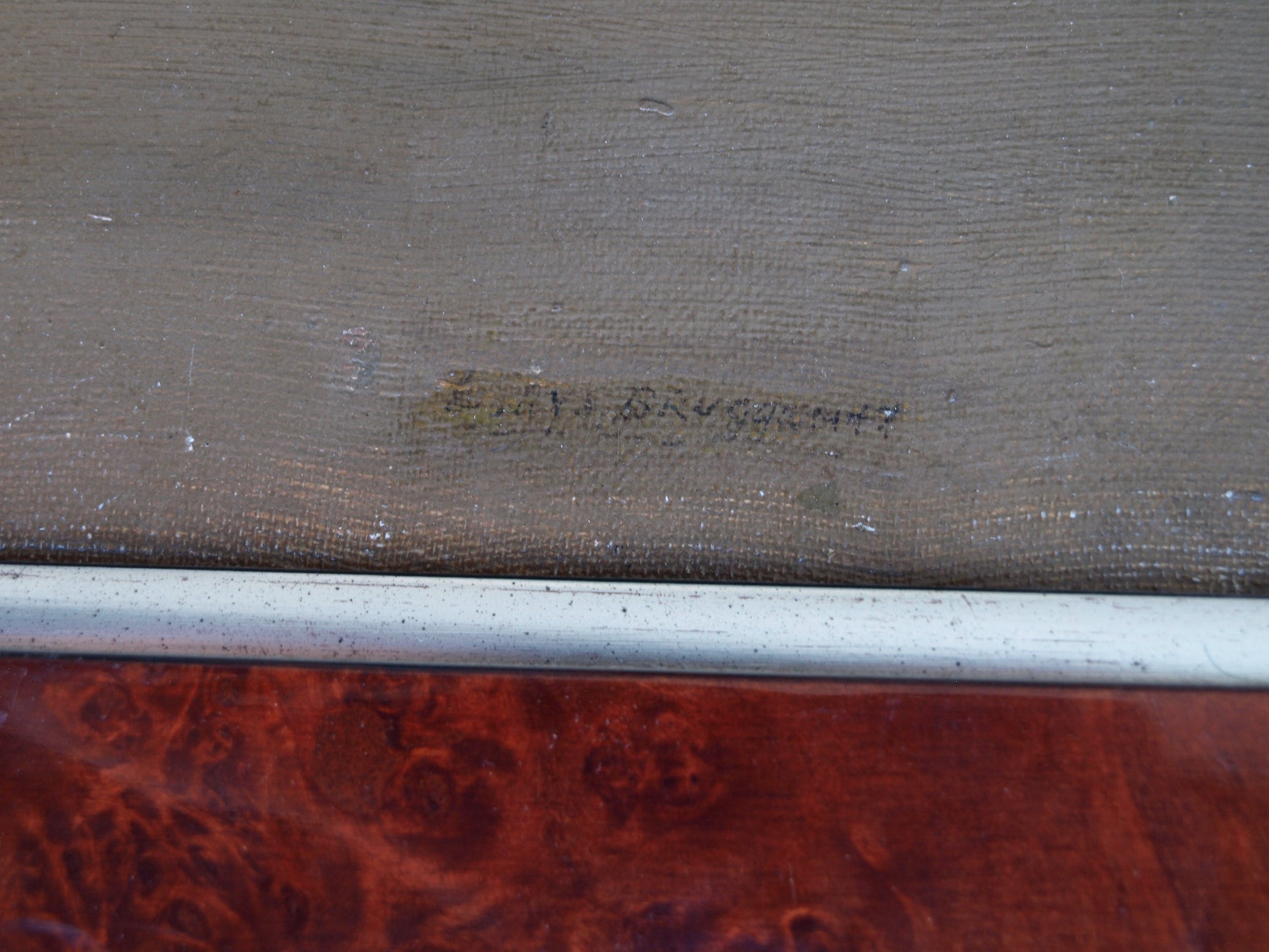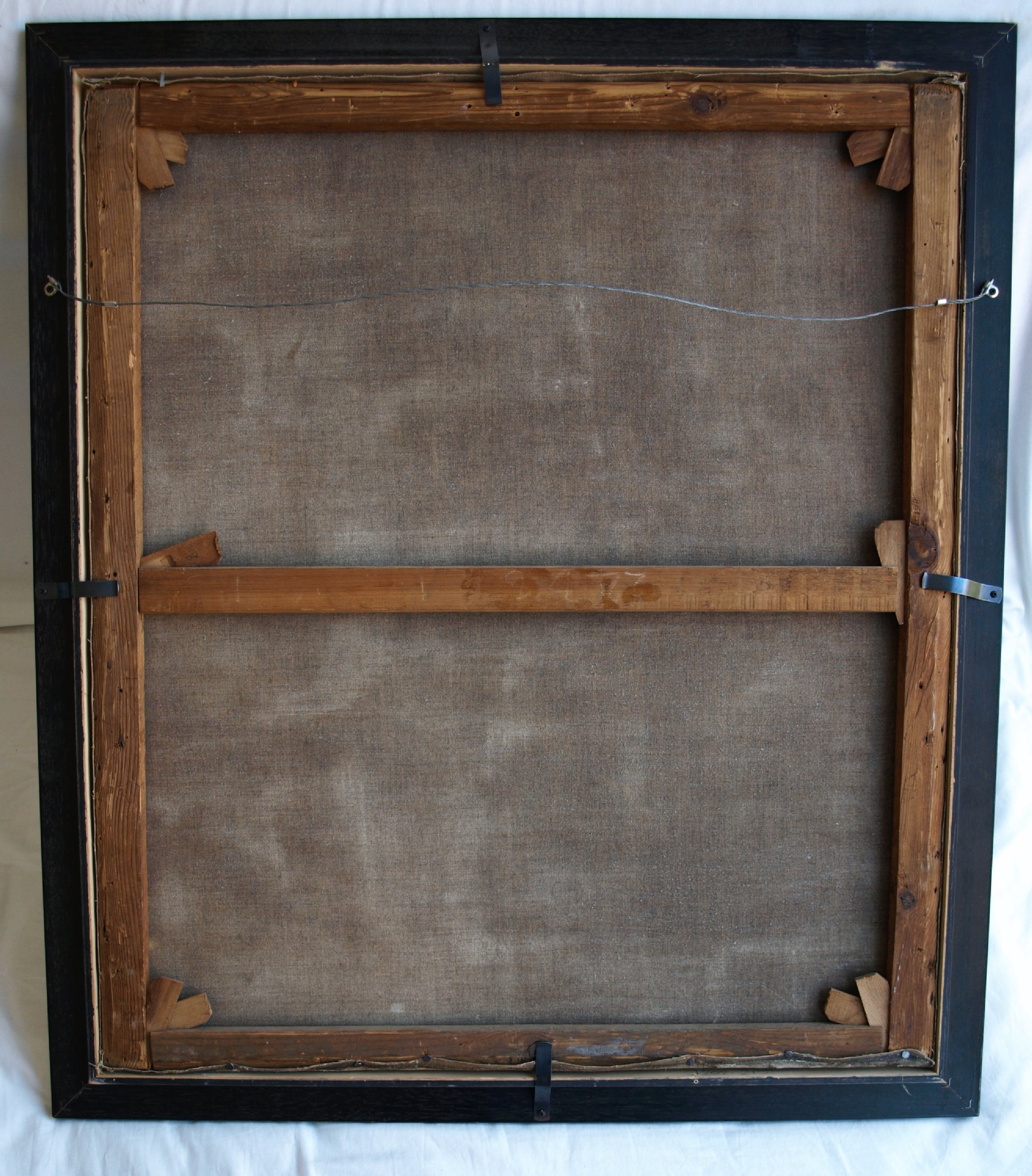 -Olieverf op doek, gespannen op een houten spieraam en ingelijst in een mahonie-houten lijst.