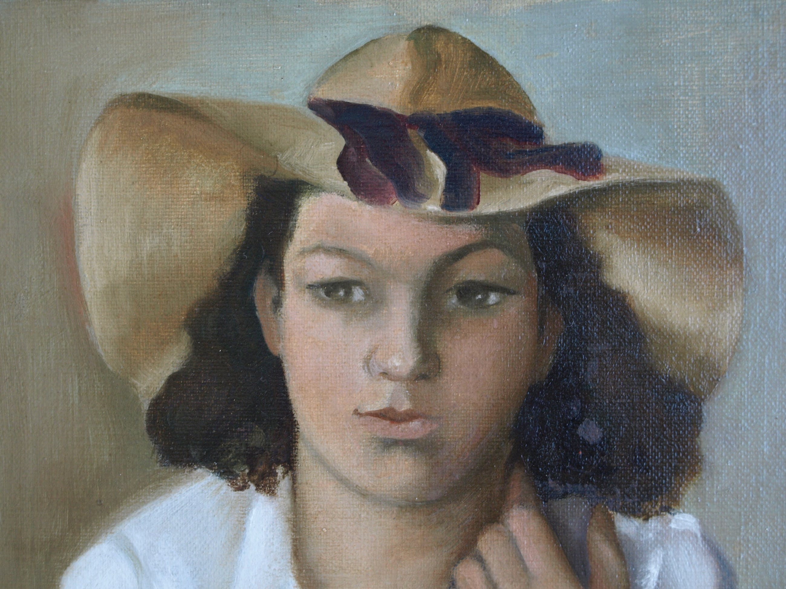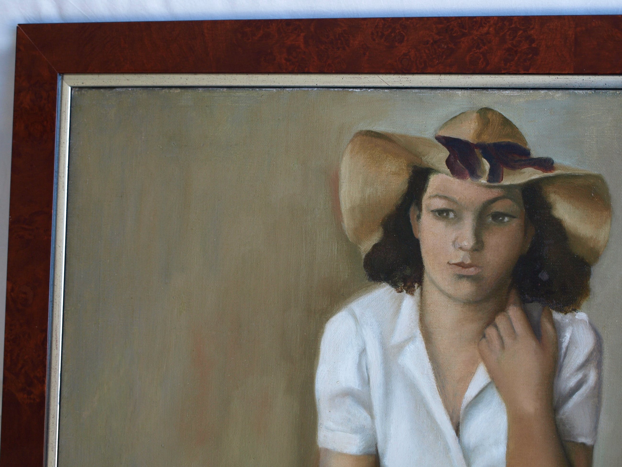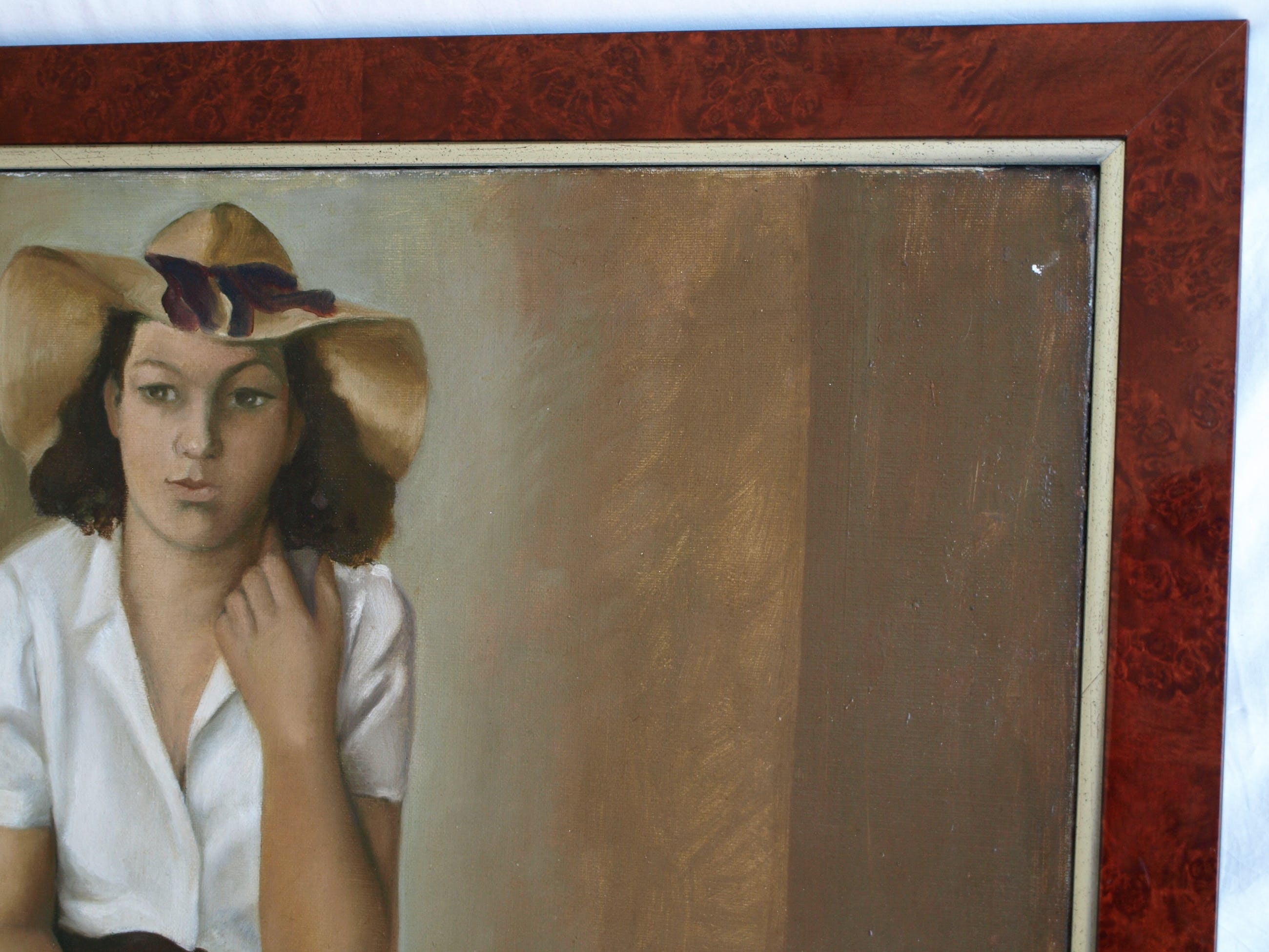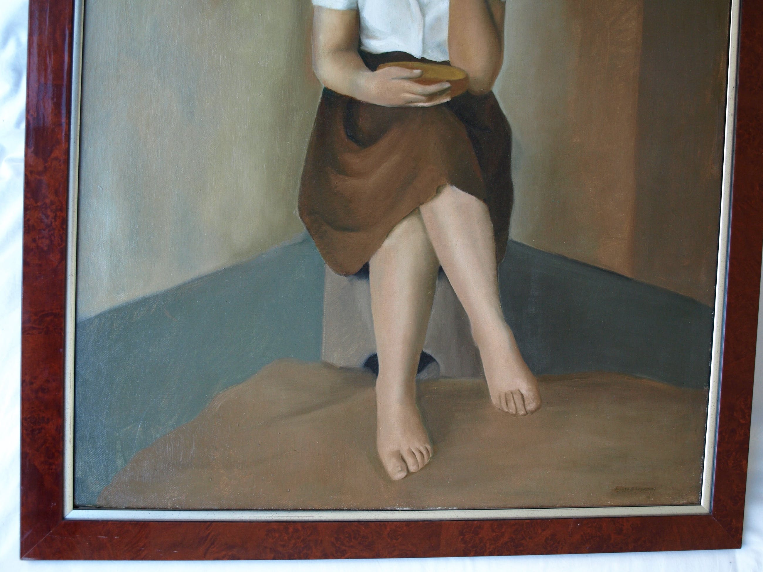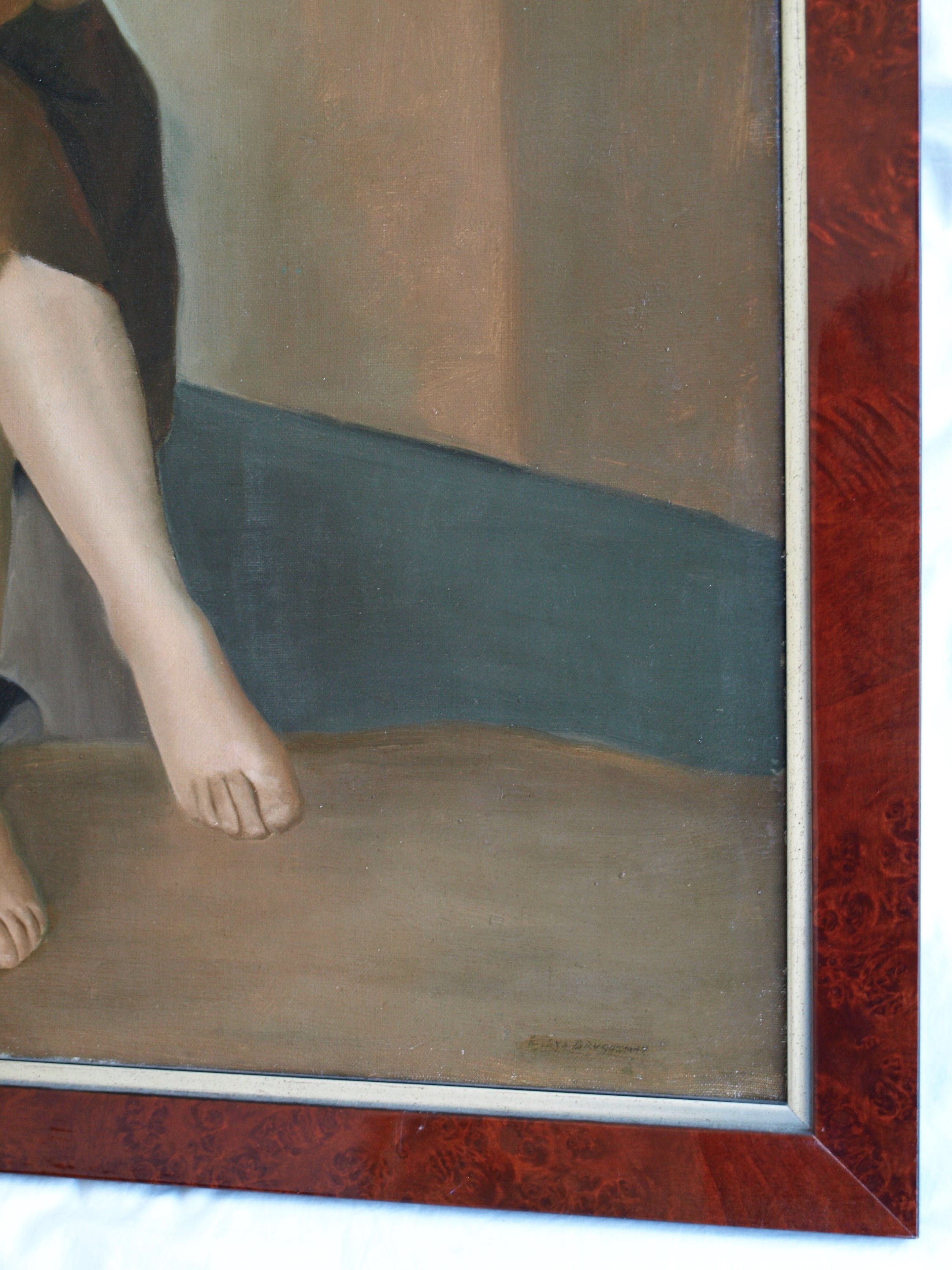 -Olieverf op doek, gespannen op een houten spieraam en ingelijst in een mahonie-houten lijst.