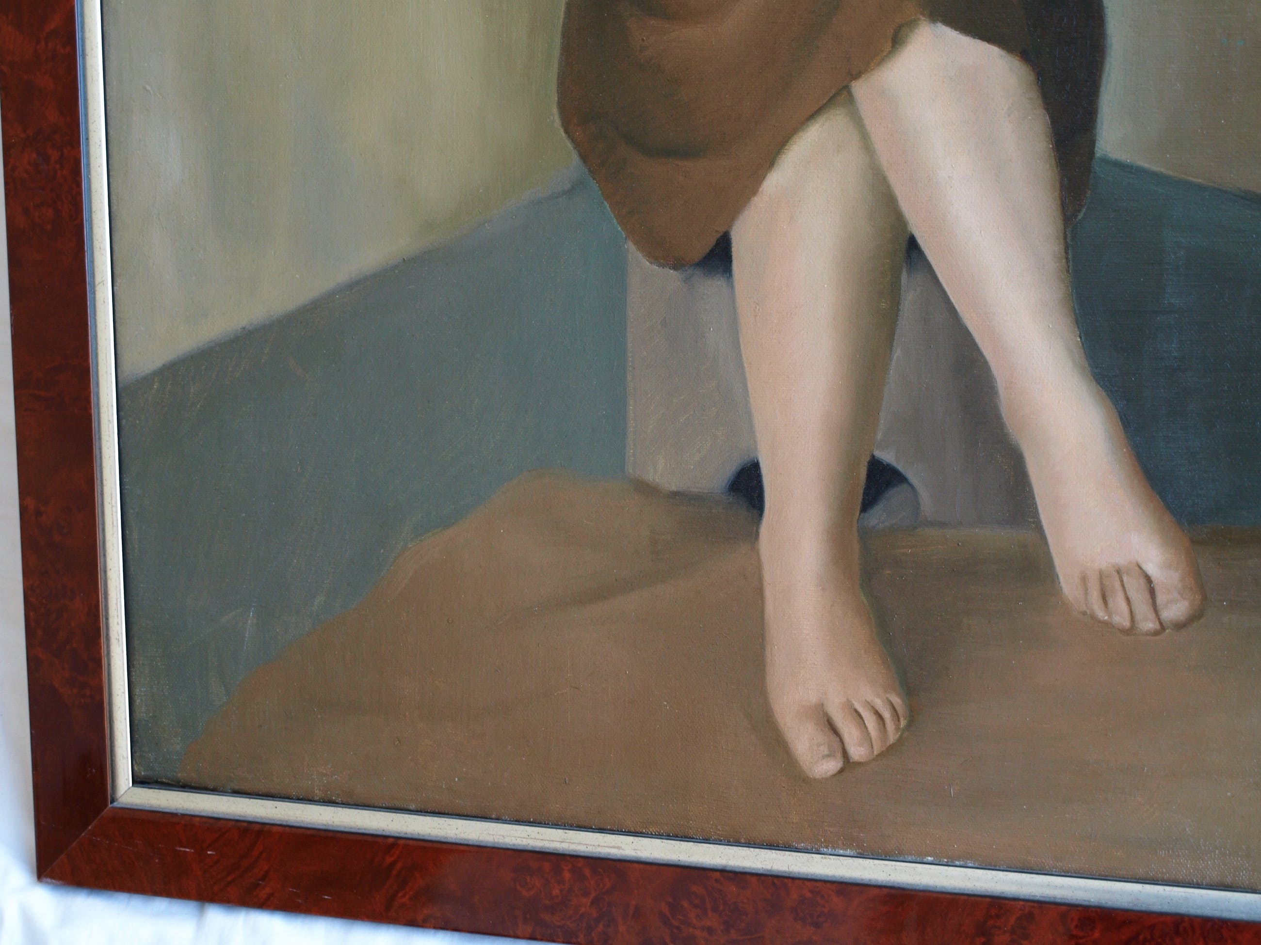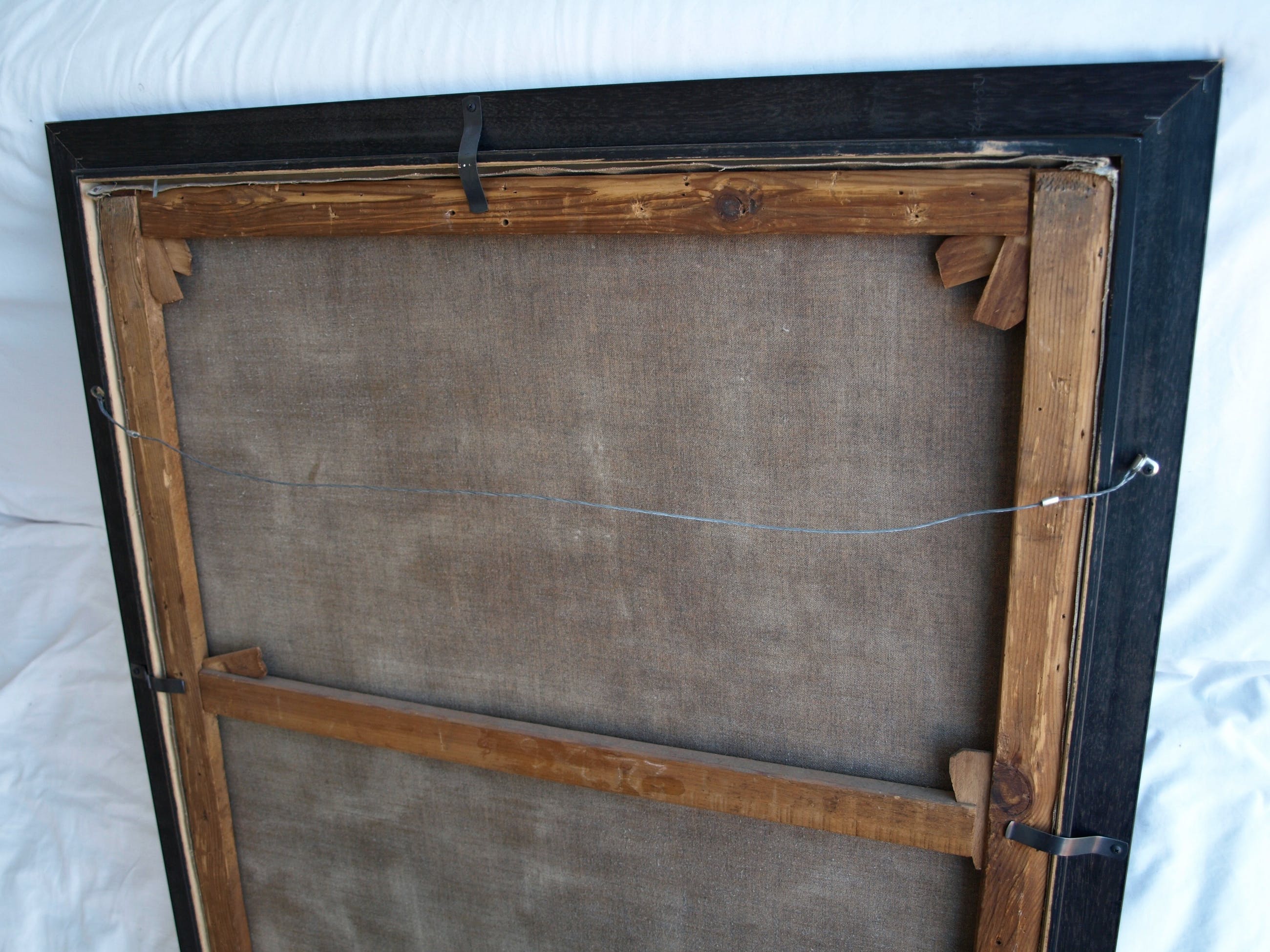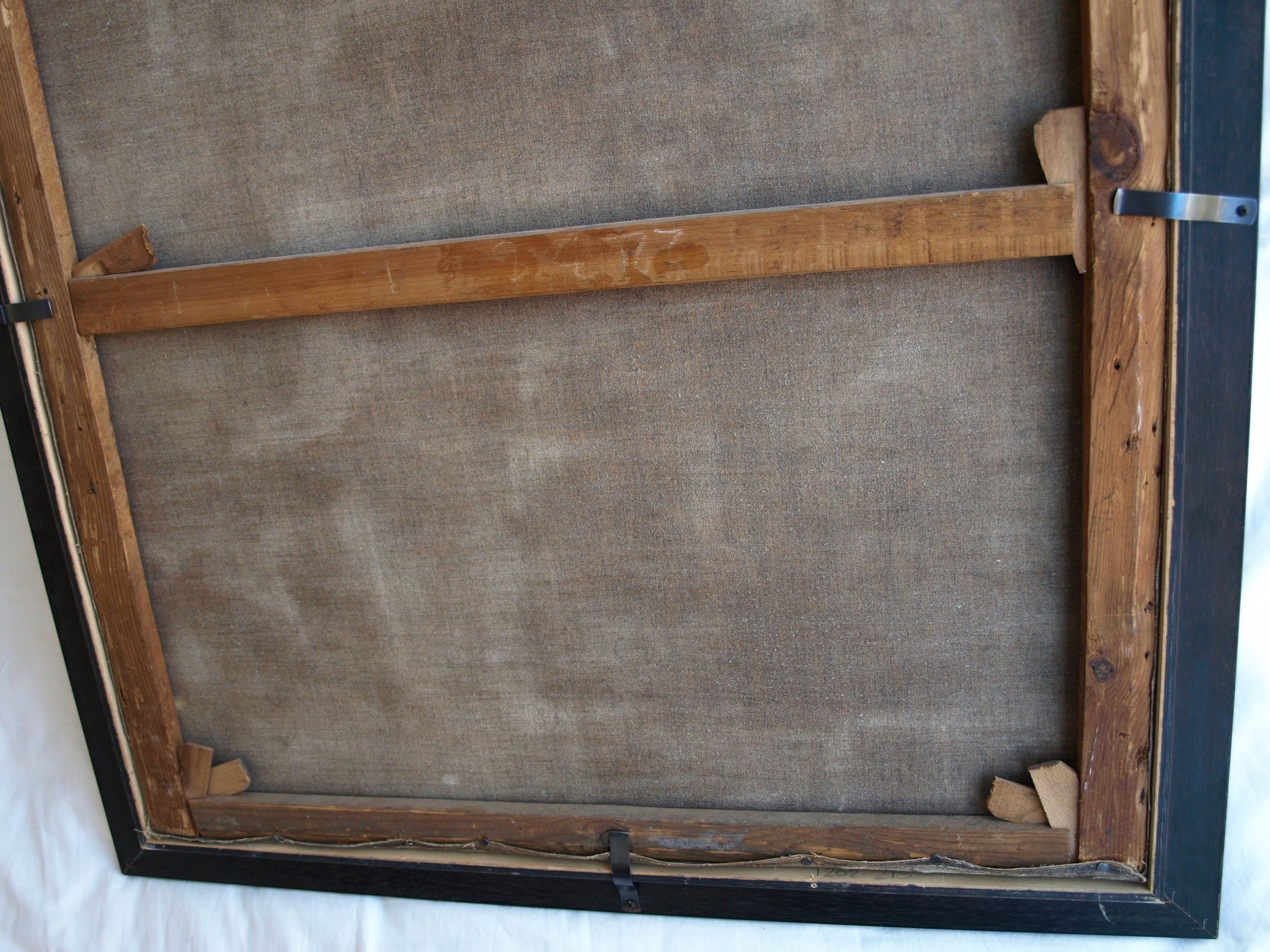 -Conditie: In goede staat. Het doek heeft slijtplekjes, m.n. aan de randen en de lijst sluit niet stipt aan aan het werk.