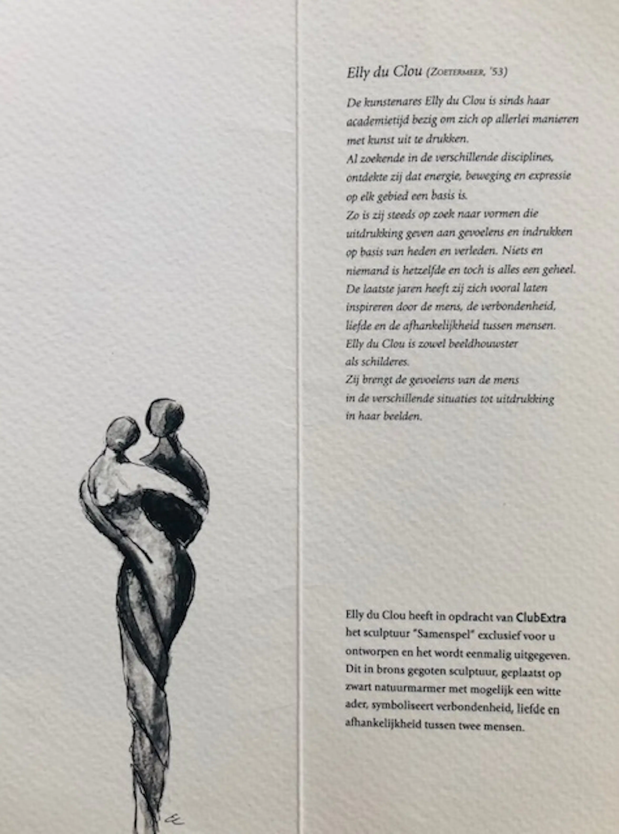 Prachtig beeld vervaardigd door Elly du Clou - Bruggeman. Titel Samenspel. Beeld is in uitstekende conditie en gemonteerd op hardstenen sokkel. Inclusief certificaat.