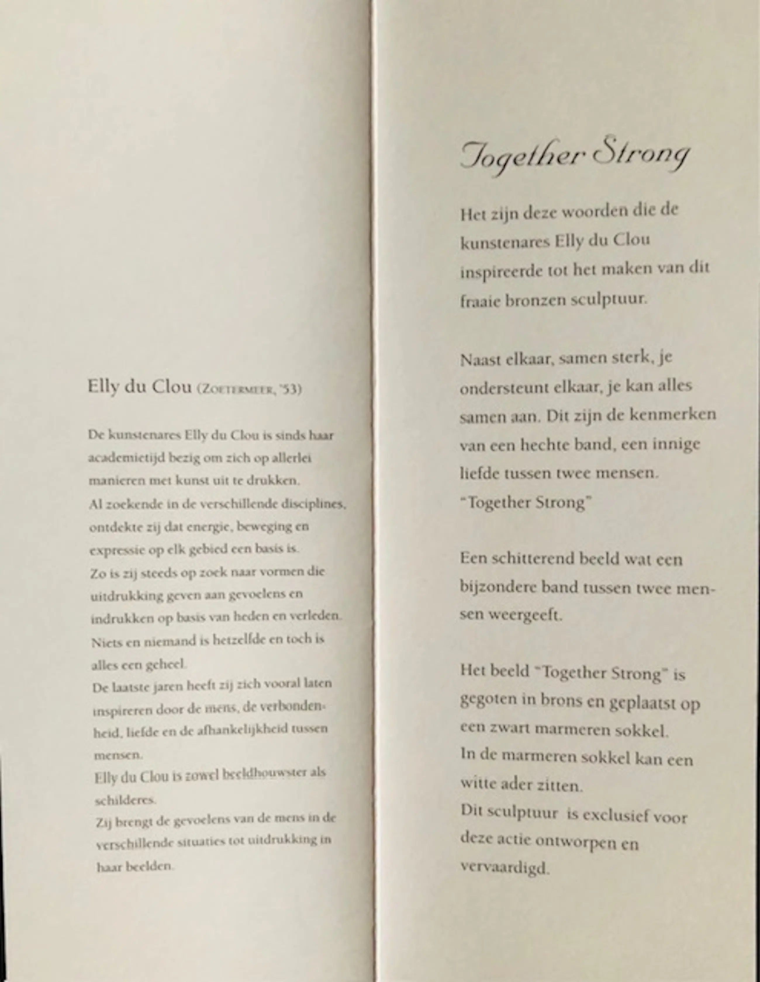 Het beeld Together Strong is gegoten in brons en geplaatst op een zwarte hardstenen sokkel. Het geheel is in een uitstekende staat. Inclusief certificaat.