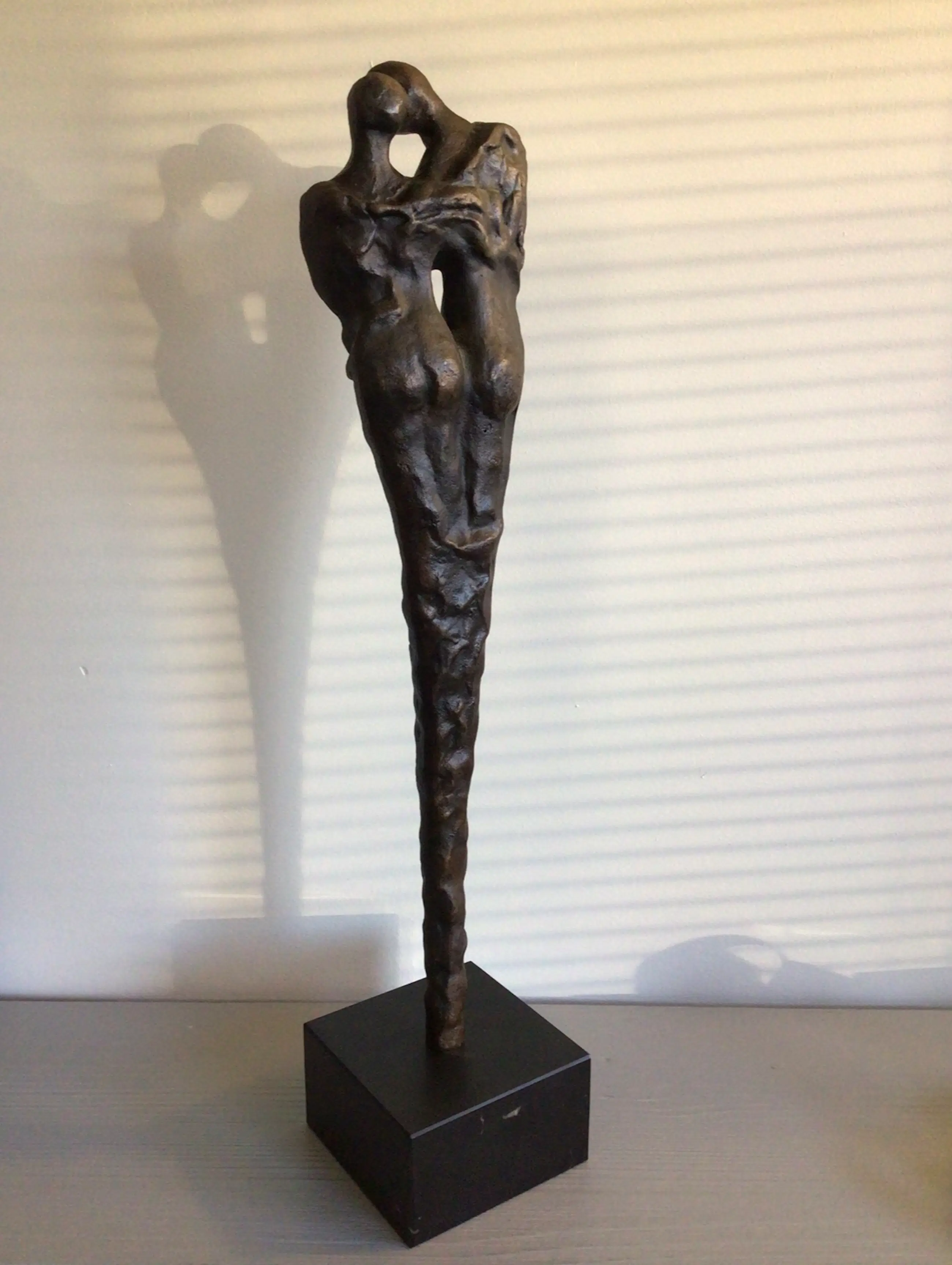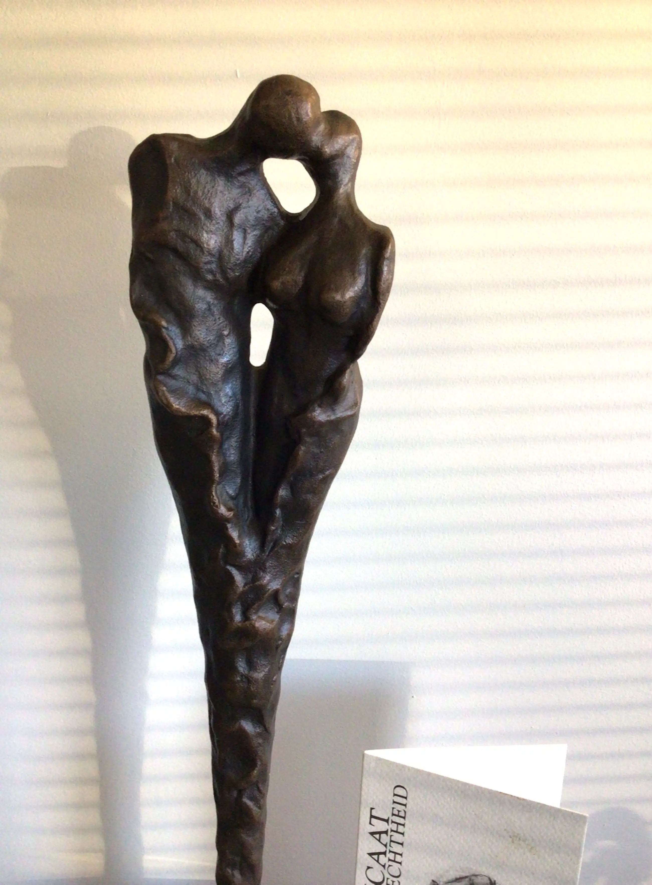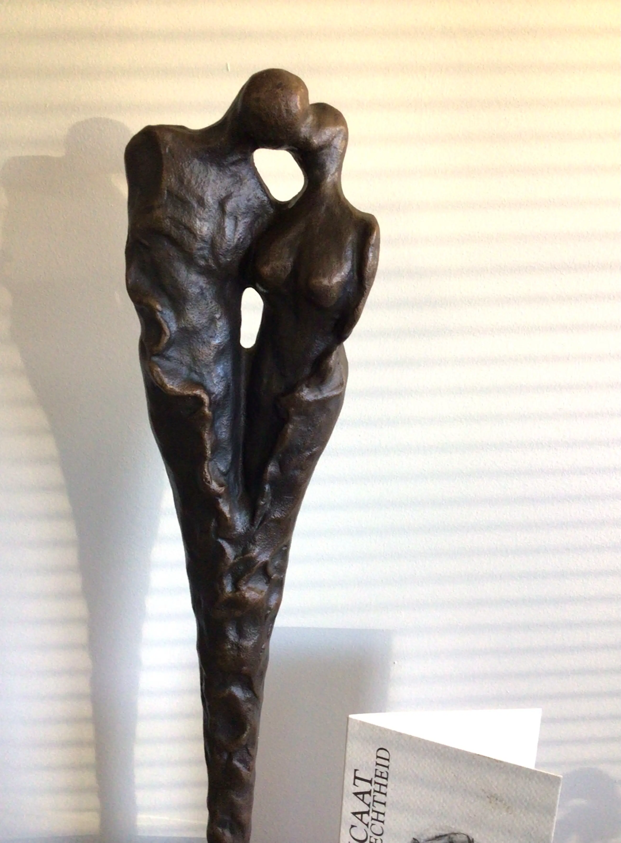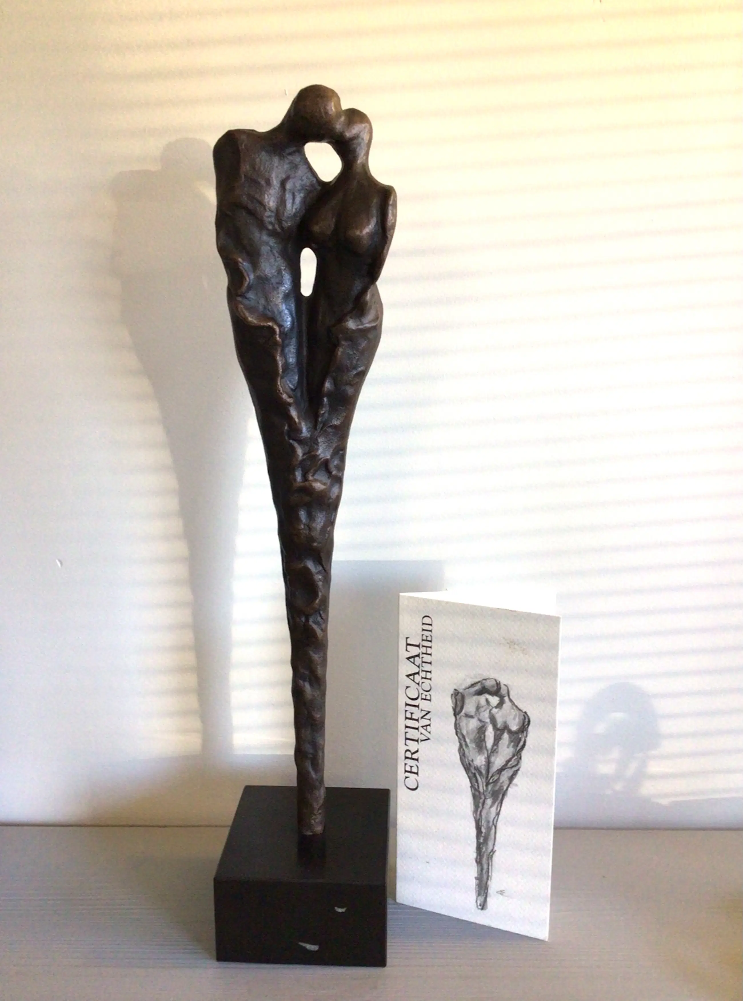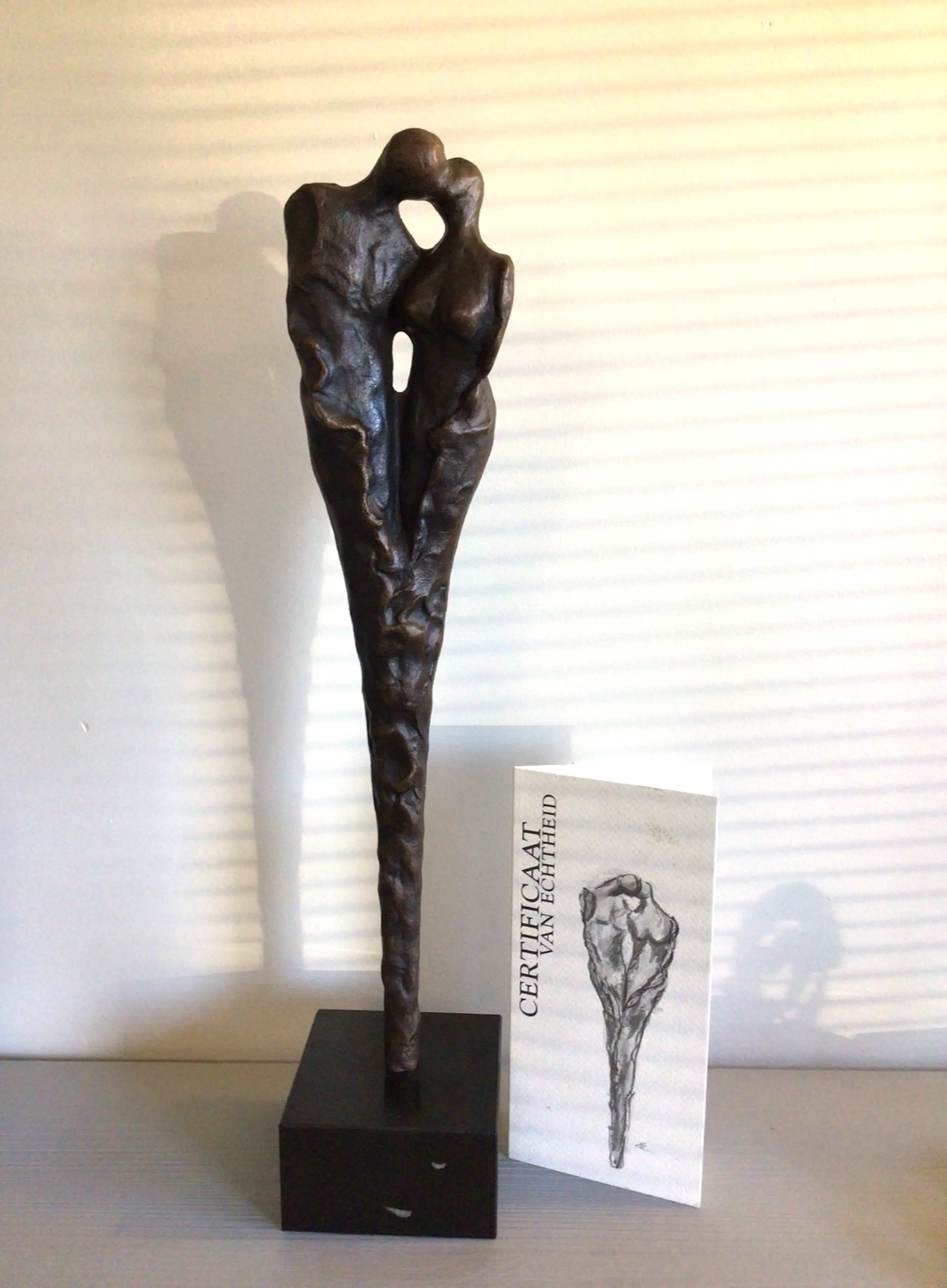 Zeer fraai , liefdevol en zeldzaam sculptuur van een liefdespaar staande in een intieme pose, ze zijn samen een. Titel “ Eeuwige liefde “ Achtergrondgedachte “ Dit beeld geeft een diepgewortelde liefde tussen twee mensen weer…” Kunstenares: Elly Du Clou Inclusief echtheidscertificaat met motivatie van de kunstenares Hoogte : 42 cm Materiaal: brons op fraaie zwart marmeren sokkel Het beeld verkeert in goede staat en wordt zorgvuldig verpakt verzonden