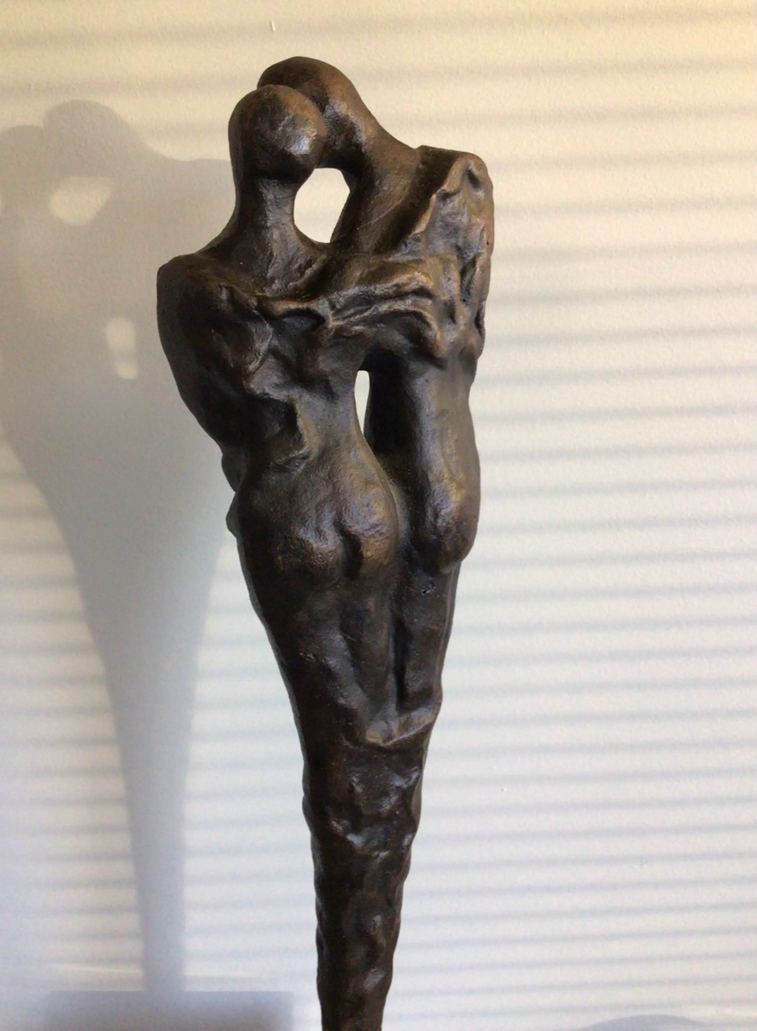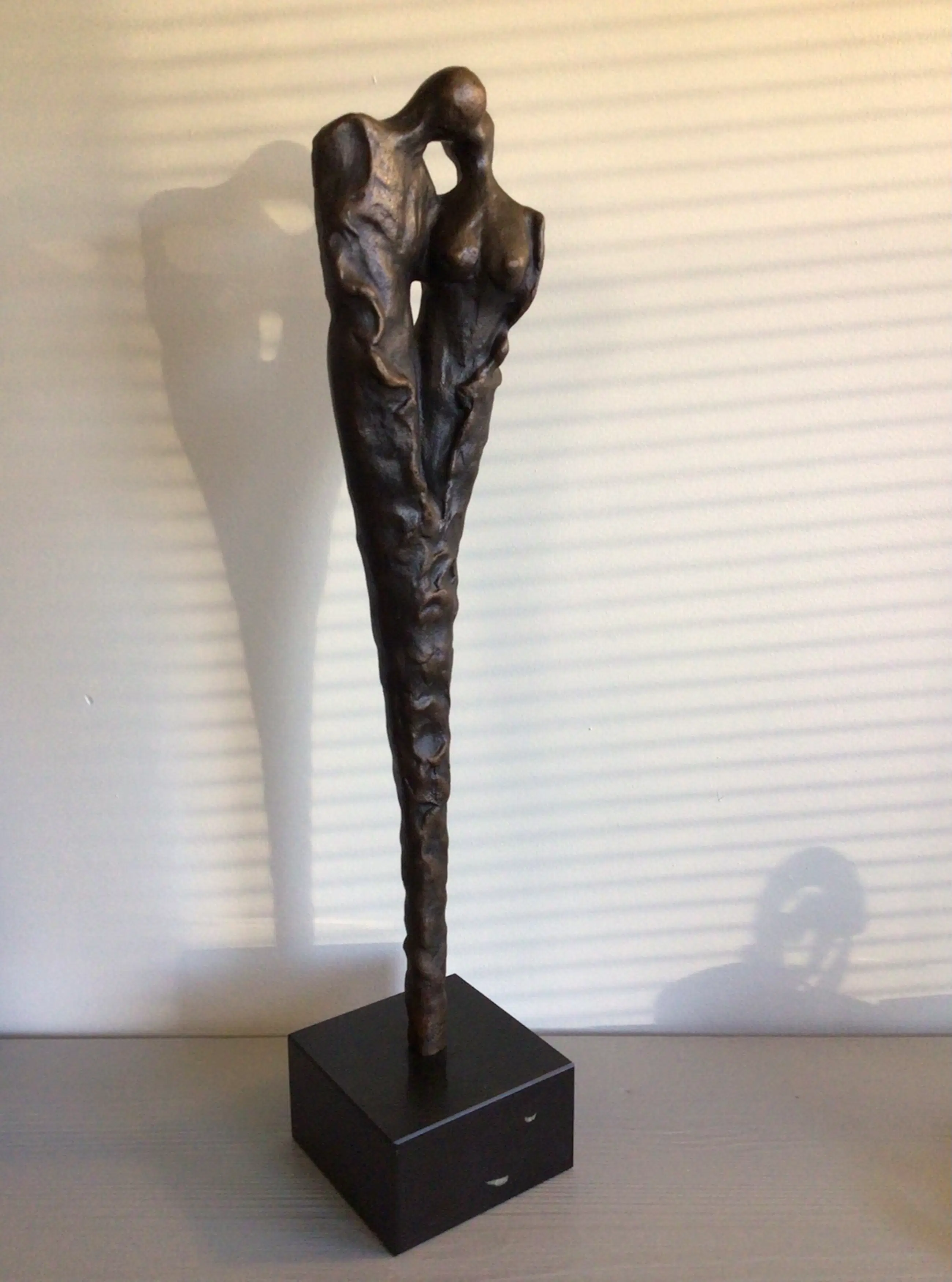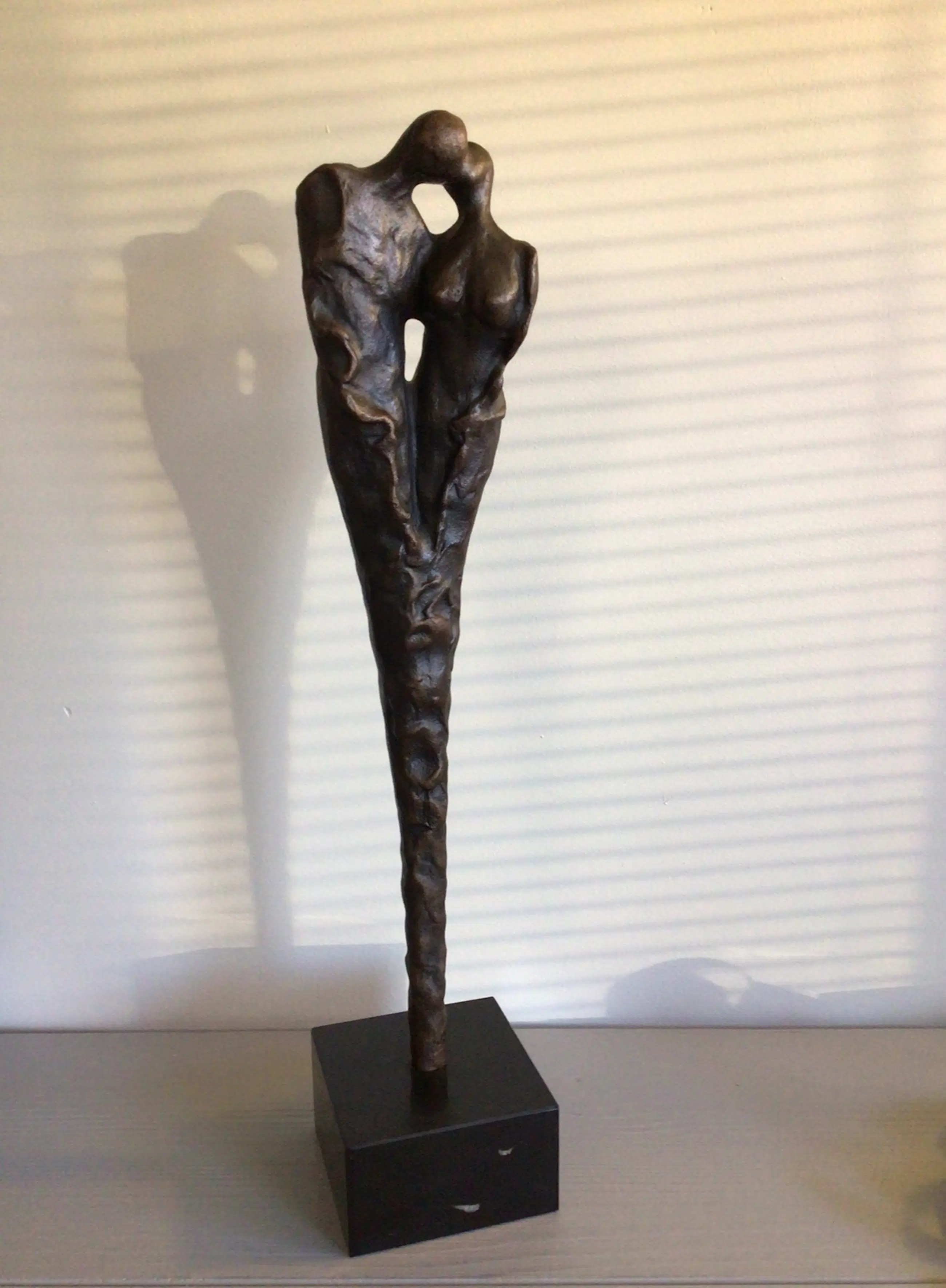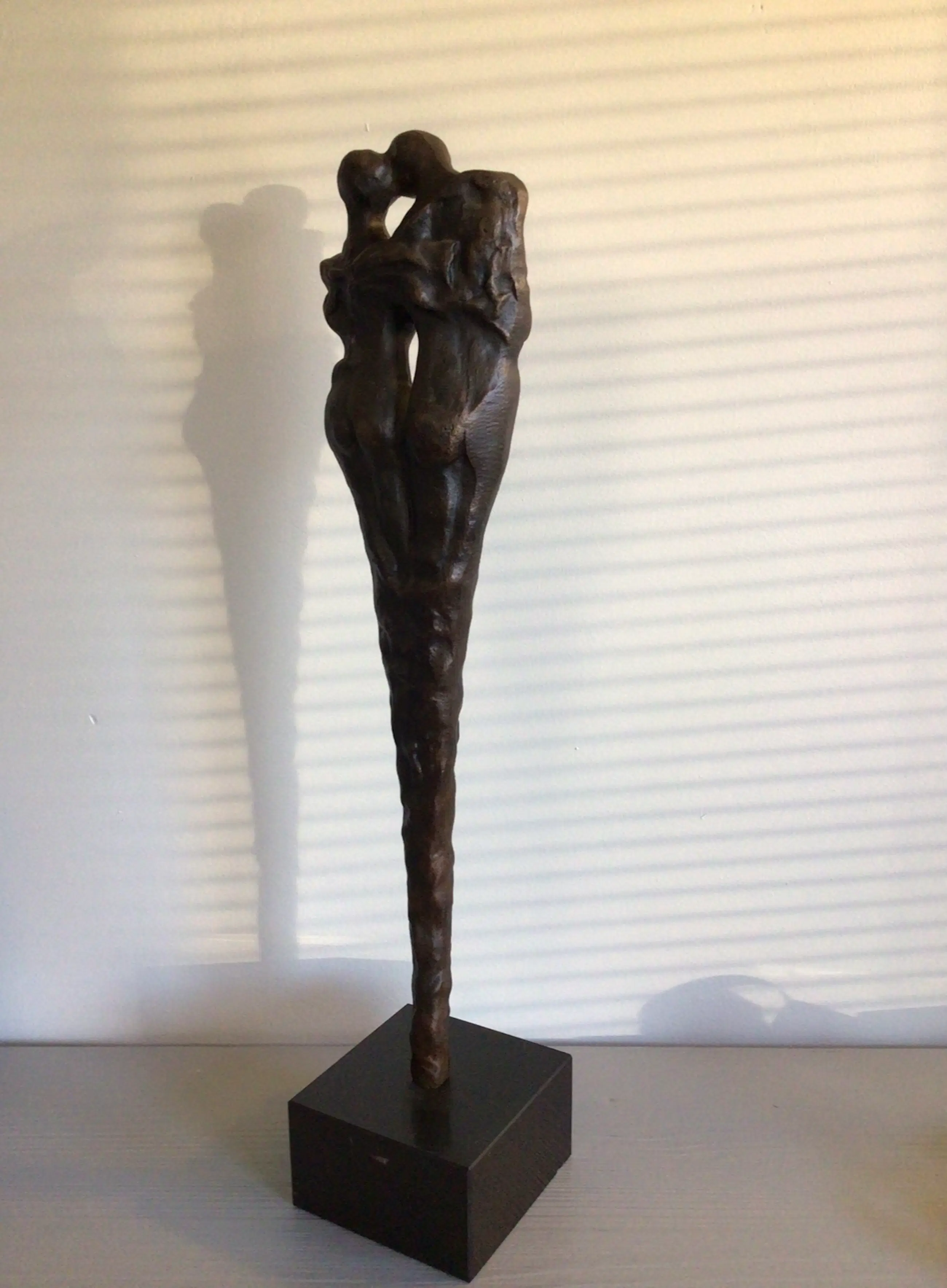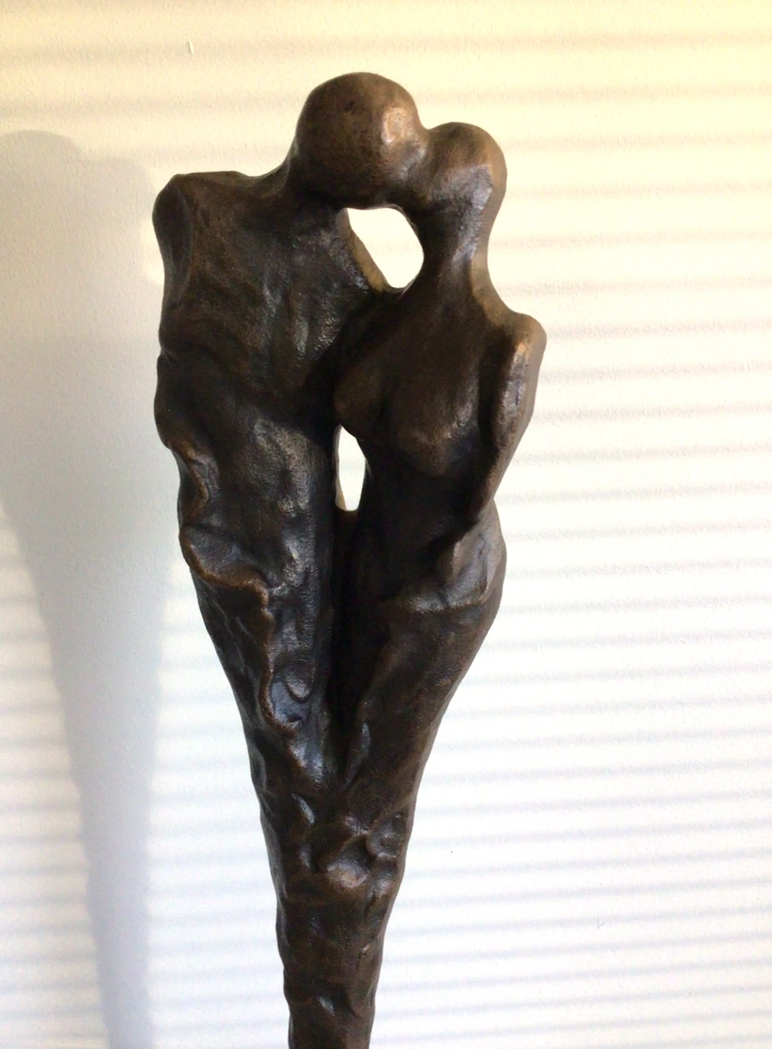Zeer fraai , liefdevol en zeldzaam sculptuur van een liefdespaar staande in een intieme pose, ze zijn samen een. Titel “ Eeuwige liefde “ Achtergrondgedachte “ Dit beeld geeft een diepgewortelde liefde tussen twee mensen weer…” Kunstenares: Elly Du Clou Inclusief echtheidscertificaat met motivatie van de kunstenares Hoogte : 42 cm Materiaal: brons op fraaie zwart marmeren sokkel Het beeld verkeert in goede staat en wordt zorgvuldig verpakt verzonden