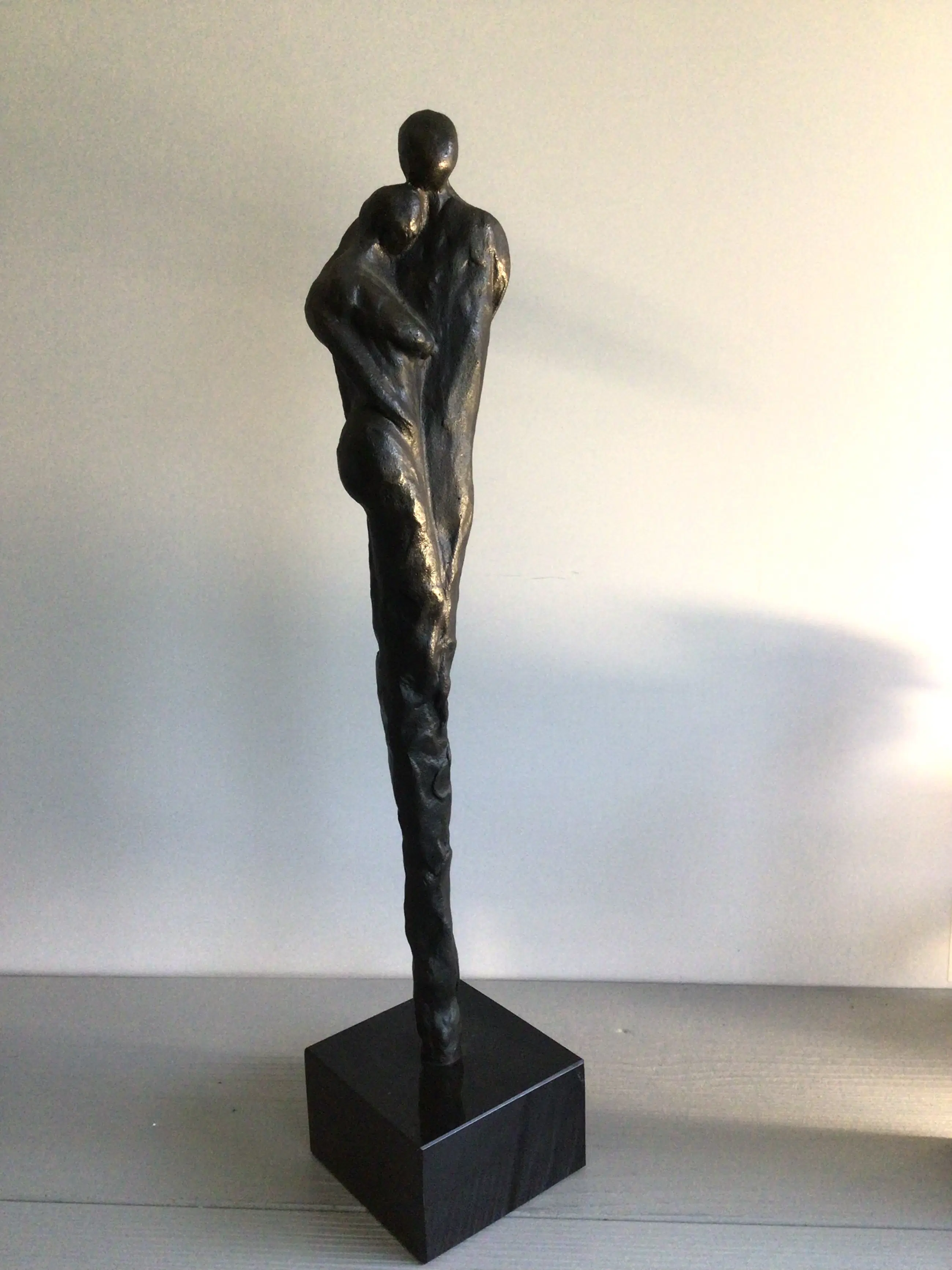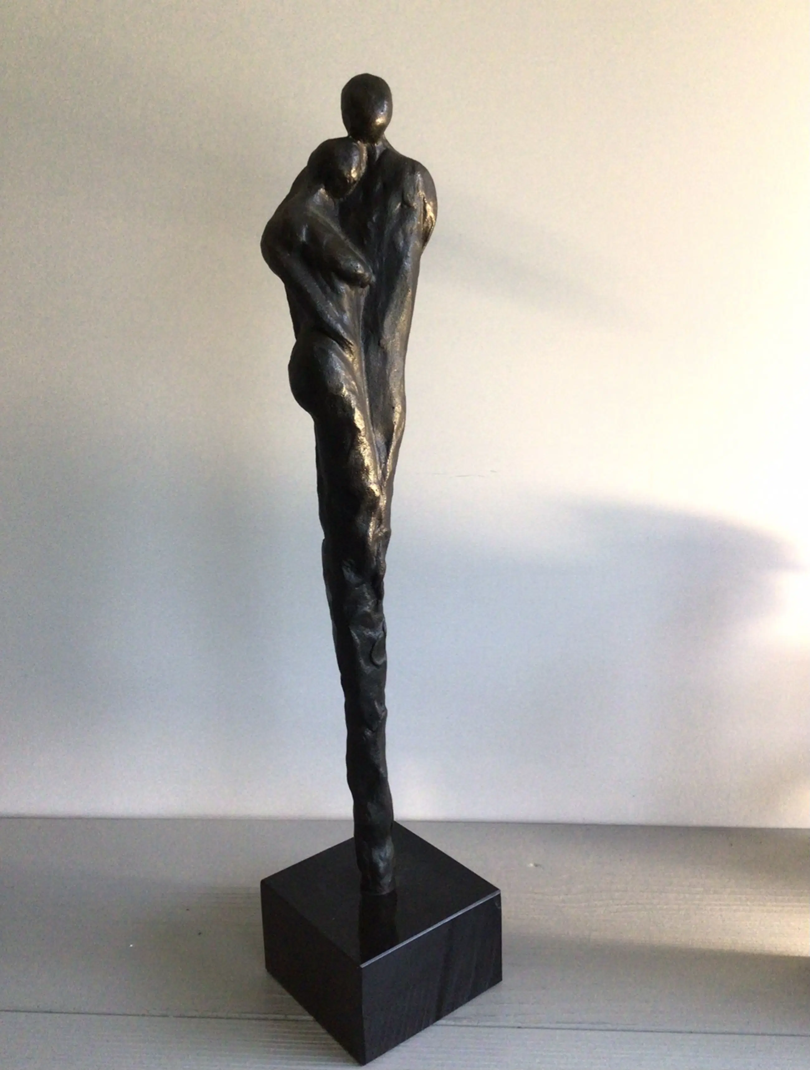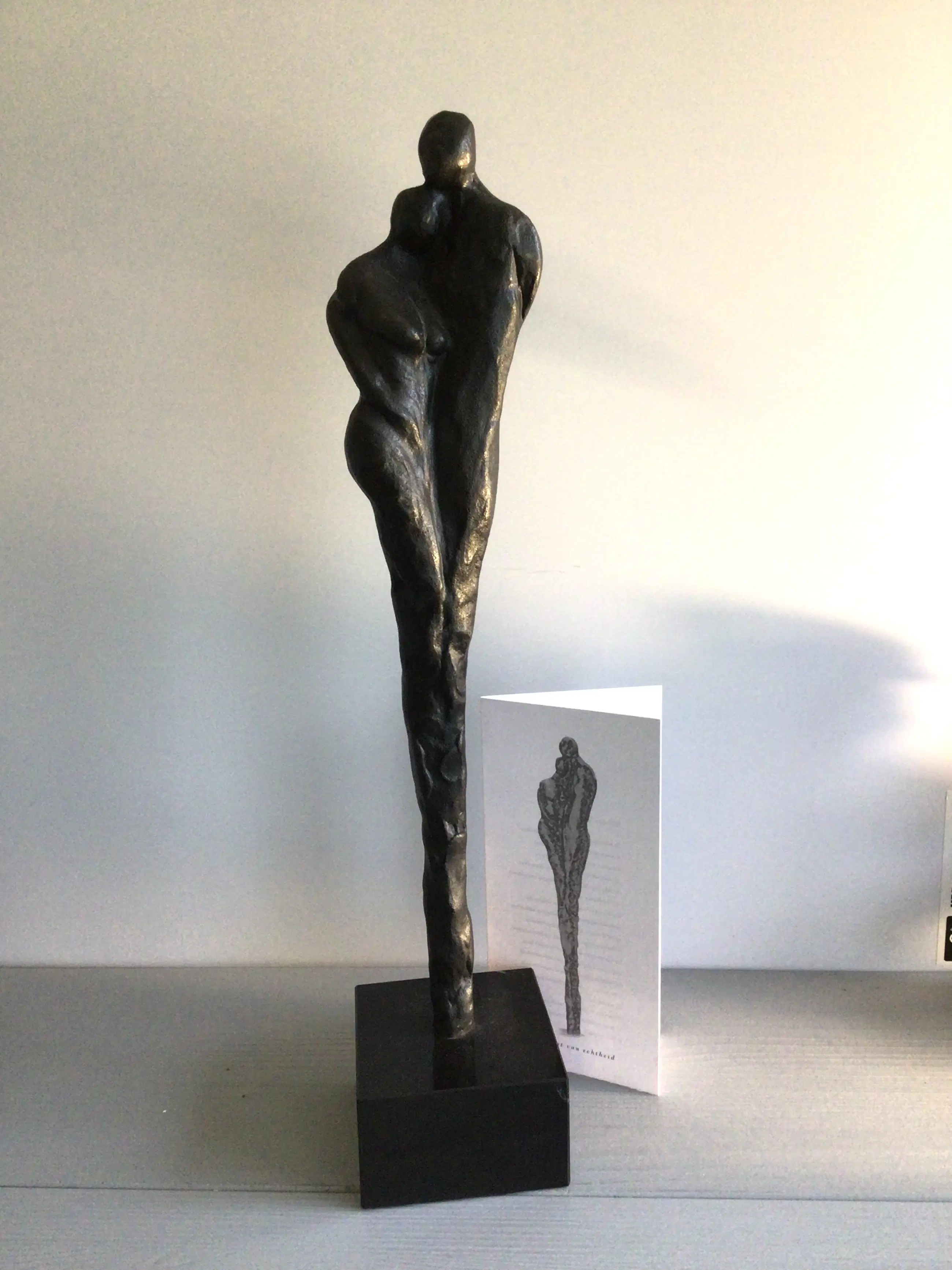 Zeer fraai , liefdevol en zeldzaam sculptuur van een liefdespaar staande in een intieme pose, ze zijn samen een. Titel “ Forever in love “ De liefdevolle omarming symboliseert de geborgenheid en liefde tussen twee mensen, aldus de kunstenares.. Kunstenares: Elly Du Clou Inclusief echtheidscertificaat . Hoogte : 40 cm Materiaal: brons op fraaie zwart marmeren sokkel Het beeld verkeert in zeer goede staat en wordt zorgvuldig verpakt verzonden