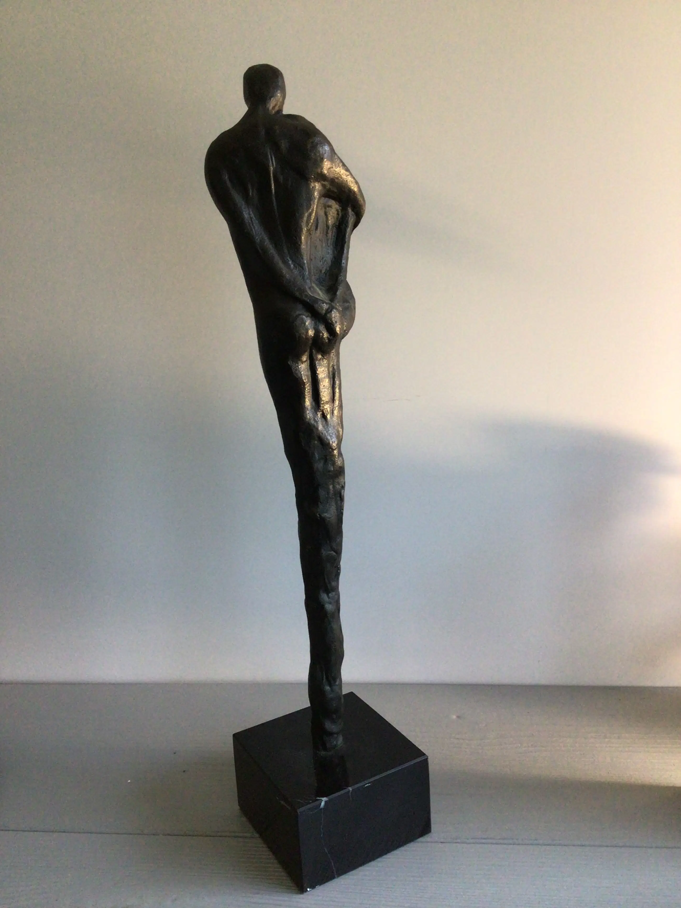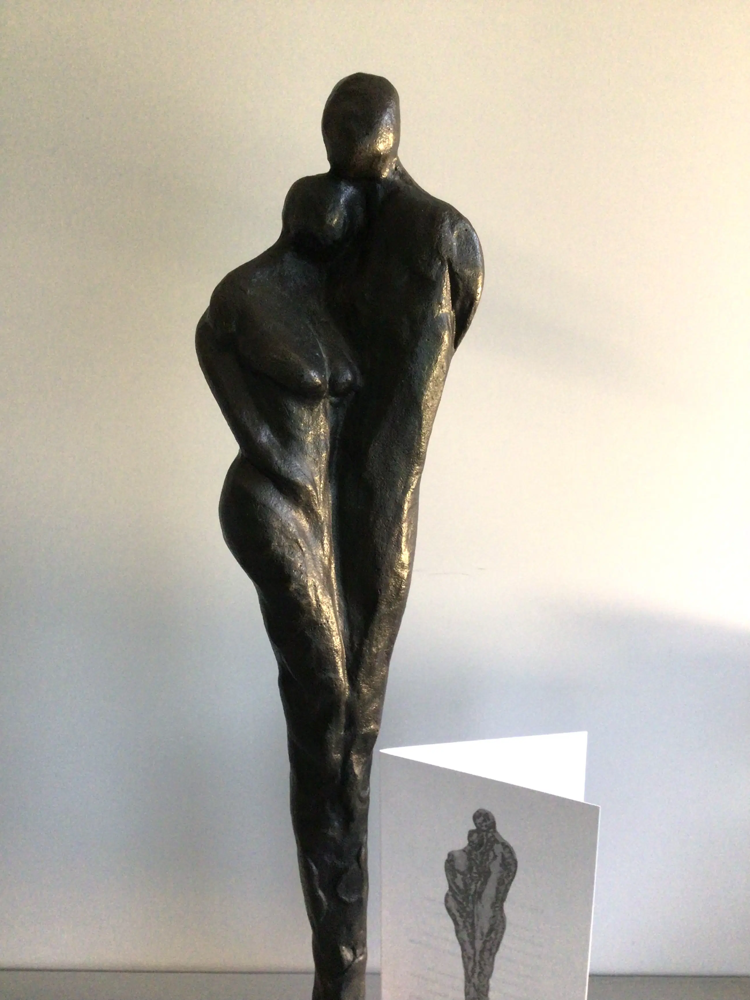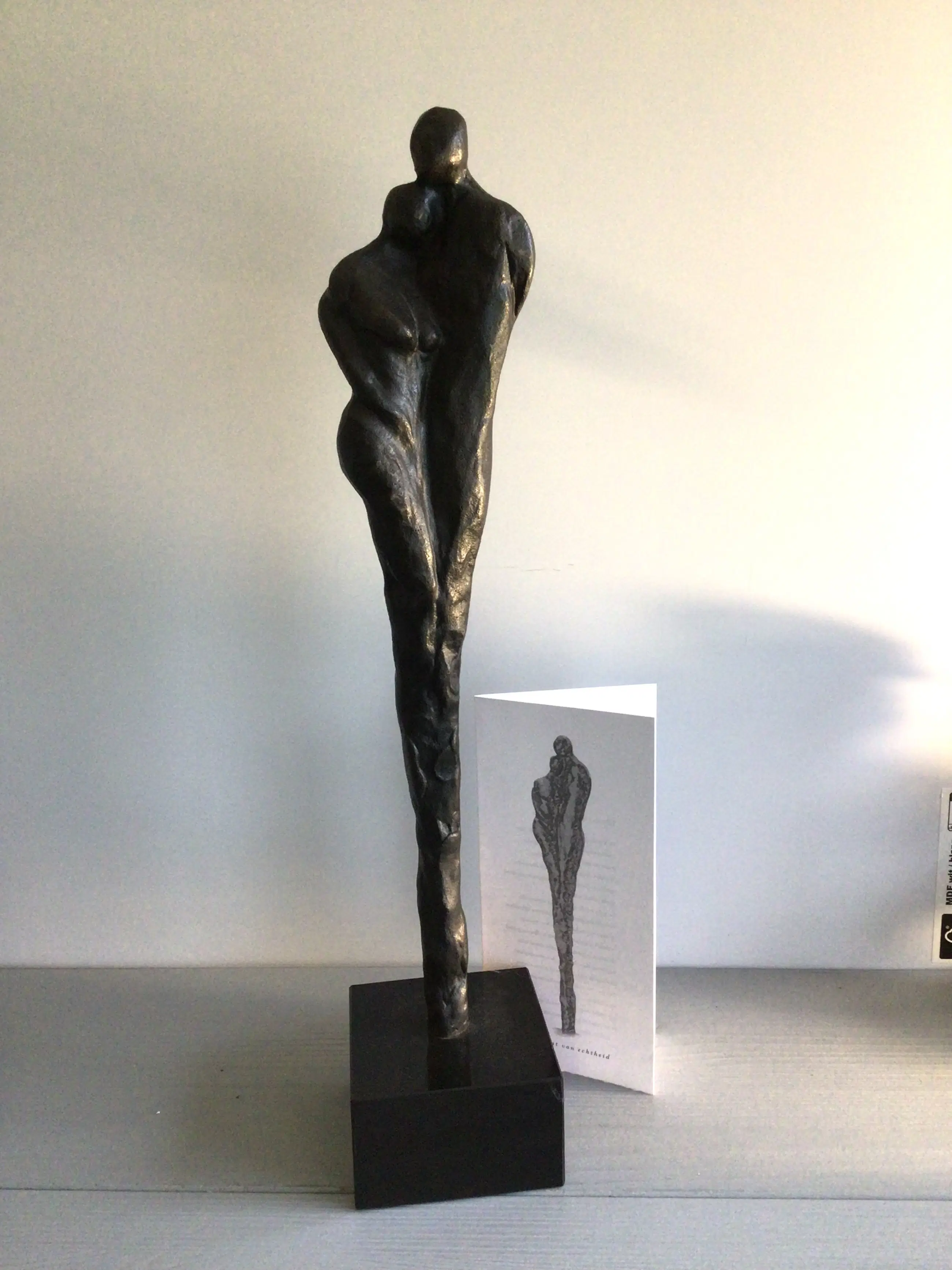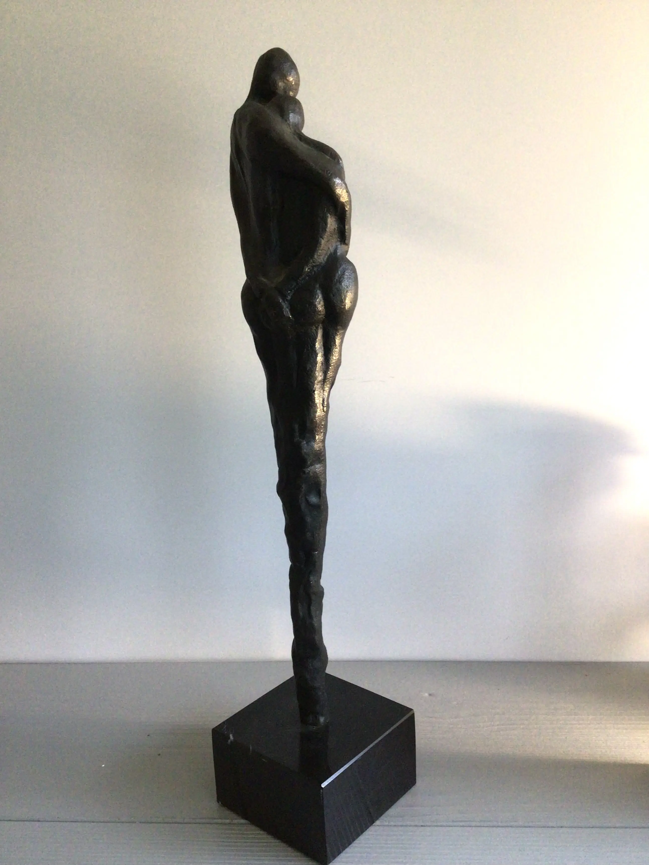 Zeer fraai , liefdevol en zeldzaam sculptuur van een liefdespaar staande in een intieme pose, ze zijn samen een. Titel “ Forever in love “ De liefdevolle omarming symboliseert de geborgenheid en liefde tussen twee mensen, aldus de kunstenares.. Kunstenares: Elly Du Clou Inclusief echtheidscertificaat . Hoogte : 40 cm Materiaal: brons op fraaie zwart marmeren sokkel Het beeld verkeert in zeer goede staat en wordt zorgvuldig verpakt verzonden