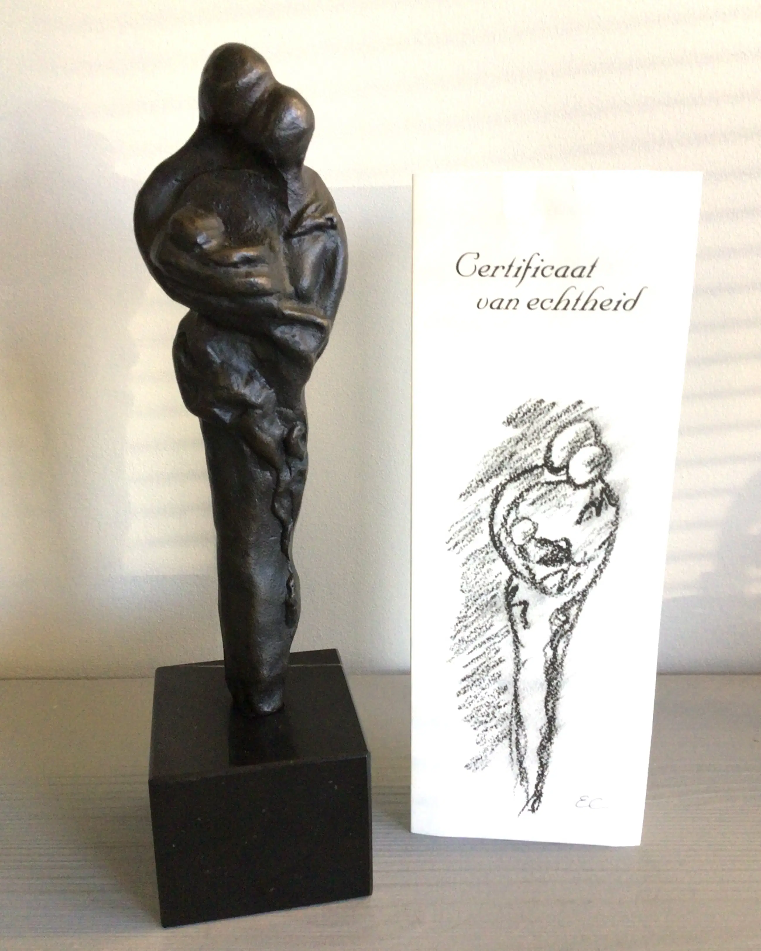 Zeer fraai , liefdevol sculptuur van een jong gezin , een vertederend tafereel… Achtergrondgedachte “ Pril geluk “ symboliseert de blijdschap, tederheid en het innige geluk wat vader en moeder voelen bij dit kind “ Aldus de kunstenares. Wordt geleverd inclusief echtheidscertificaat. Kunstenares: Elly Du Clou Materiaal: brons op fraaie zwart marmeren sokkel. Het beeld verkeert in zeer goede staat en wordt zorgvuldig verpakt verzonden