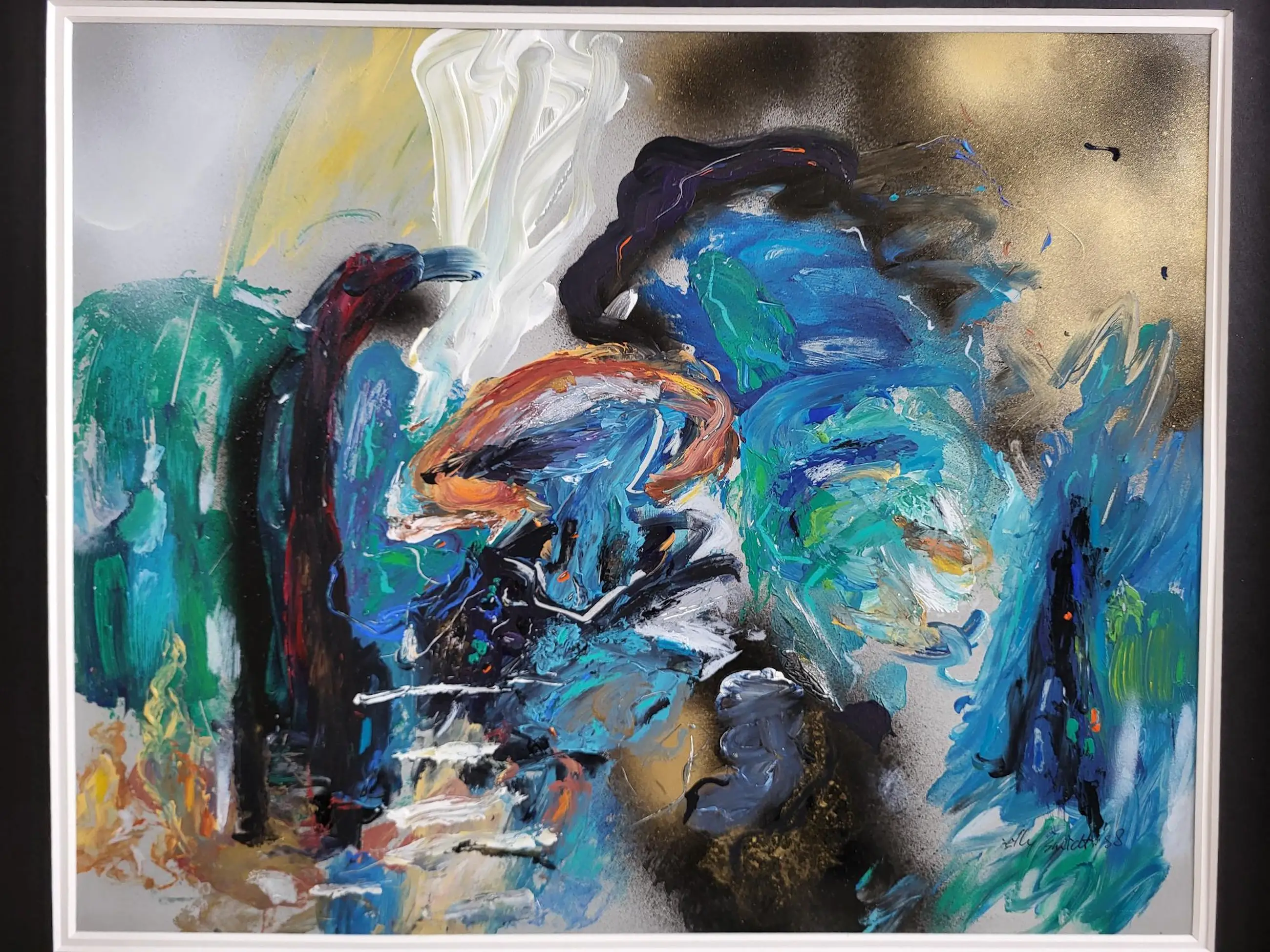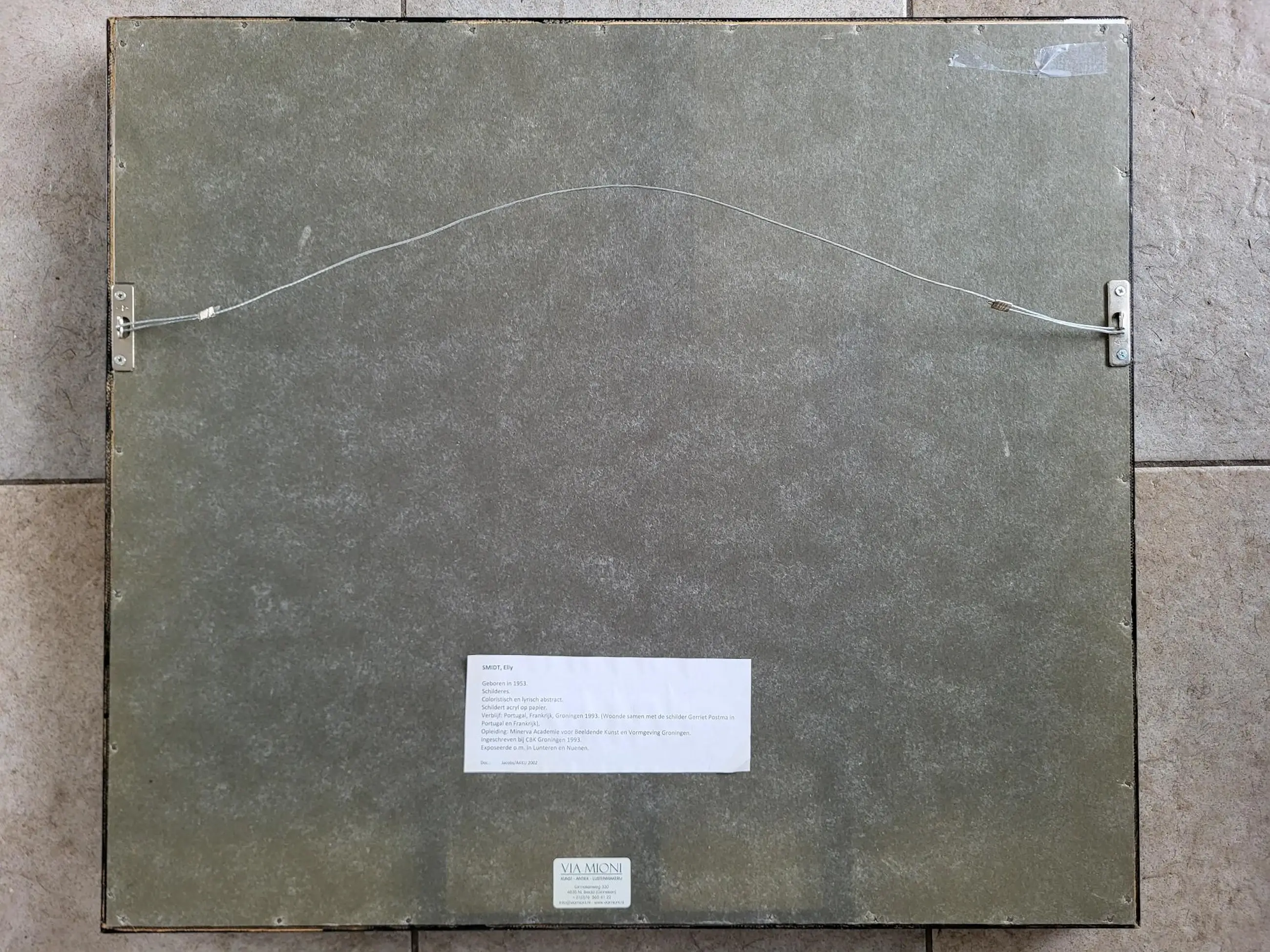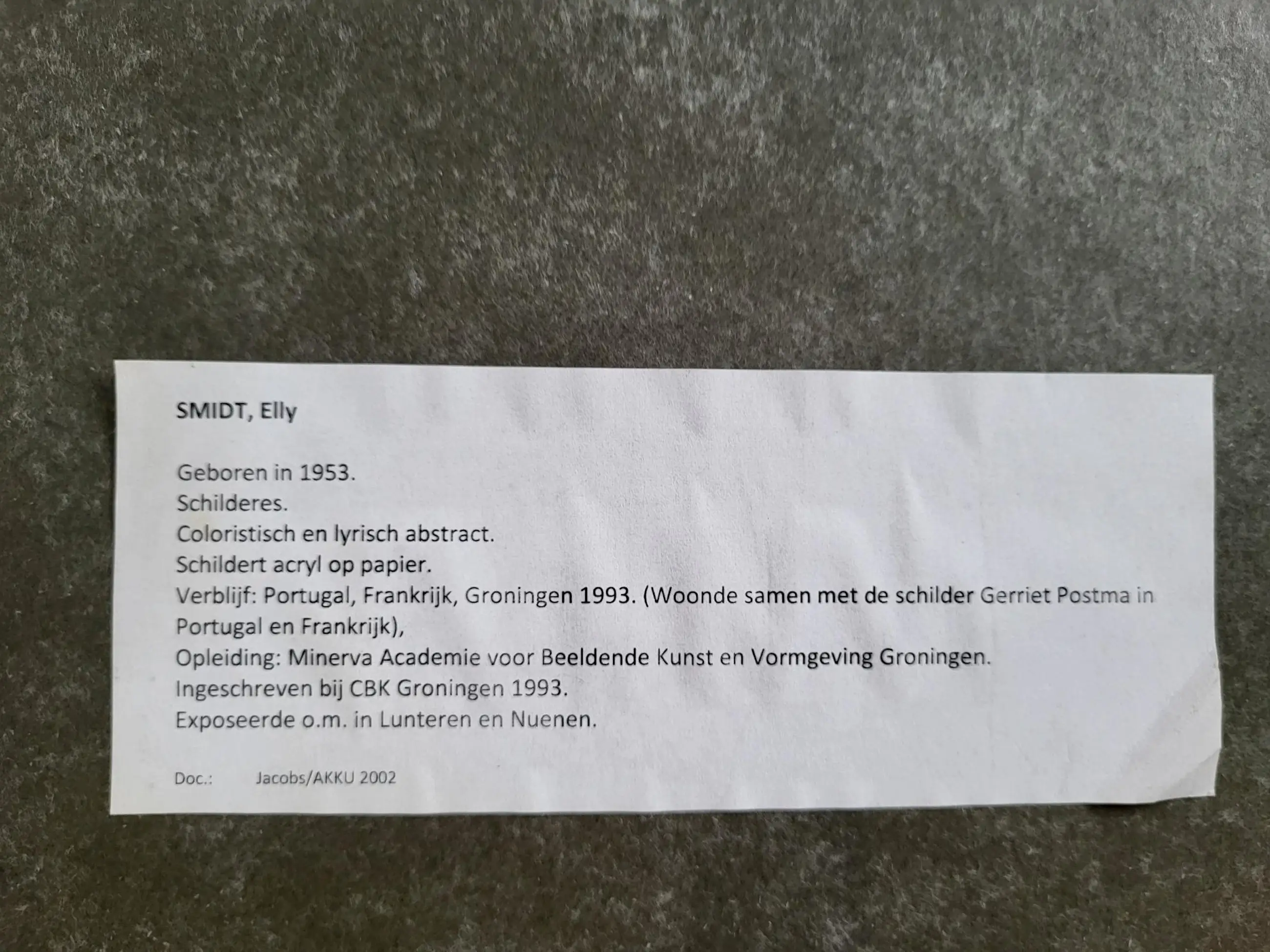 Elly Smidt is geboren in 1953. Ze woonde en werkte tot 1993 in Groningen. Daarna verbleef ze in Frankrijk en Portugal waar ze samenwoonde en werkte met Gerriet Postma. Die samenwerking is terug te zien in haar werken. Ze volgde haar opleiding aan de Minerva academie voor beeldende kunst en vormgeving in Groningen. Ze heeft in Nederland meerdere exposities gehad. Onder andere in Lunteren en Nuenen. Dit werk is zeer fraai ingelijst.