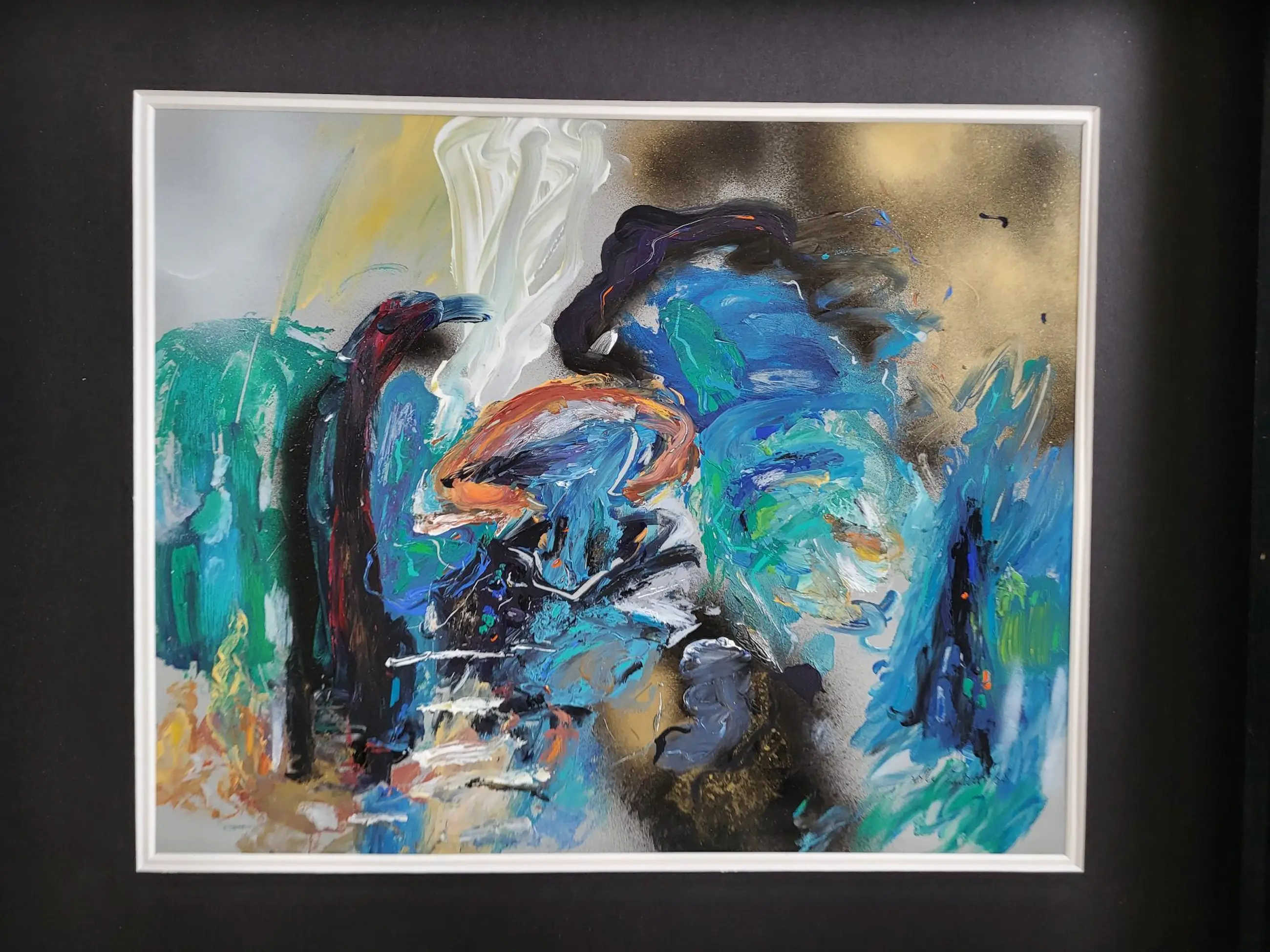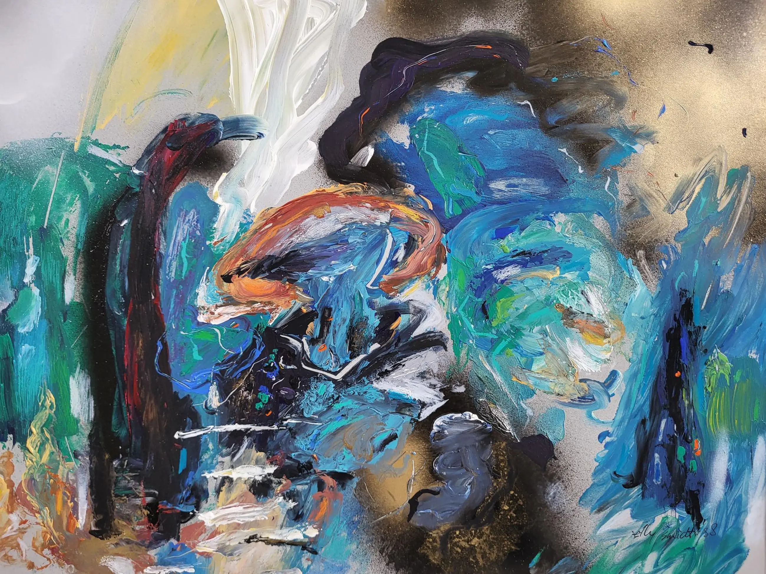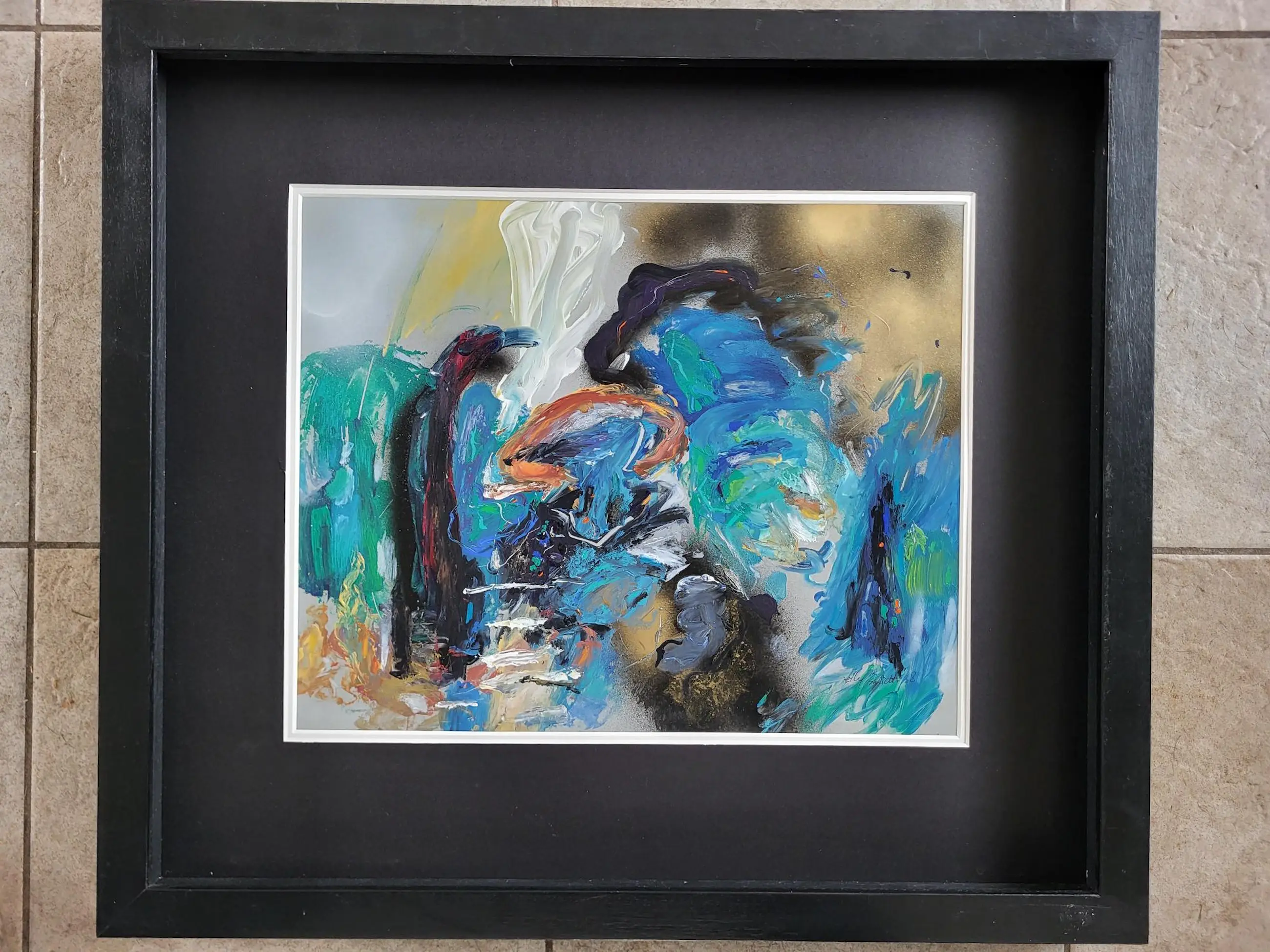 Elly Smidt is geboren in 1953. Ze woonde en werkte tot 1993 in Groningen. Daarna verbleef ze in Frankrijk en Portugal waar ze samenwoonde en werkte met Gerriet Postma. Die samenwerking is terug te zien in haar werken. Ze volgde haar opleiding aan de Minerva academie voor beeldende kunst en vormgeving in Groningen. Ze heeft in Nederland meerdere exposities gehad. Onder andere in Lunteren en Nuenen. Dit werk is zeer fraai ingelijst.