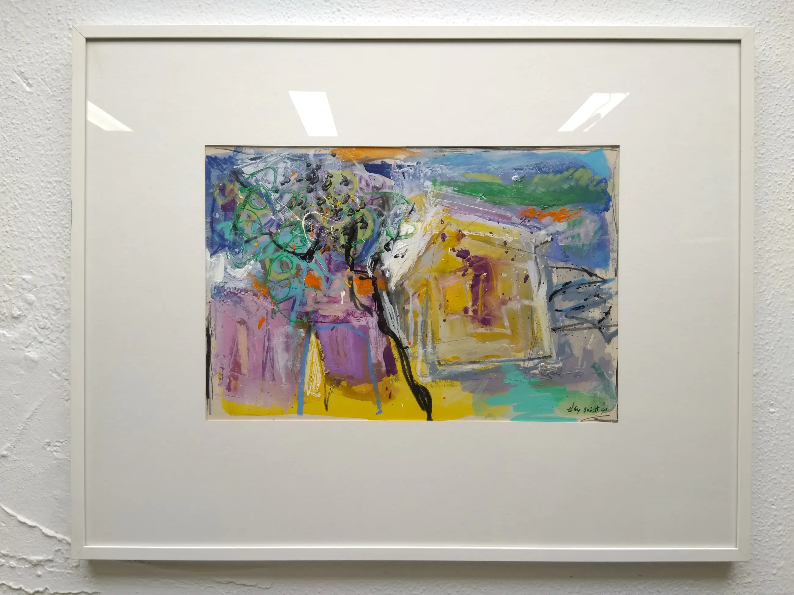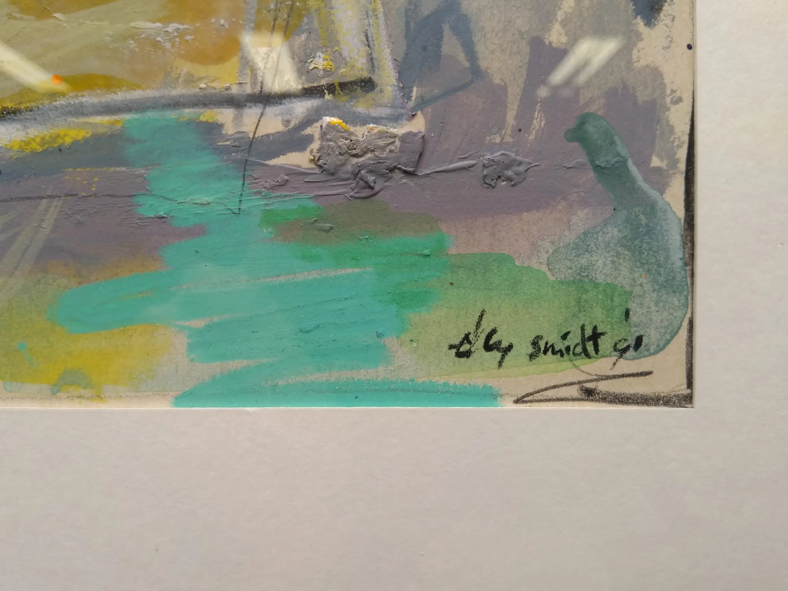 ''Elly Smidt volgde haar opleiding aan de Academie voor Beeldende Kunsten ‘Minerva’ in Groningen. Haar werk vormt een pleidooi voor de poëzie van het abstracte. De abstractie heeft in zichzelf al het scheppen van nieuwe, niet bestaande werelden. En daarin zijn de belevingen van deze kunstenares wel heel bijzonder. Door middel van verf en collage (papier en stof) ontstaan ‘geschilderde gedichten’, die uitnodigen tot een dromend filosoferen.'' (Bron: Kunsthandel Art du Nord)