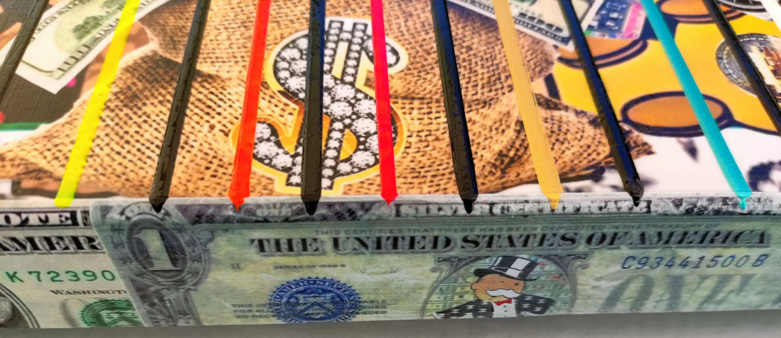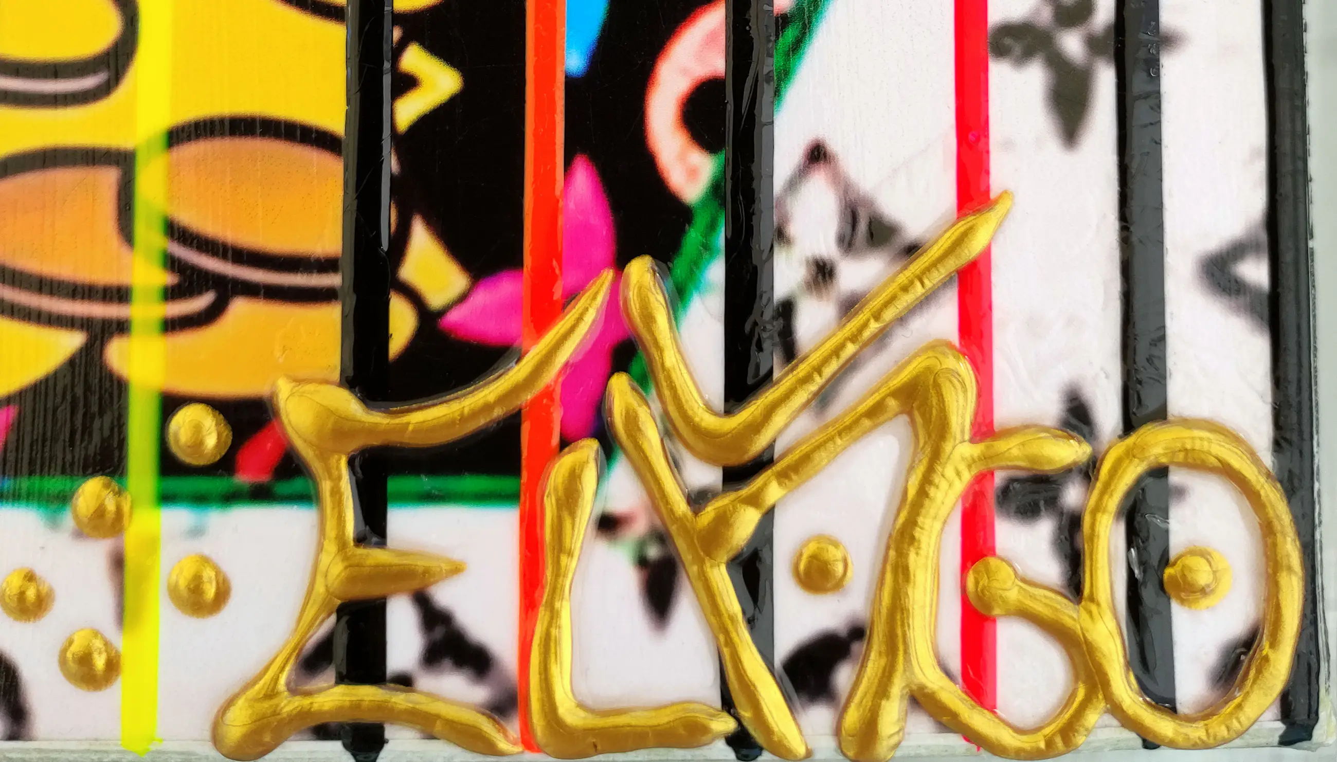 De afbeelding is een print op canvas, die de kunstenaar met acrylverf heeft bewerkt met extra details. Door het individuele ontwerp met ELMAGO's kenmerkende reliëflijnen in acryl is elk stuk uniek en eenmalig.