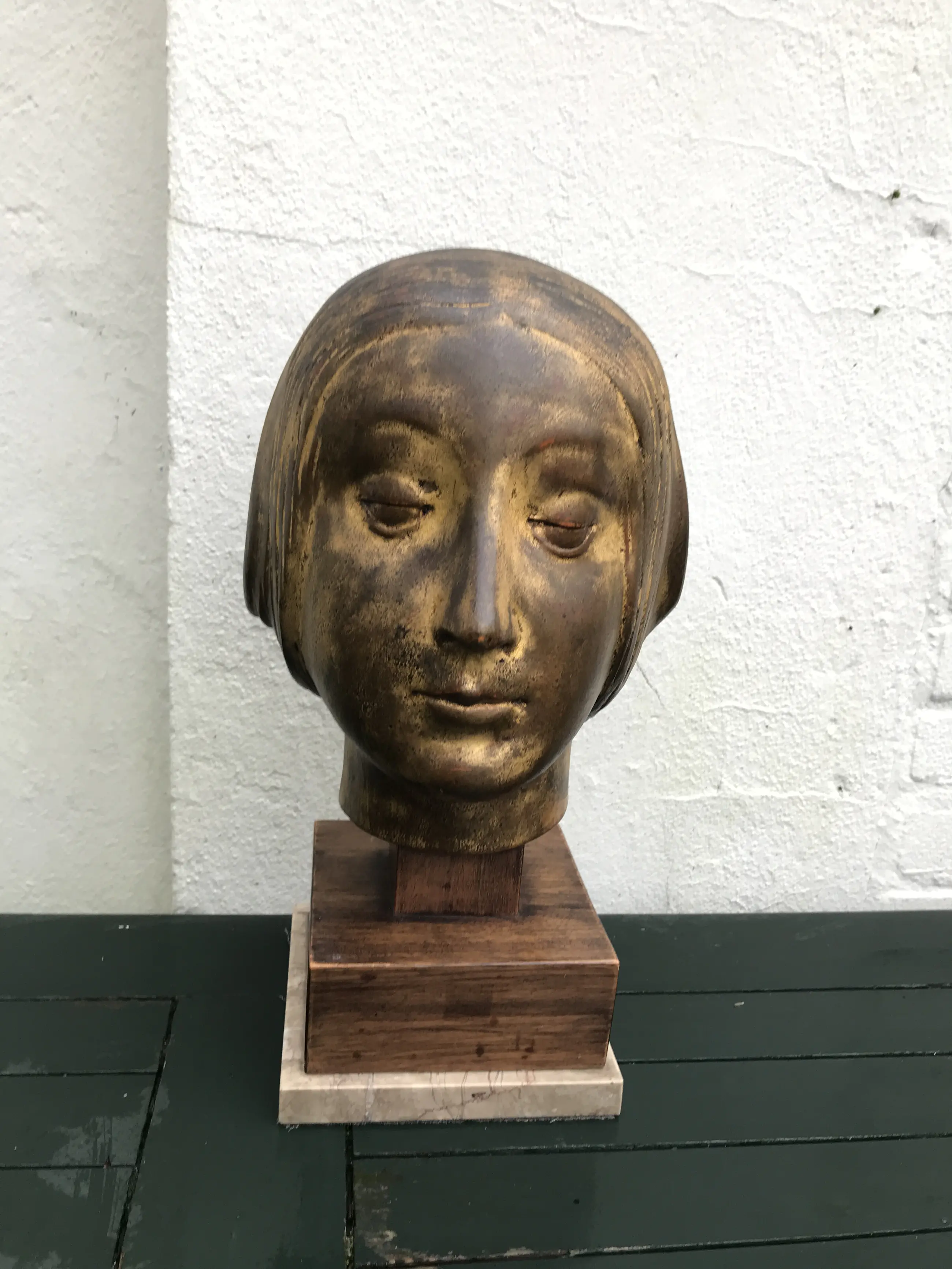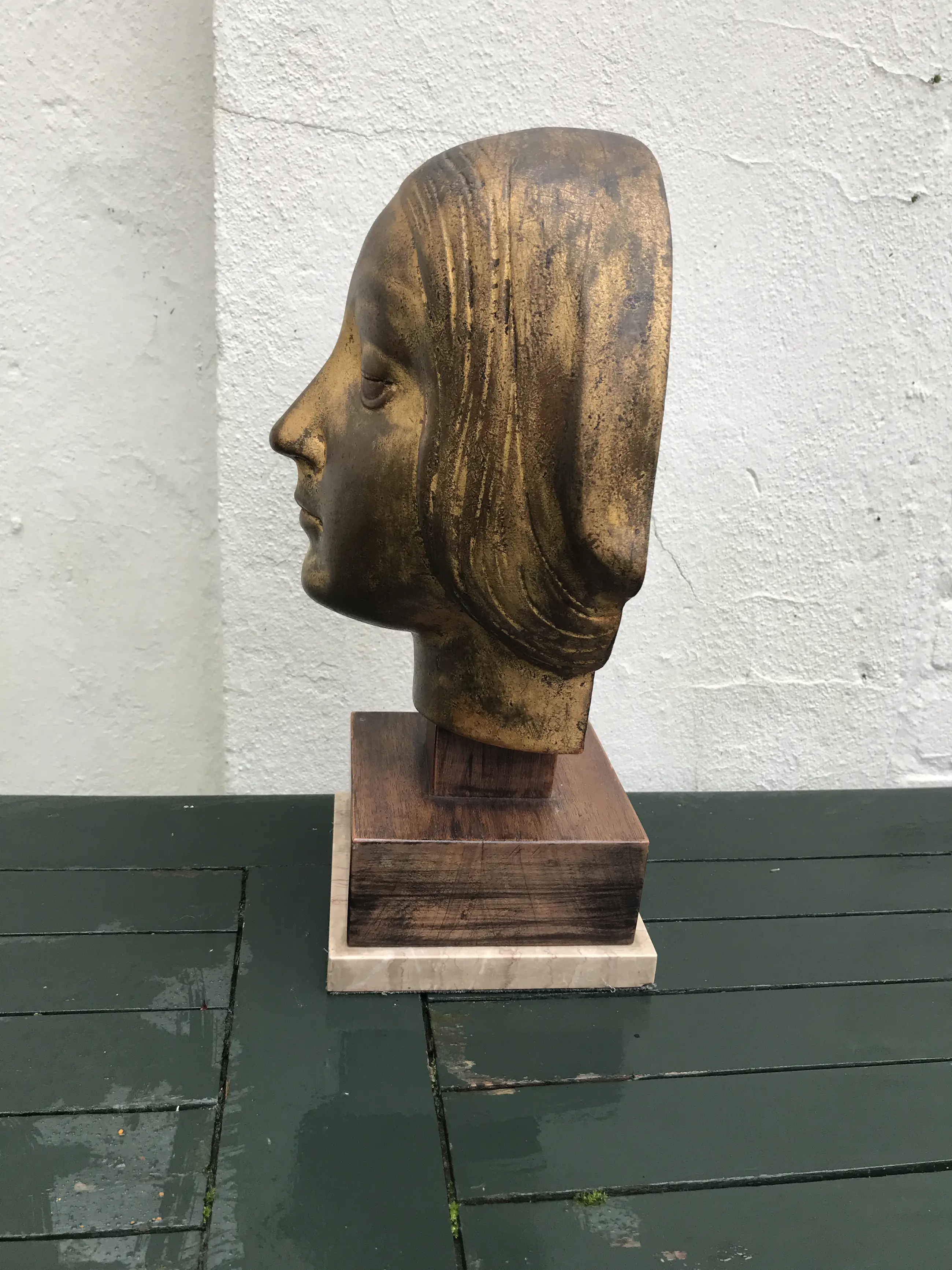 Prachtige art deco sculptuur van een vrouwenhoofd . Gesigneerd aan achterzijde E Dietz. Elmar Dietz geboren 1902 in Jesserndorf duitsland gestorven 1996 Munchen.. Beeld is 25 cm hoog en 20 cm breed, totale hoogte 37 cm