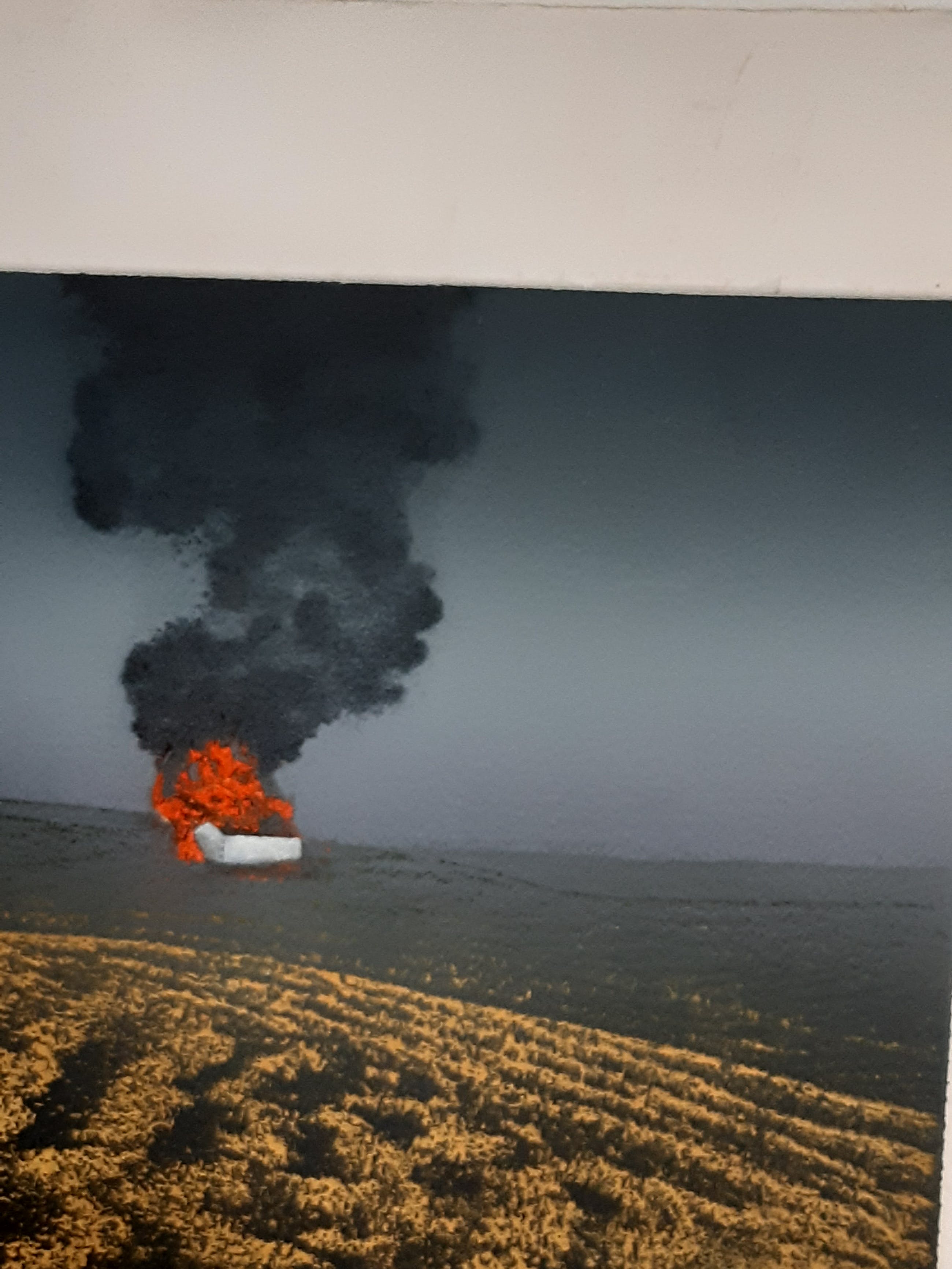Prachtig landschap in blauwen en roestkleuren. In de verte brandt een huisje.