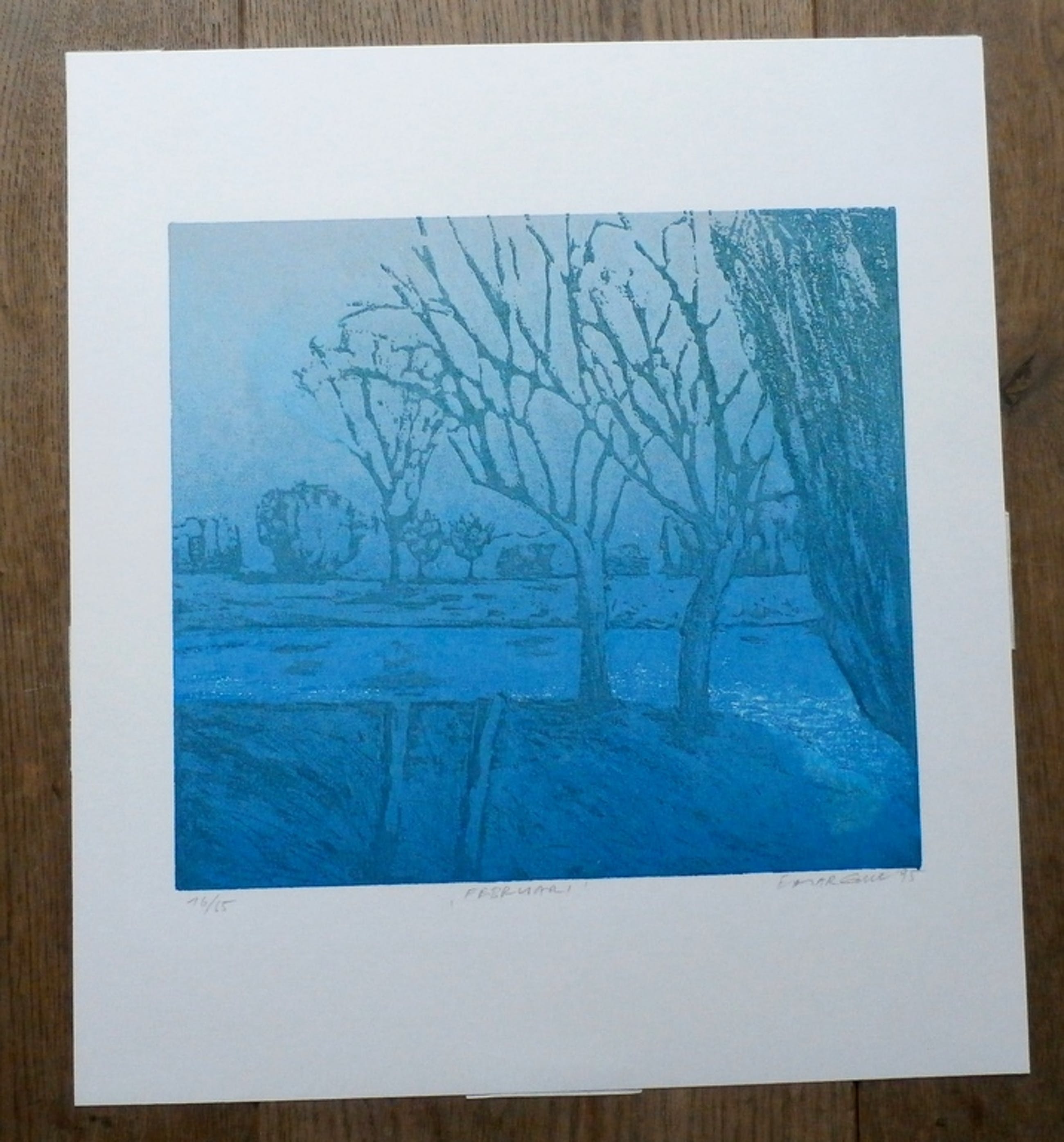 Mooie ets van Elmar Gille uit 1995. Nummer: 16/65. Titel: Februari. Afmetingen werk: H40 x b34,8 cm. Afmetingen voorstelling: H25 x b27,5 cm. Rechtsonder met potlood gesigneerd door de kunstenaar. Herkomst: collectie ABN AMRO.
