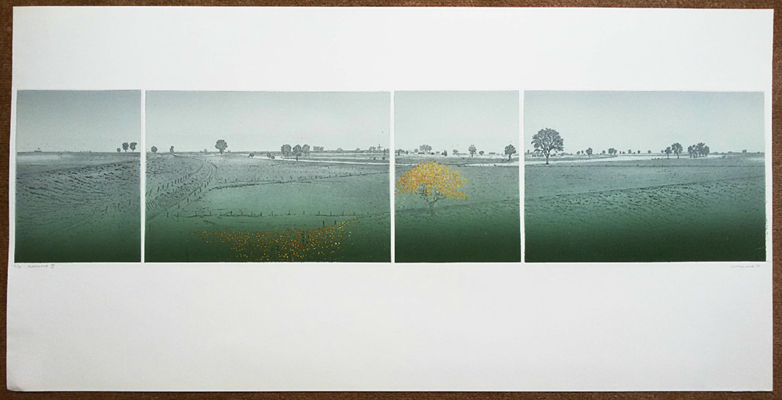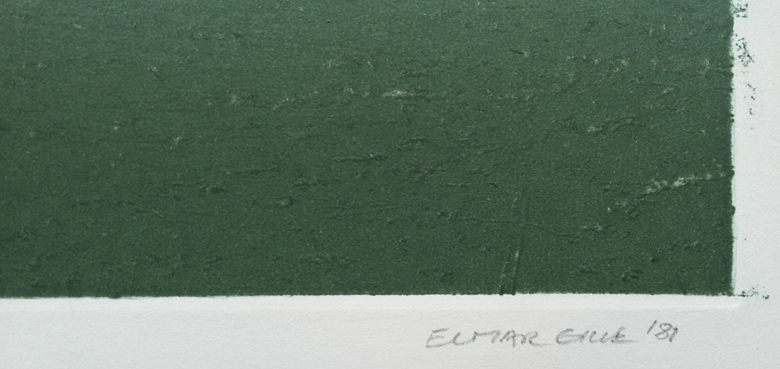 Prachtig vierluik van Elmar Gille uit 1981. Aquatint ets (vier eigenlijk) op dik papier, met potlood gesigneerd, gedateerd, getiteld en genummerd (5/20). Afkomstig uit de kunstcollectie van ABNAMRO, in uitstekende conditie.