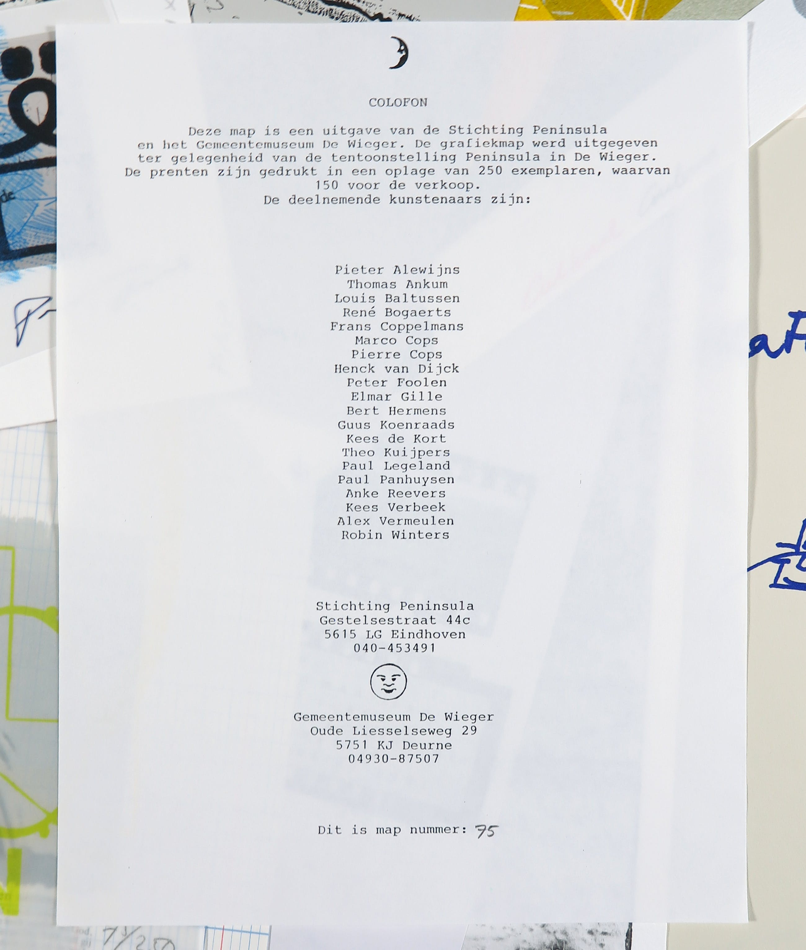 Grafiekmap uitgegeven door Stichting Peninsula in samenwerking met het Gemeentemuseum De Wieger. Uitgegeven t.g.v. van de tentoonstelling Peninsula in het Gemeentemuseum in 1991, in een oplage van 250 exemplaren waarvan 150 bestemd voor verkoop.