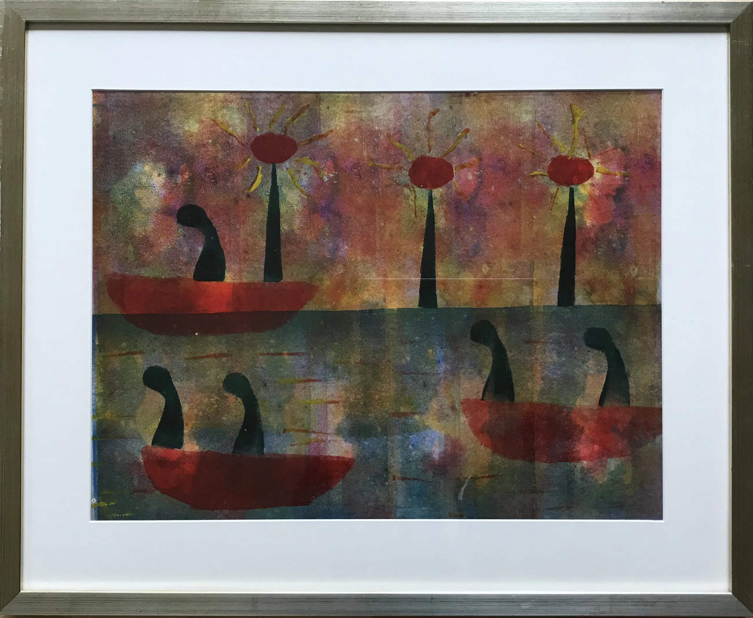 Mooie monoprint in lijst. De lijst heeft aan de achterzijde lichte vochtschade die aan de voorzijde niet te zien is. Print en lijst zijn gedroogd in een droogkamer.