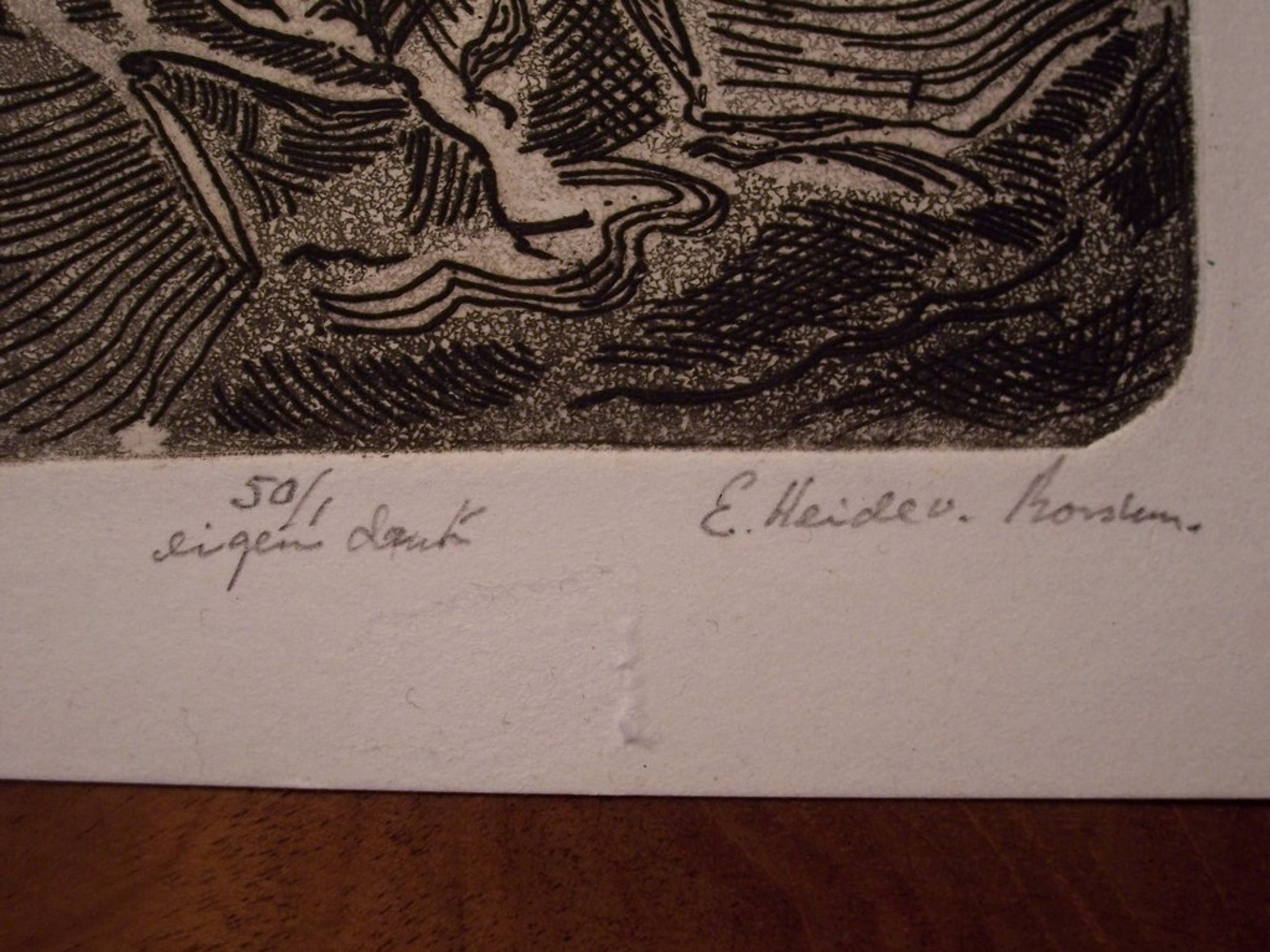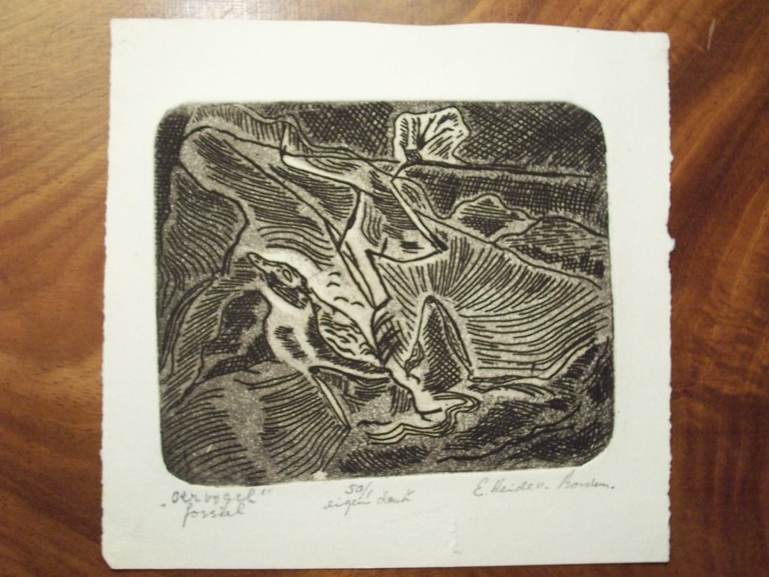 \r\n Bijzondere ets door Els Heide-van Rossum met afbeelding van een fossiele oervogel. Eigen druk (50/1). Titel, oplage en signatuur in potlood, onderaan de ets.