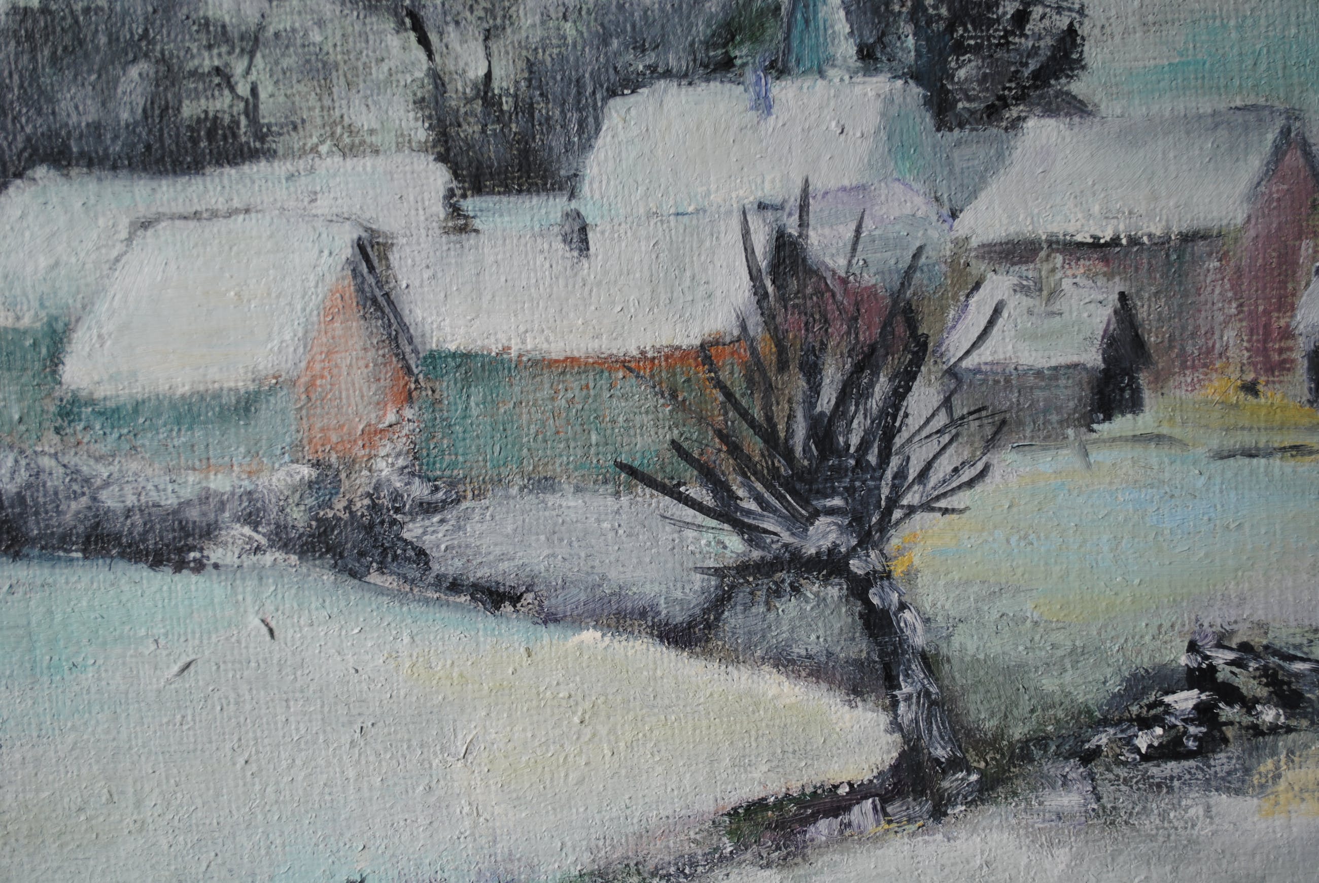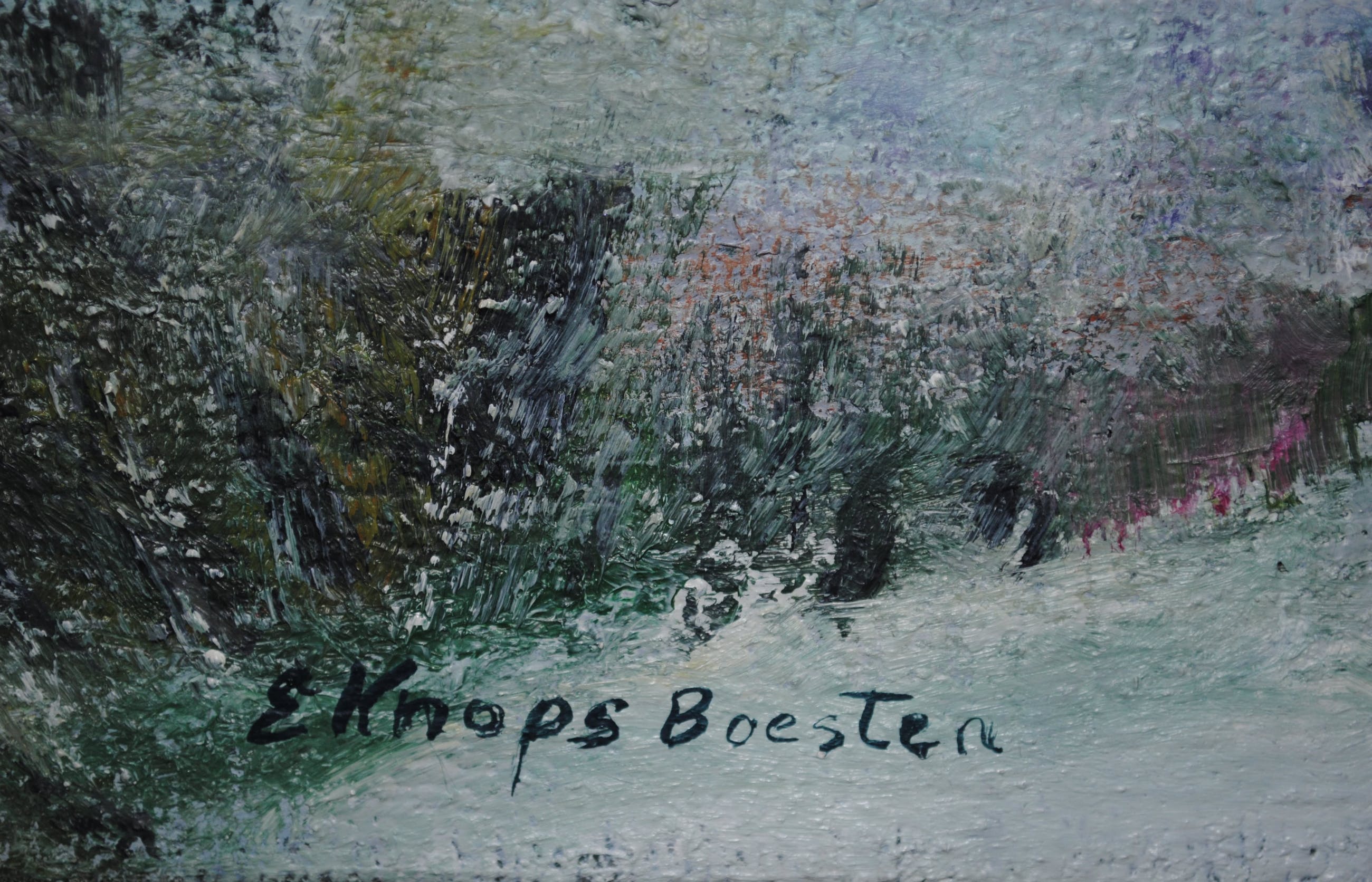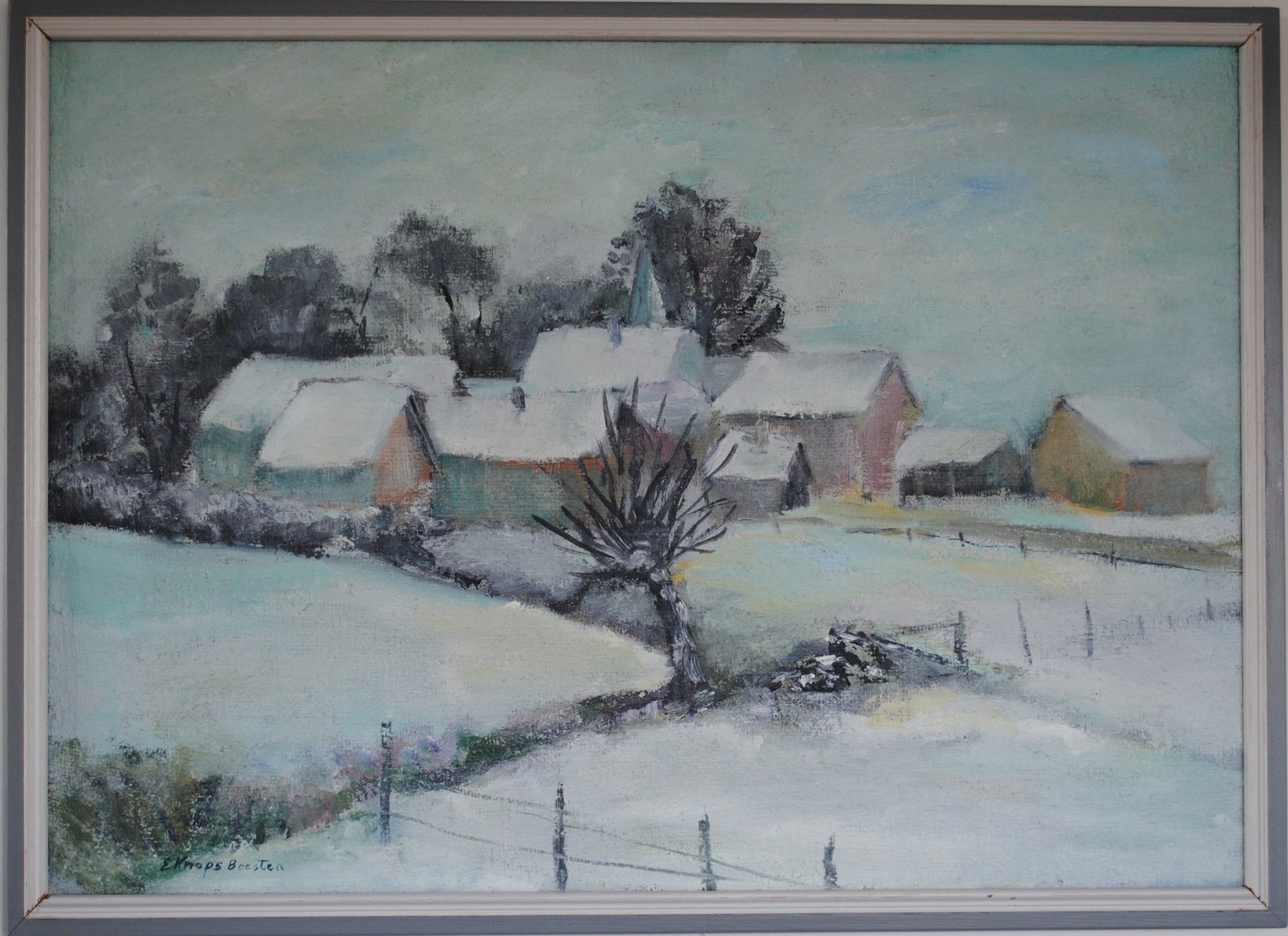 Mooi verstild winterlandschap uit de beginjaren '80. Het winterlandschap stelt het Limburgse dorpje Klein Doenrade voor. Kunstenares: Els Knops-Boesten uit Oirsbeek. Olieverf op doek. Houten lijst in rustige kleuren grijs en wit.