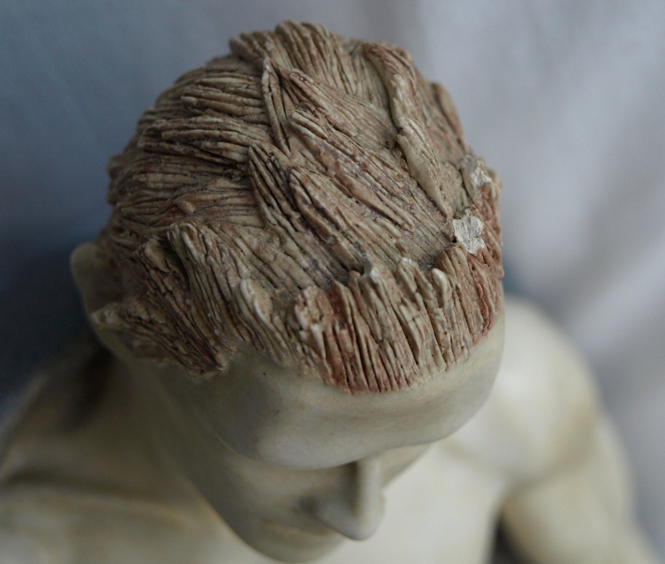 De sculptuur is gemaakt van wit gebakken klei en glazuur.