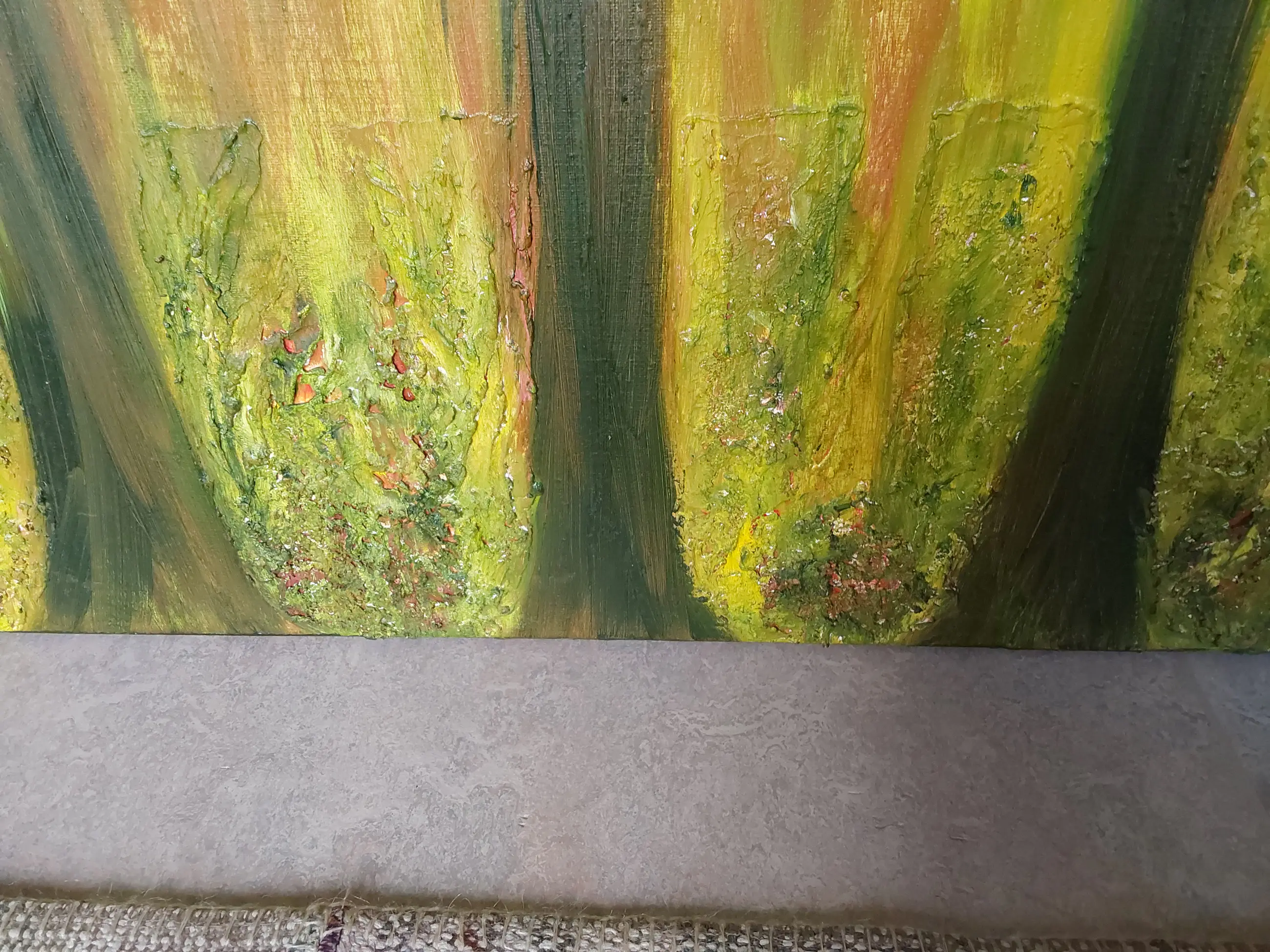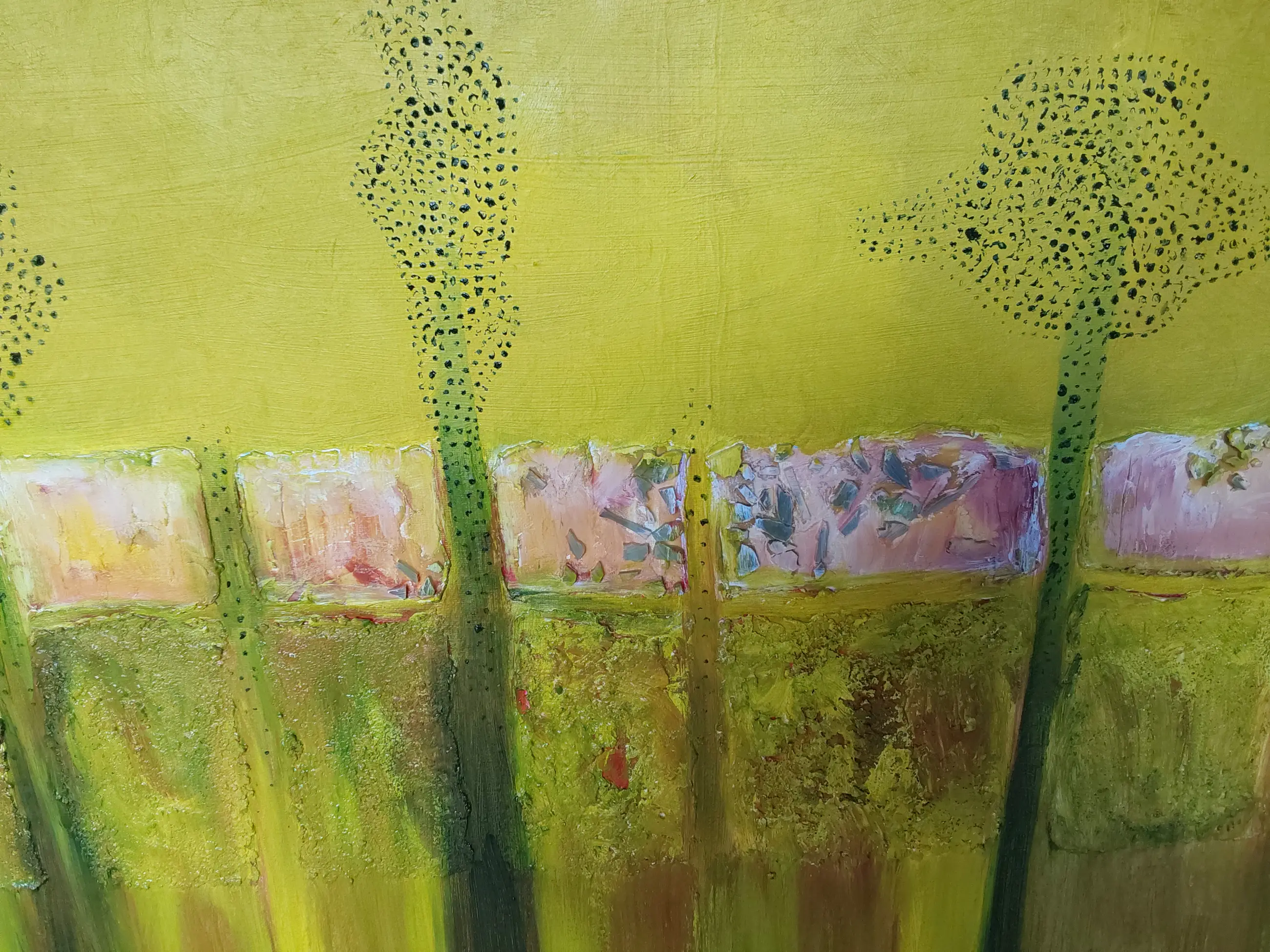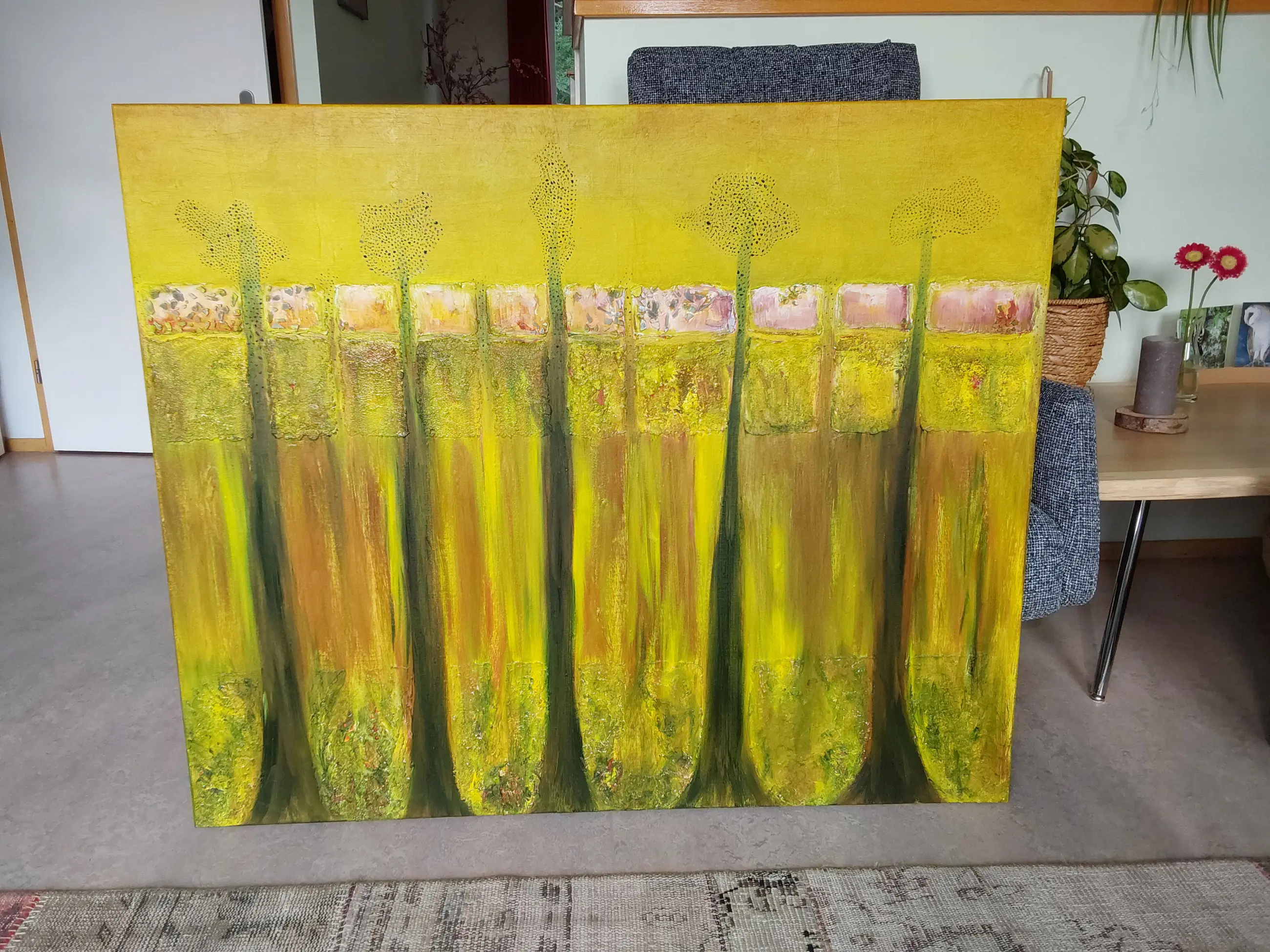 Ik heb het schilderij gekocht van Els Vegter een Utrechtse kunstenaar. www.elsvegter In 2014 heeft het me 1000,00 gekost. Er is gewerkt met reliëf in de vorm van kleine steentjes en dikke acrylverf.