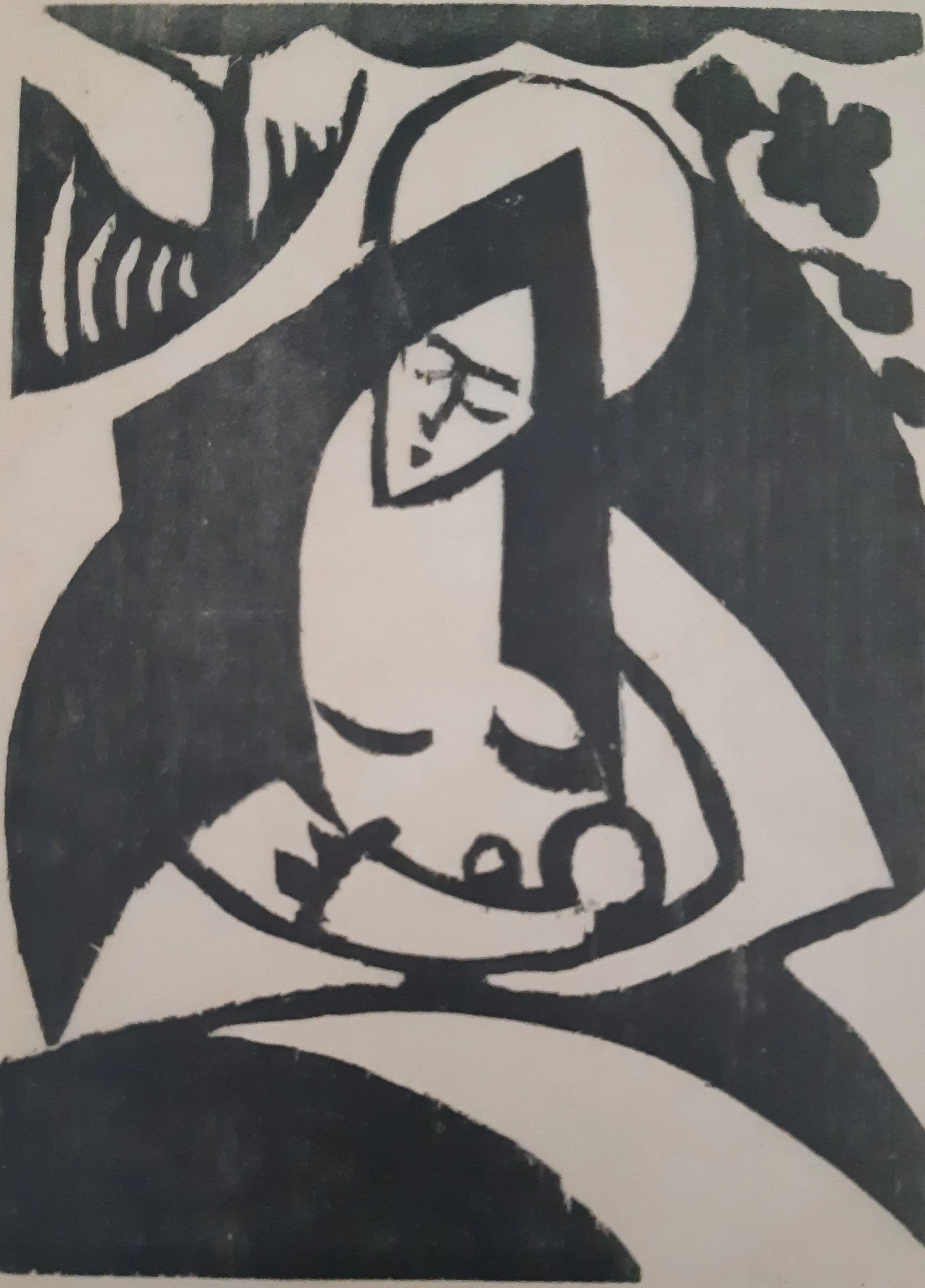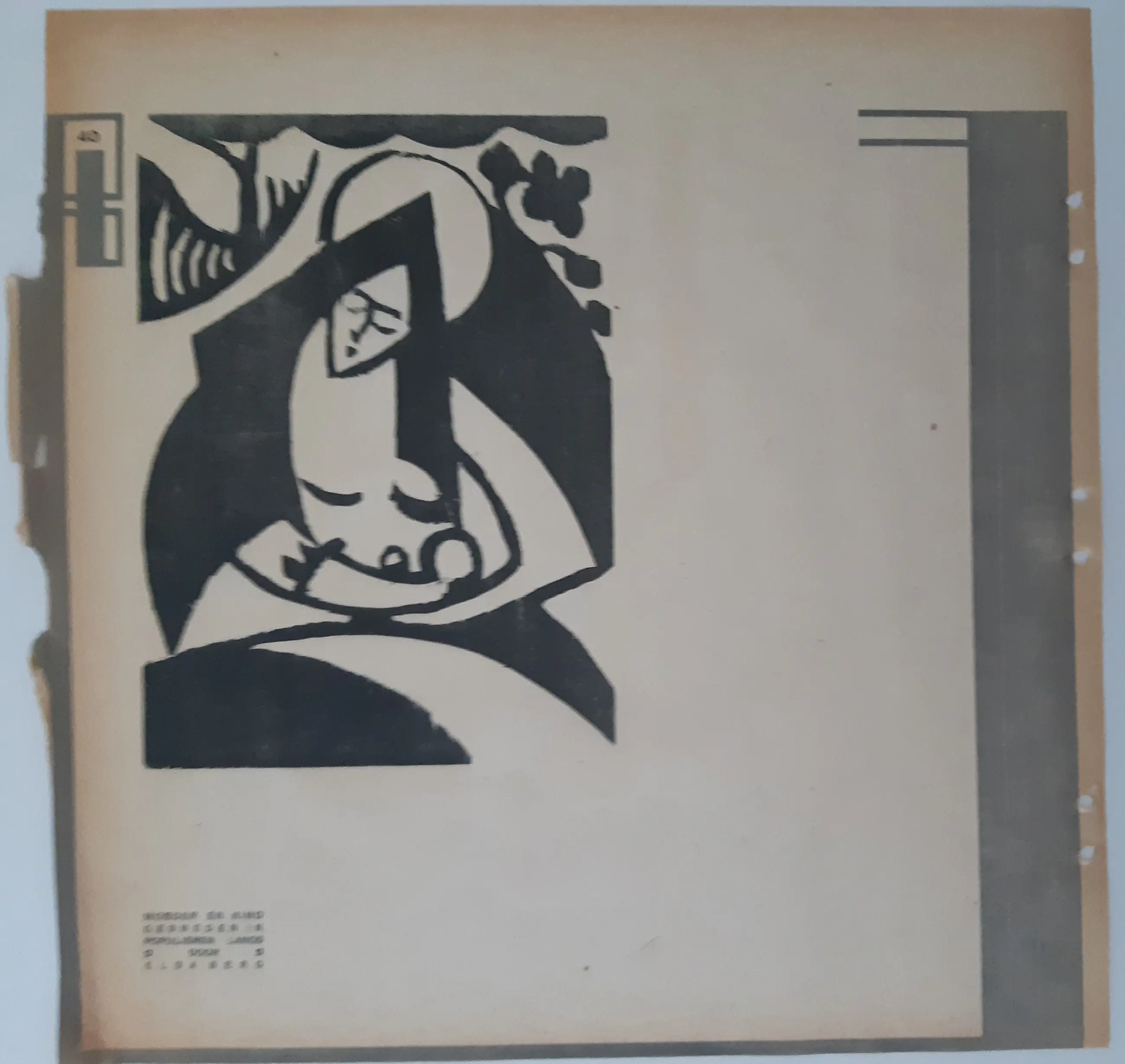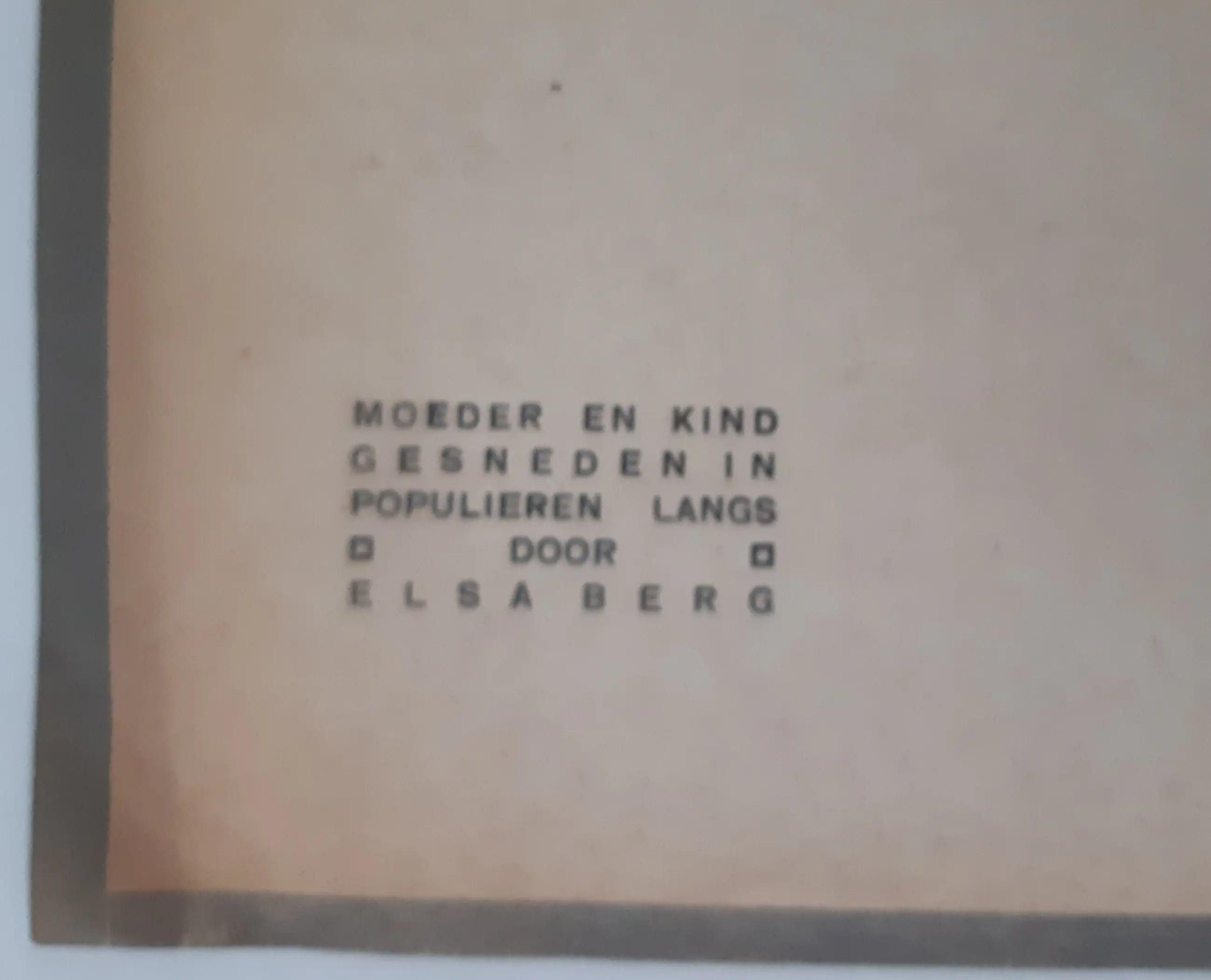 Houtsnede van Else (ten onrecht op het blad Elsa genoemd) Berg, afkomstig uit het beroemde houtsnijdersnummer van het tijdschrift Wendingen. Gesneden in populieren langs, gedrukt op flinterdun Japans papier. De afbeelding meet 20 x 14 cm en is in goede conditie. Het blad is vooral rondom enigszins vergeeld, niet vreemd gegeven de leeftijd. De linker bladrand is beschadigd (zie foto). Met passe-partout ingelijst is het werk prima.