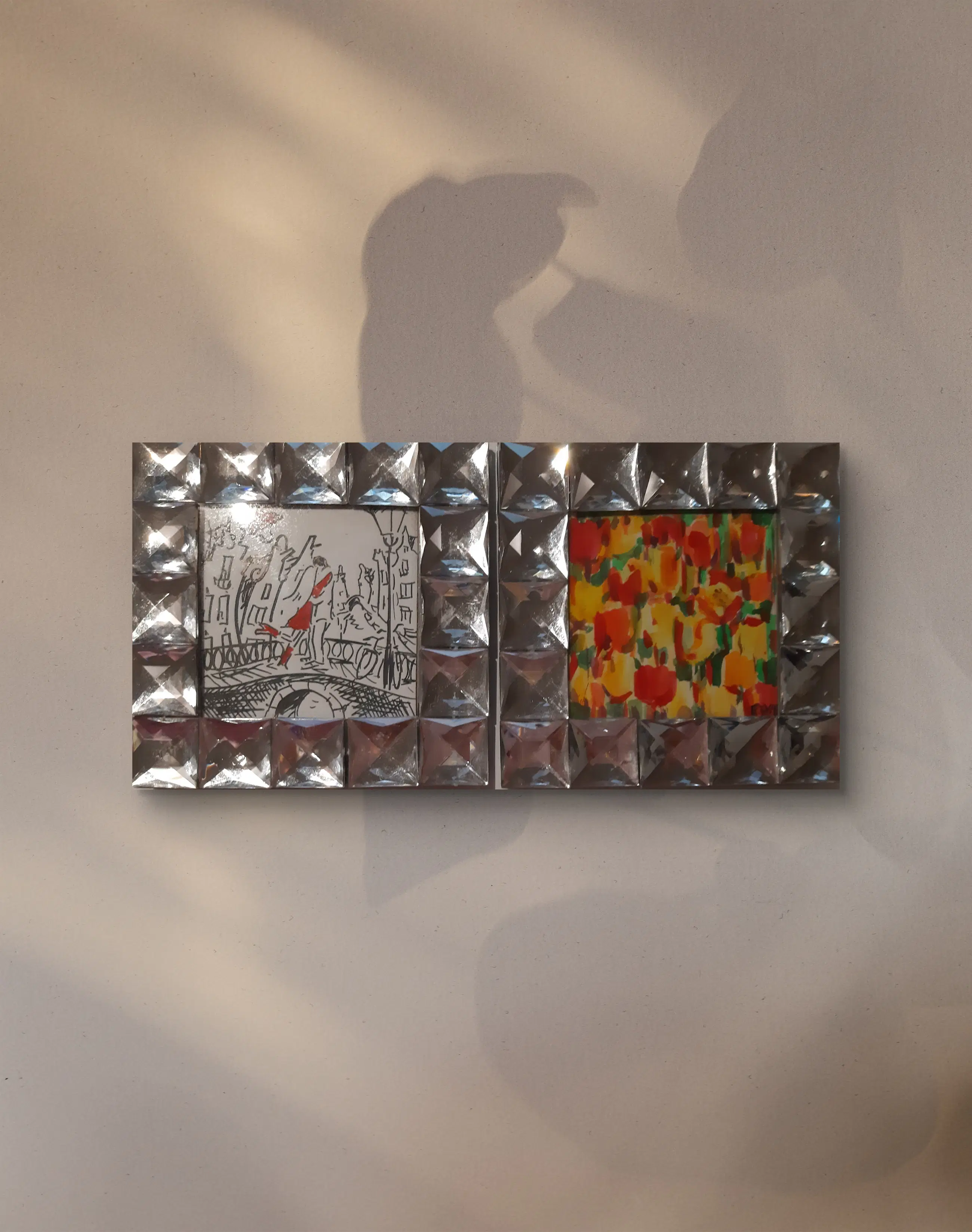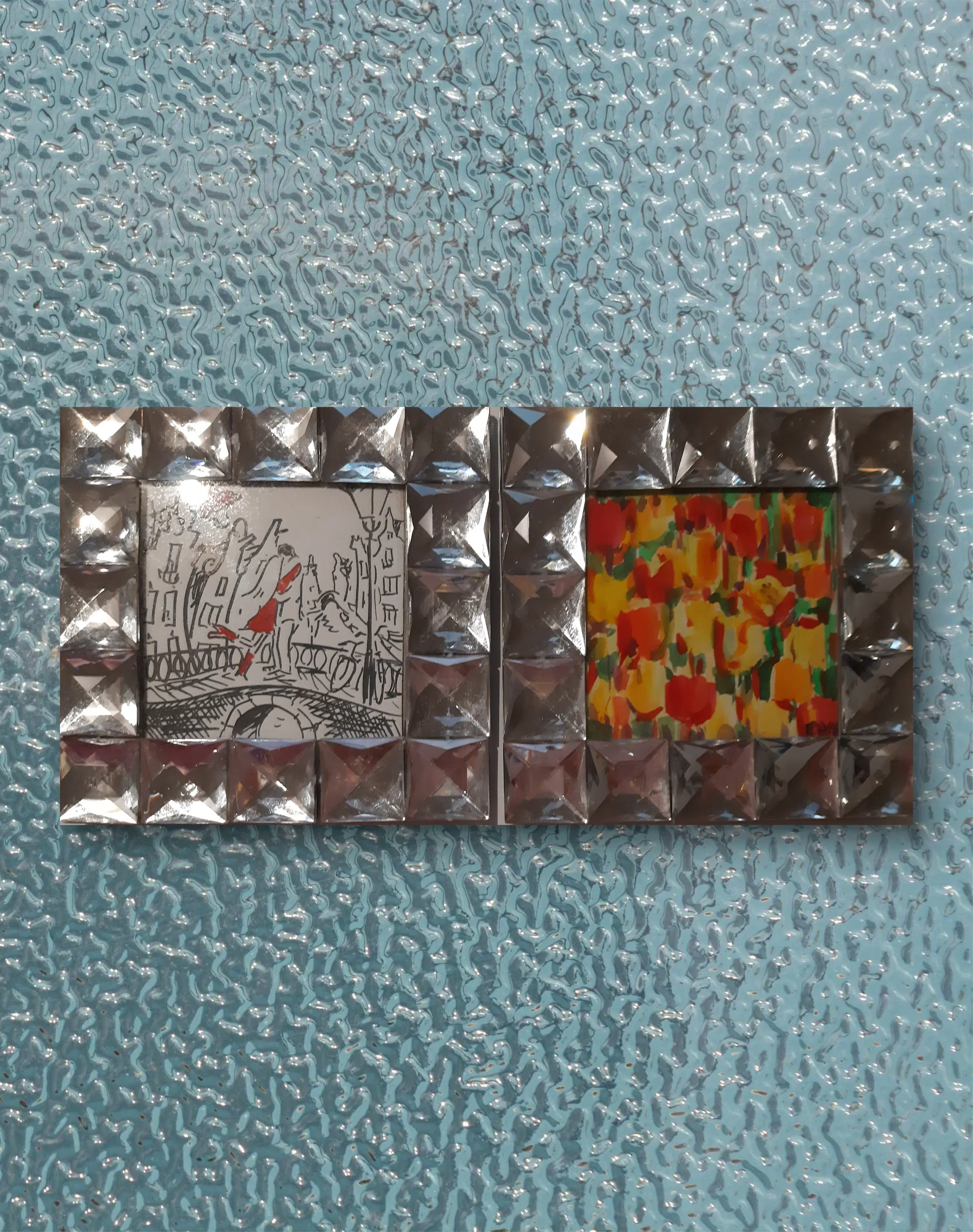 Zeer sfeervool schilderijtjes, ingelijst met kristalen glas vintage lijsten , kan zo op de muur. Kant en klaar ! Acrylverf op papier, achter glas. Certificat met Elva handtekening zit erbij.