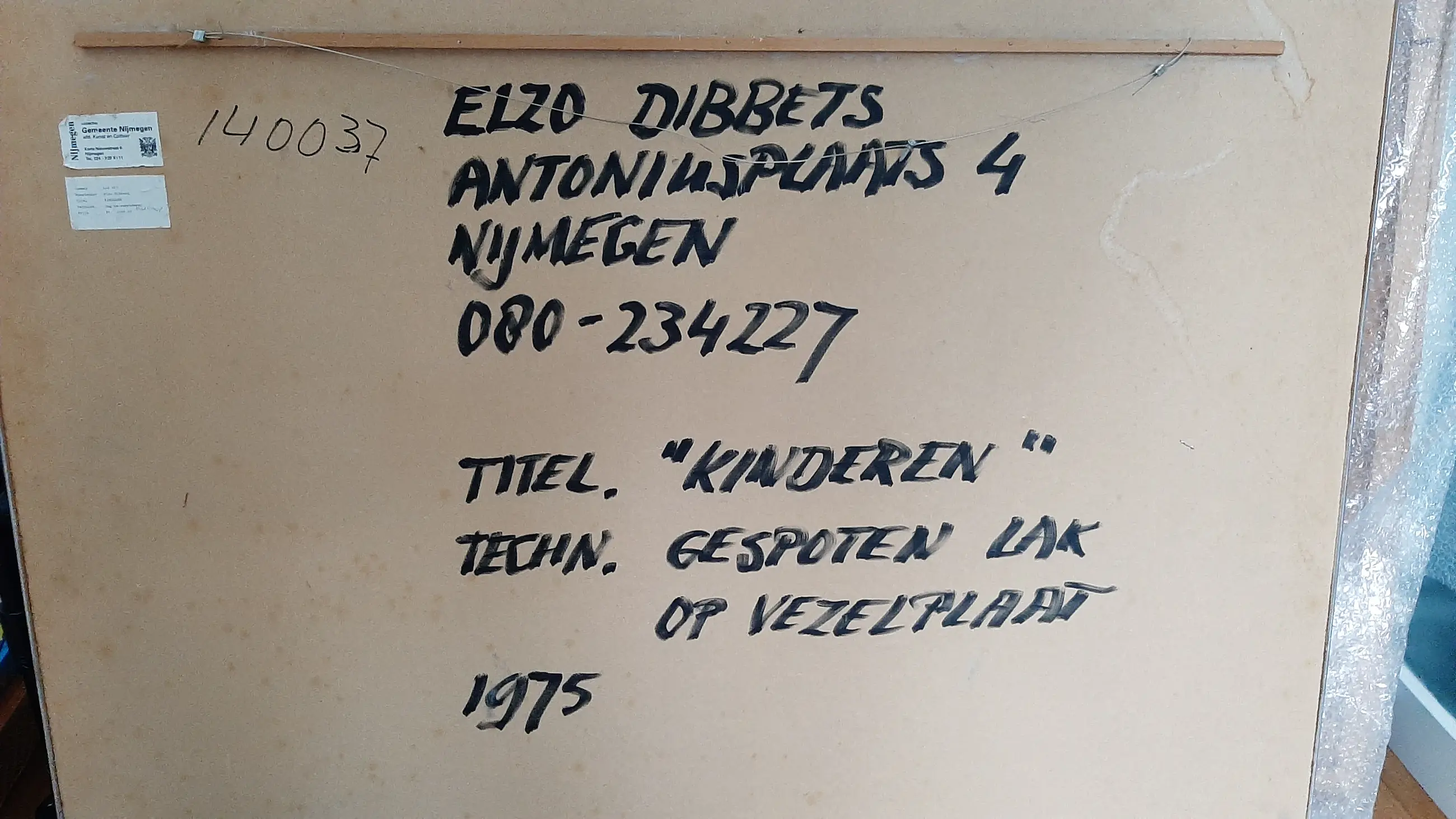 Bijzonder, groot portret van een groep kinderen, in gespoten lak. Werk behoorde tot de collectie van Gemeente Nijmegen en had destijds een waarde van 1000 gulden.