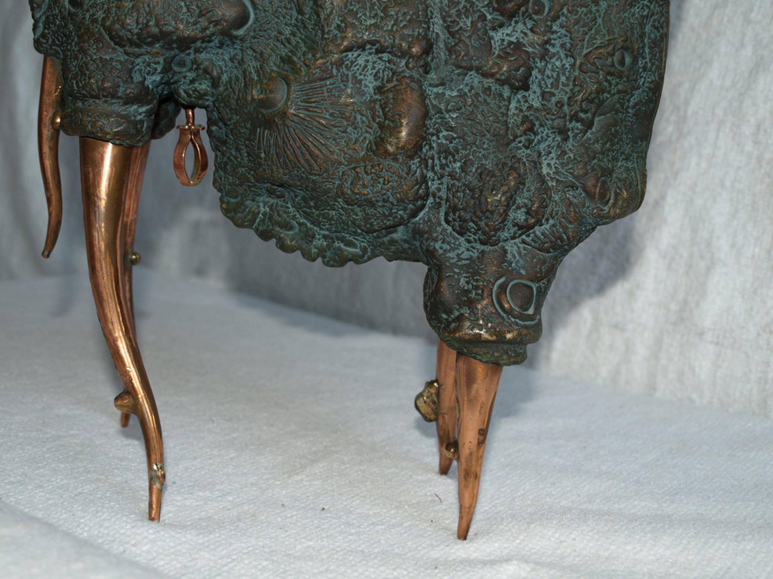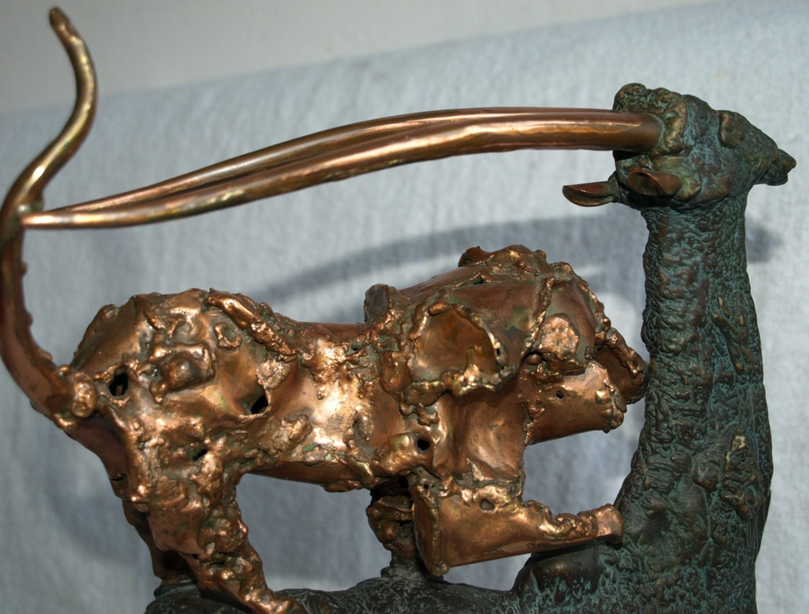 Gesigneerd: Gesigneerd door de kunstenaar d.m.v. een geslagen muntje met de beeltenis van een mammoet en zijn naam ('Litos'). Dit muntje zit in de buik van het hert.