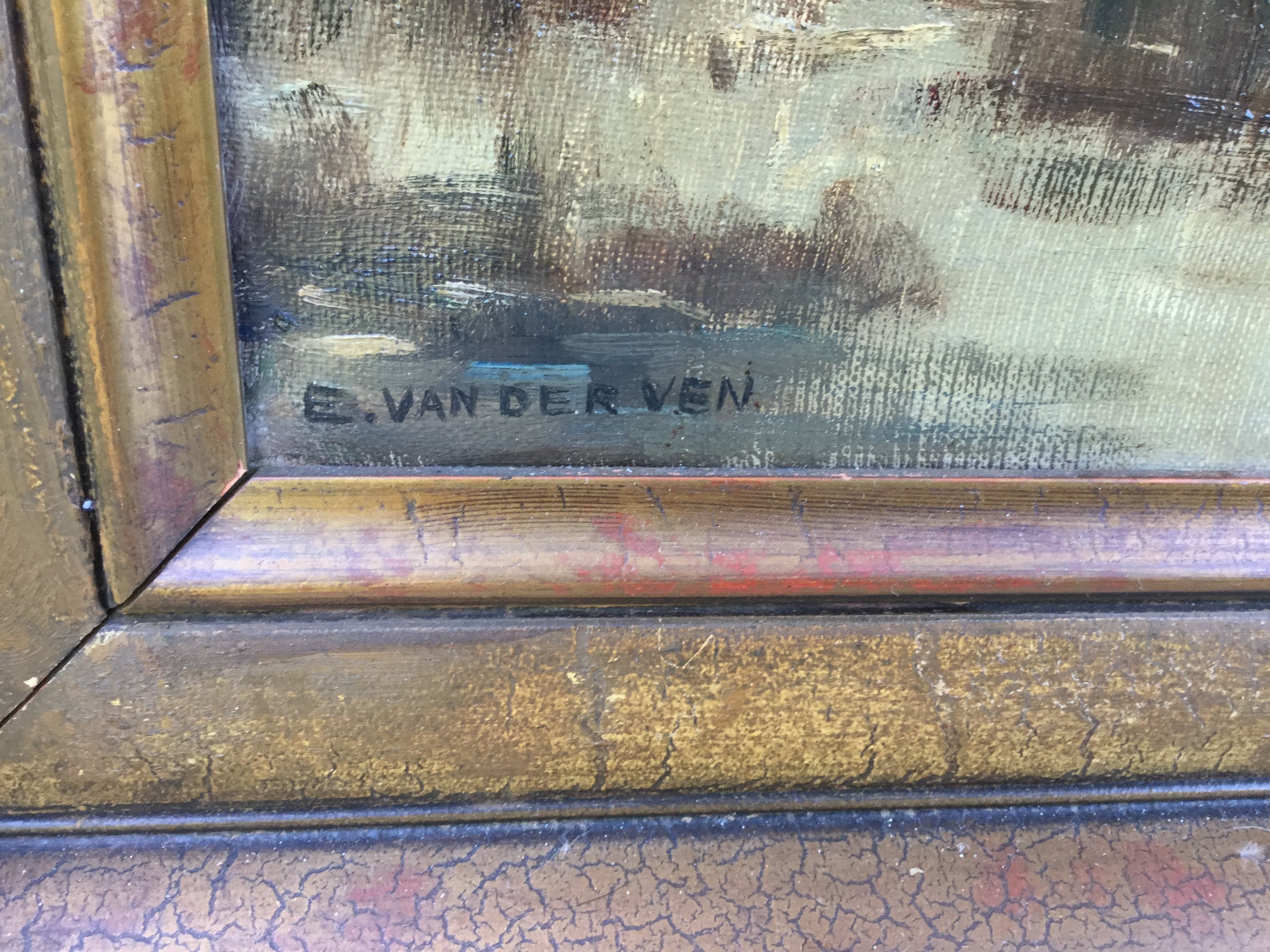 Doek bevat oppervlaktevuil, verkleurde vernis door de tijd, deuk met verfverlies in het midden van het doek, spieraamdoorslag, doek bobbelt iets in de hoeken. De lijst bevat oppervlaktevuil en slijtschade door de tijd, randschade. | |