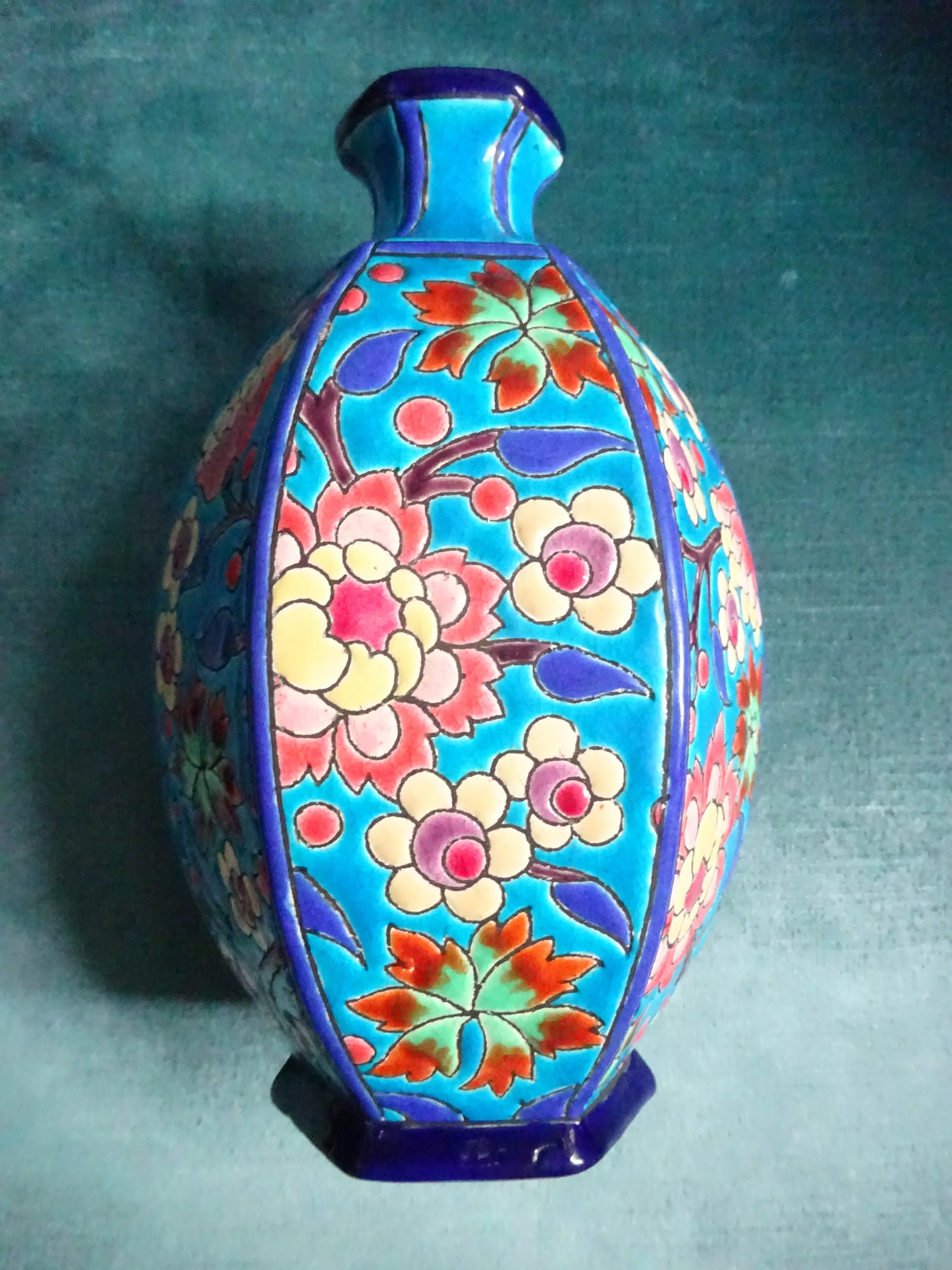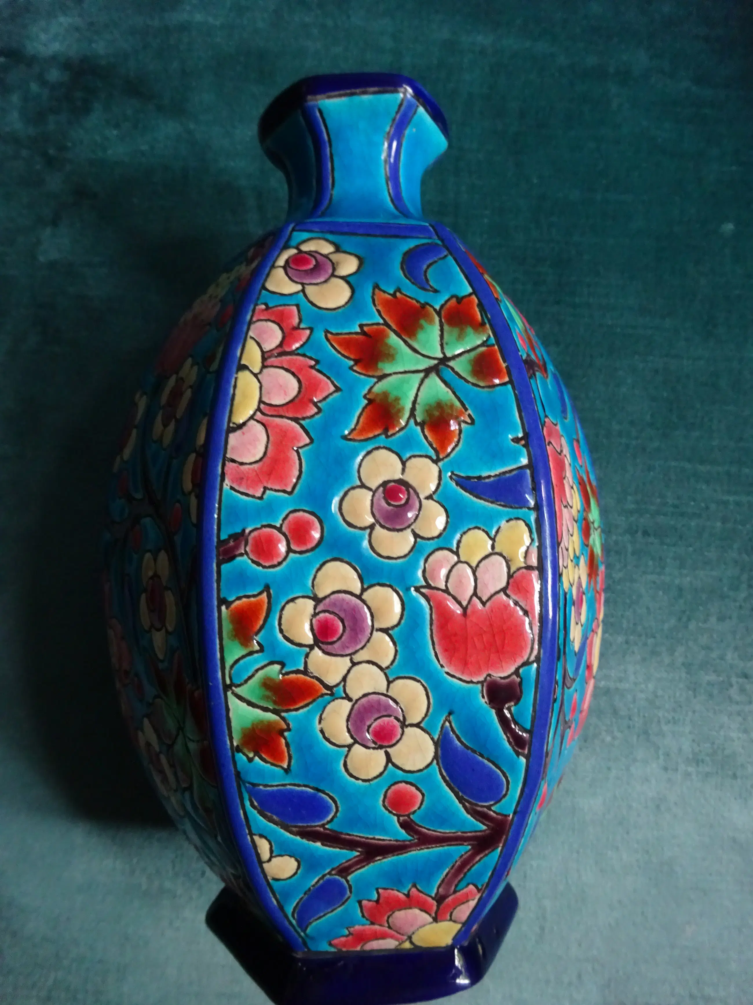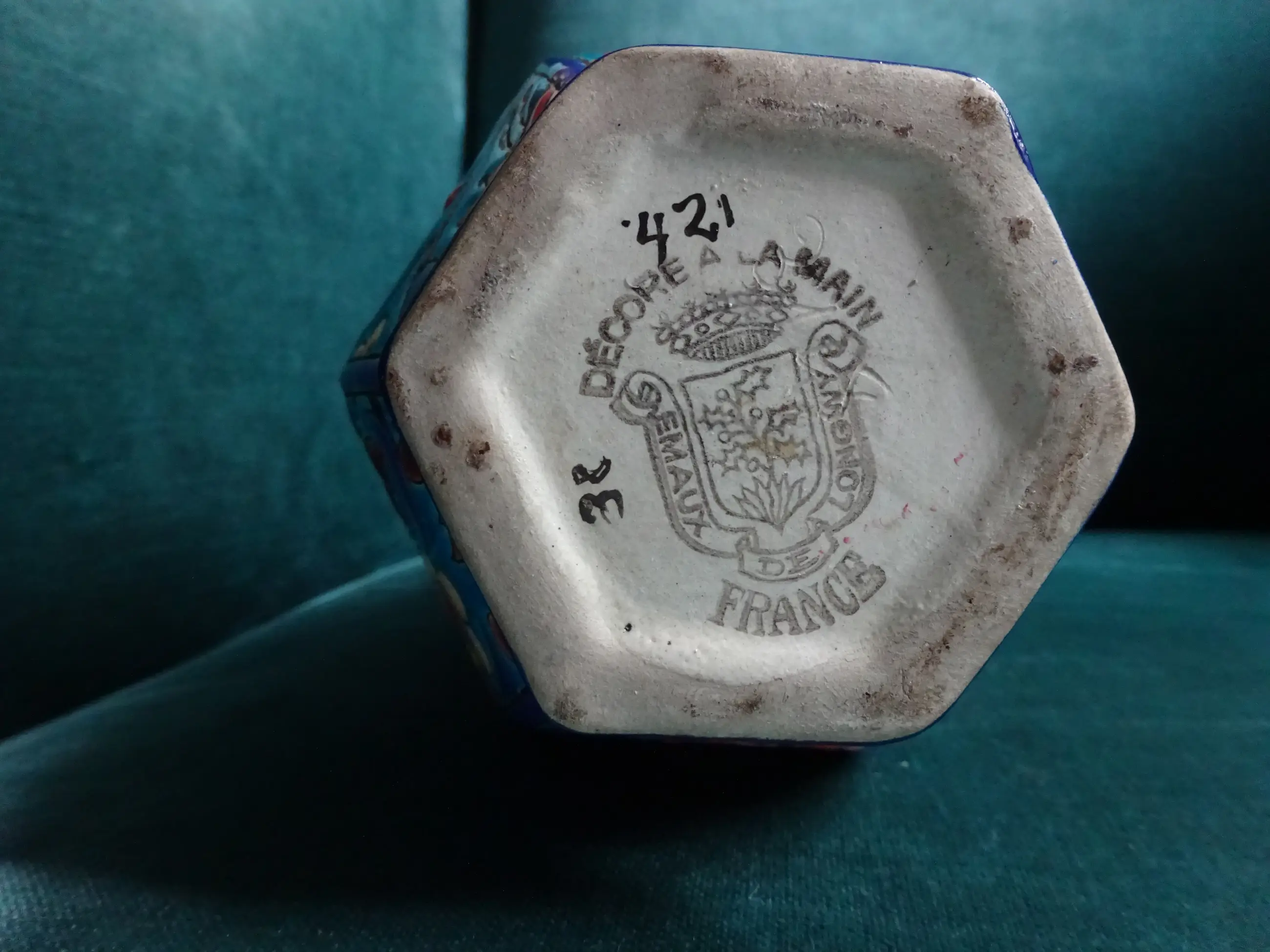 Longwy vaas Gemerkt: decore a la main, emaux longwy france Zwart merk: gebruikt van 1900-2000 Nummer: 421 en 32 Afmeting: 18 cm hoog, breed ca 11 cm Land: France- Frankrijk Jaar: midden 20e eeuw Conditie: prachtige kleuren en in nieuwstaat ( zie foto's)