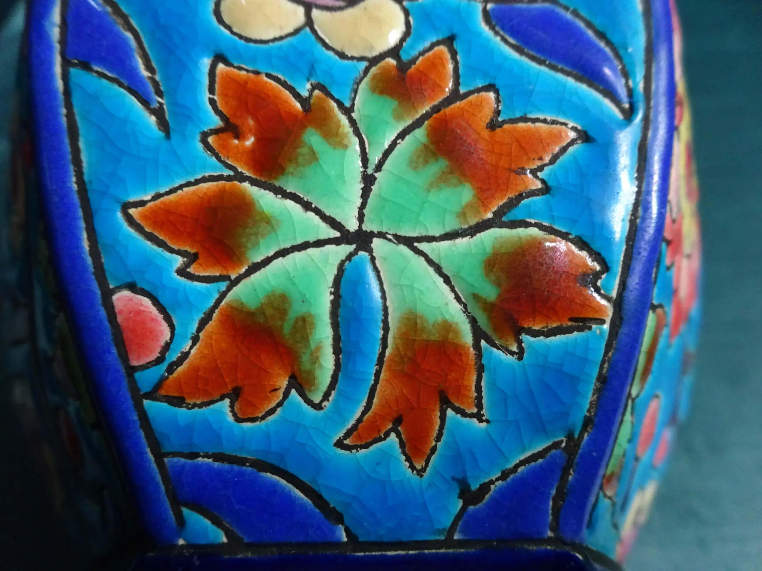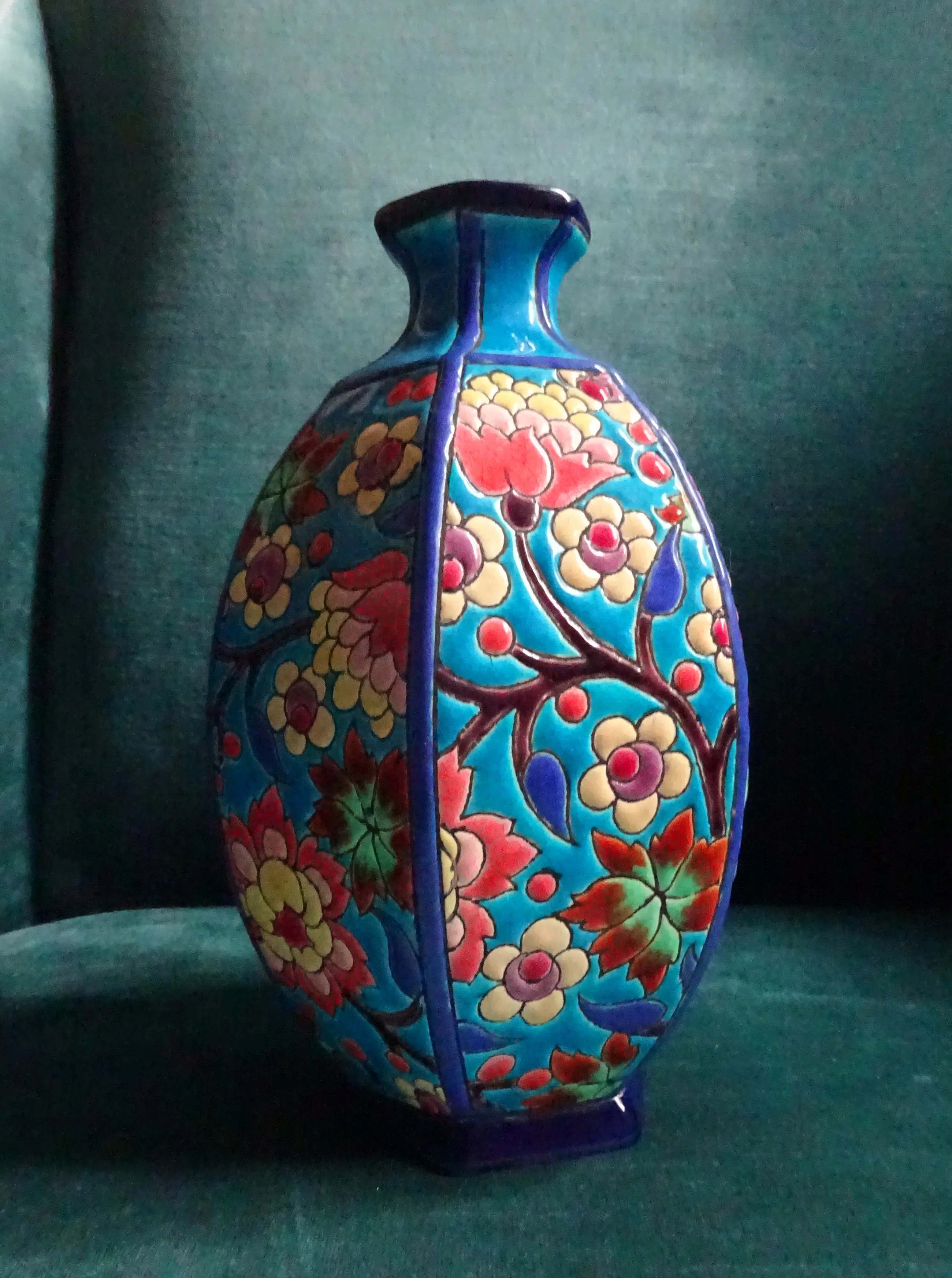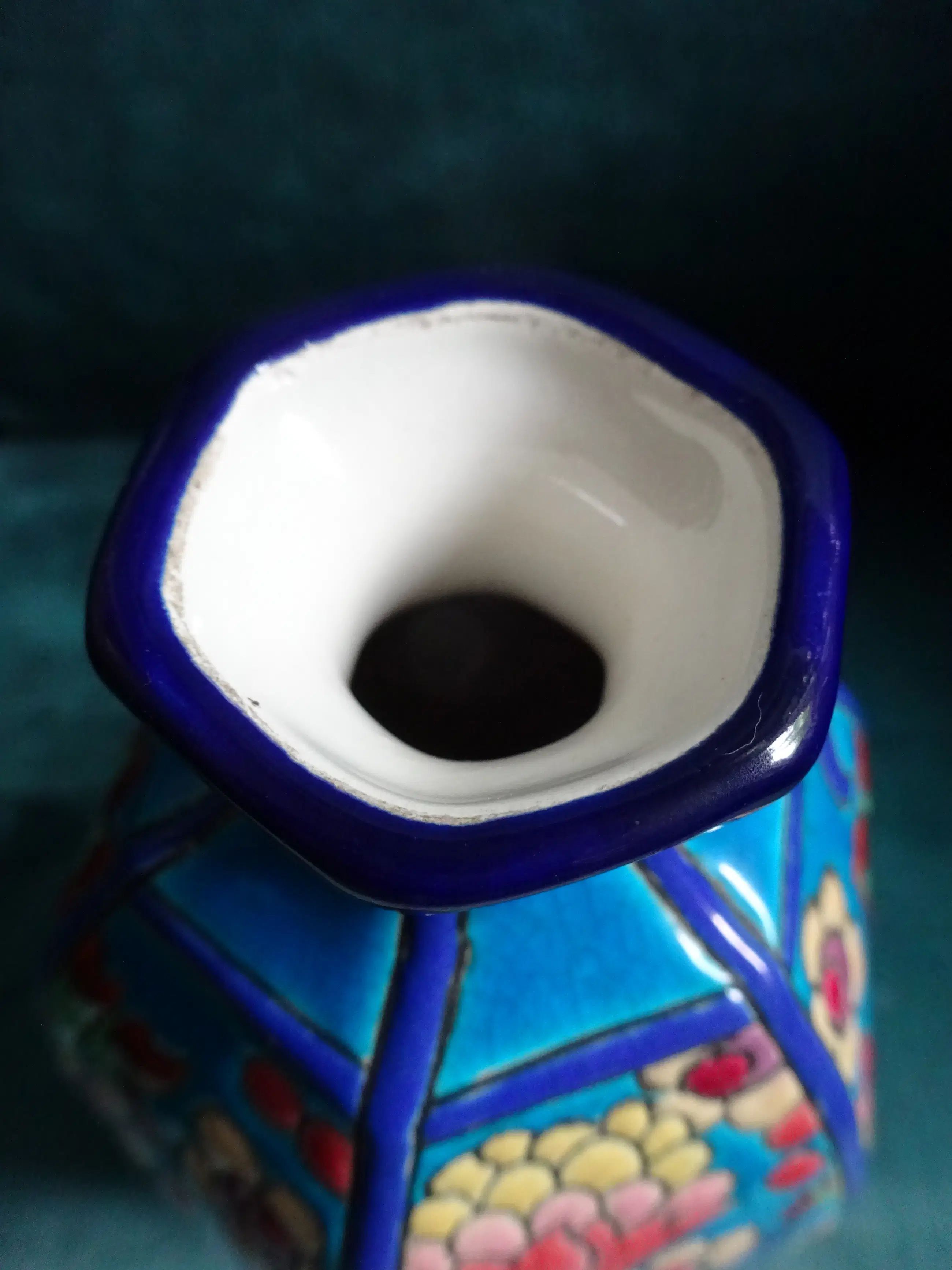 Longwy vaas Gemerkt: decore a la main, emaux longwy france Zwart merk: gebruikt van 1900-2000 Nummer: 421 en 32 Afmeting: 18 cm hoog, breed ca 11 cm Land: France- Frankrijk Jaar: midden 20e eeuw Conditie: prachtige kleuren en in nieuwstaat ( zie foto's)