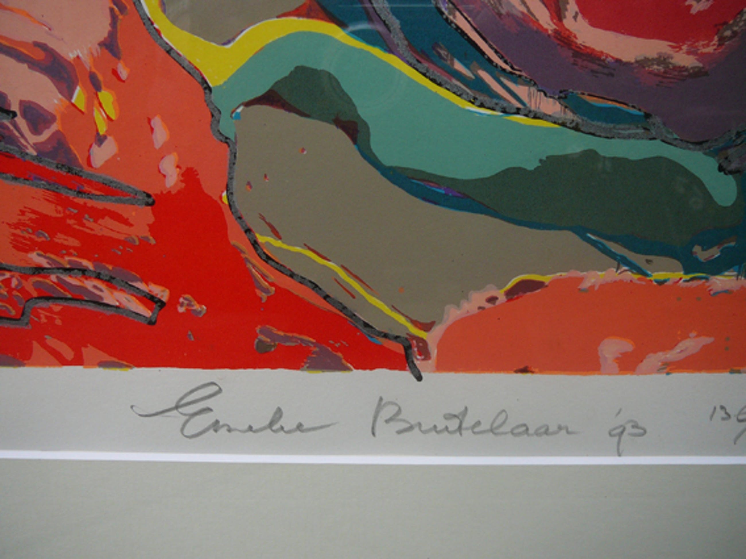 Kleurrijke zeefdruk van Emeke Buitelaar in haar bekende figuratief expressionistische stijl. Dits is nummer 136 van 150 exemplaren. Het geheel verkeert in staat van nieuw. Af te halen in Utrecht of bezorgen in overleg. Verzending per post zonder lijst.