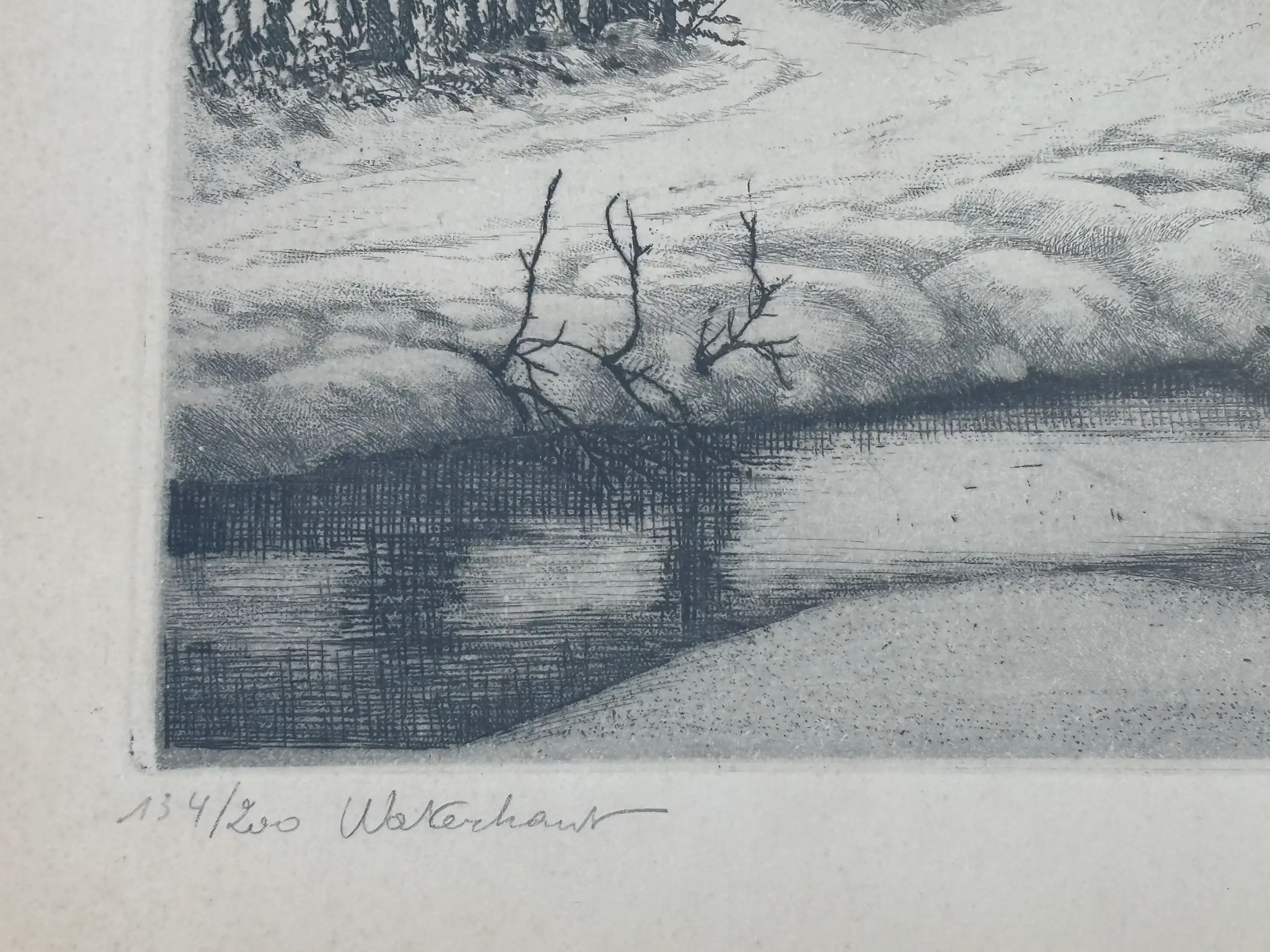 Gesigneerd in de plaat en gedateerd “1978” in de plaat + gesigneerd in potlood + 134/200 genummerd in potlood + getiteld in potlood “Waterkant”. Afmetingen met kader 52,5 x 42,5 cm zonder kader 32,5 x 24,5 cm