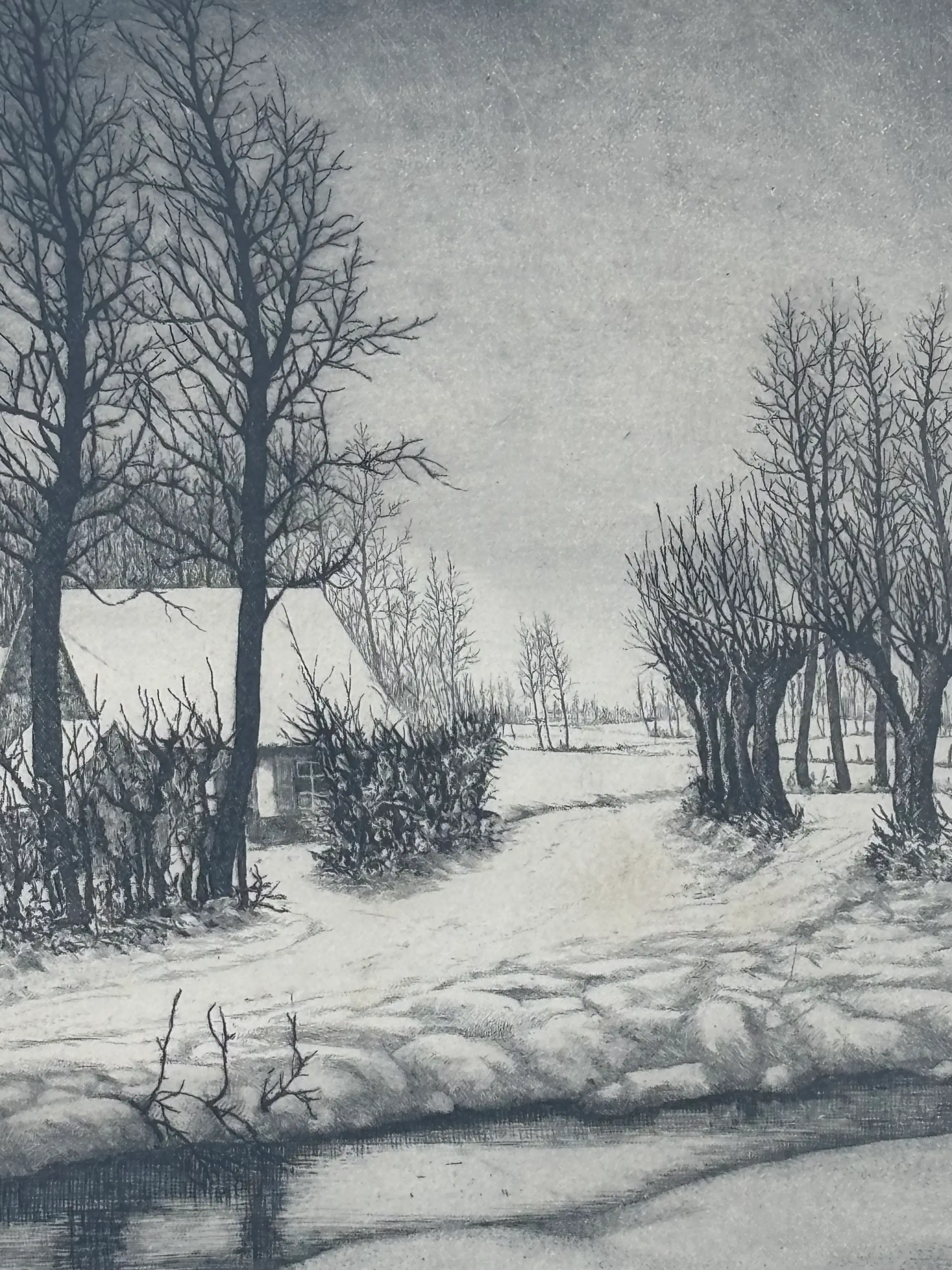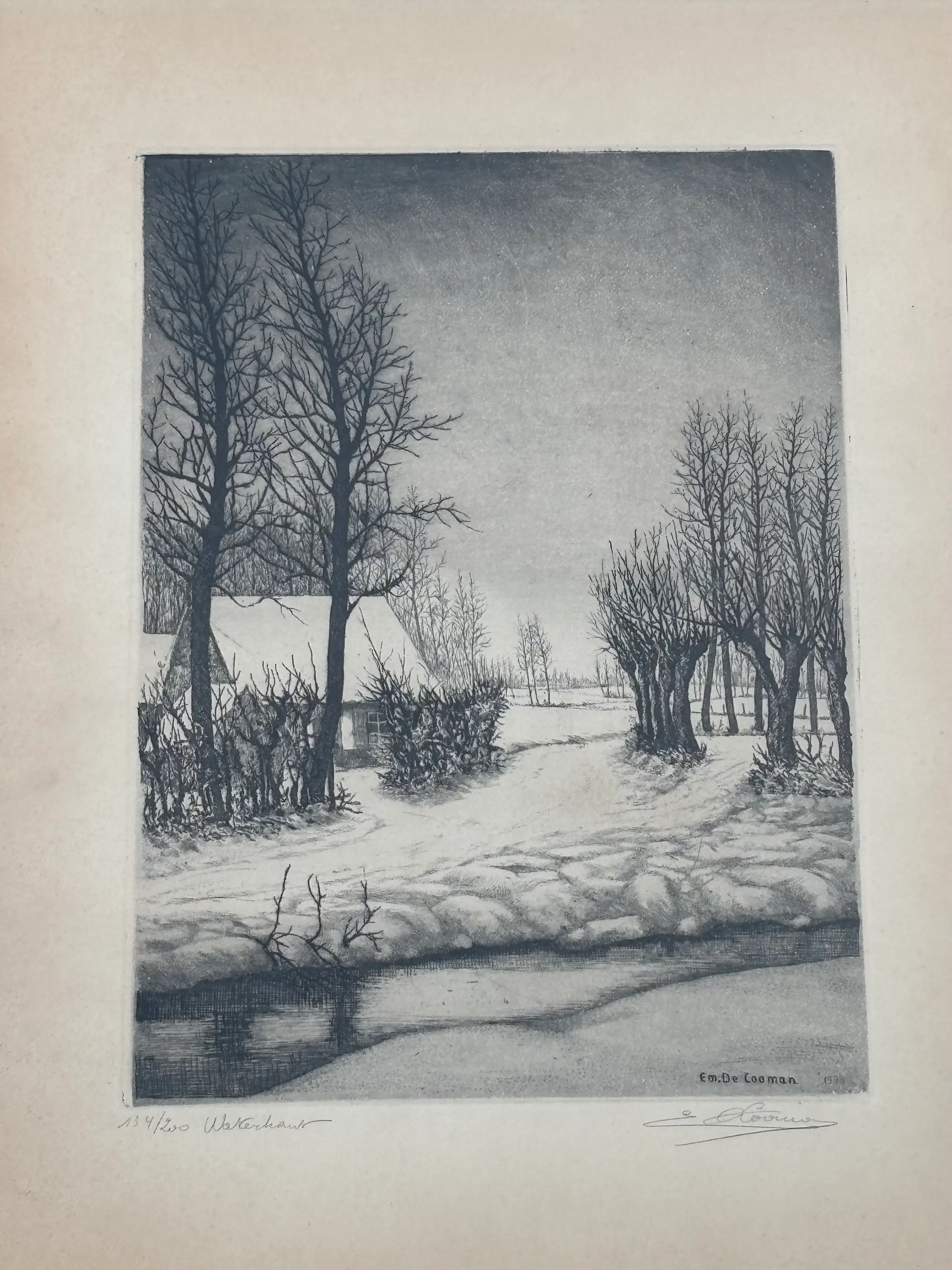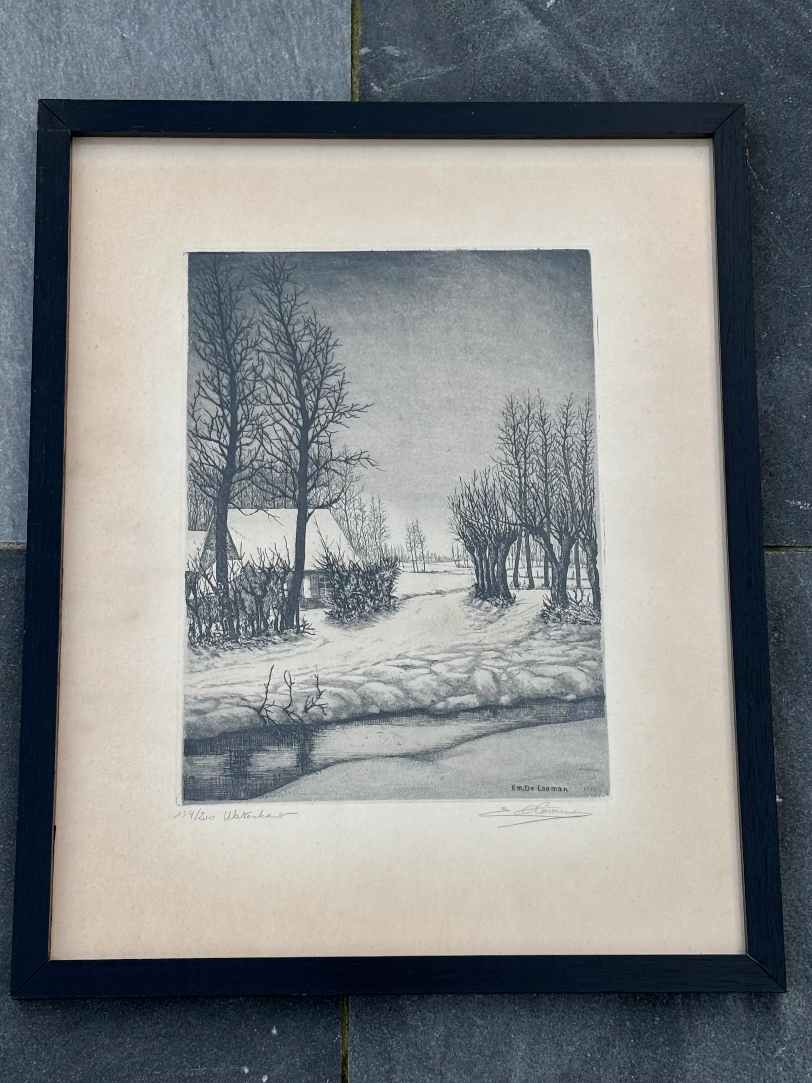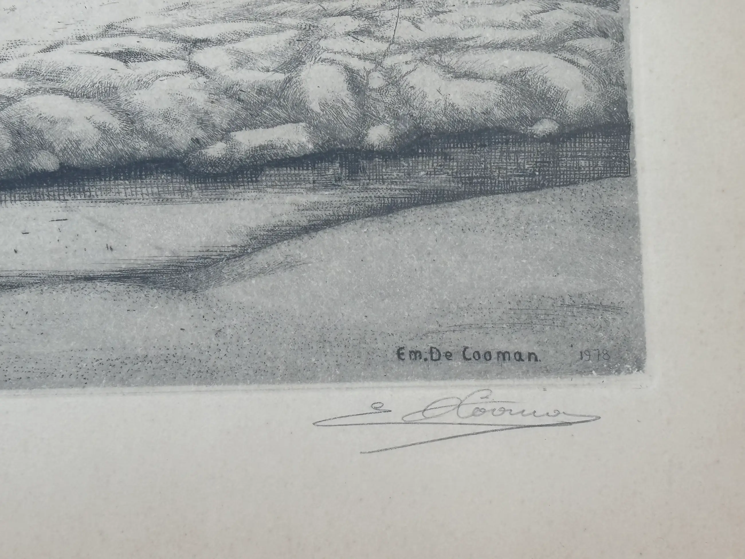 Ets van de befaamde Belgische etser en schilder Emiel De Cooman (1922-2021). Goede staat. Ingekaderd achter glas.