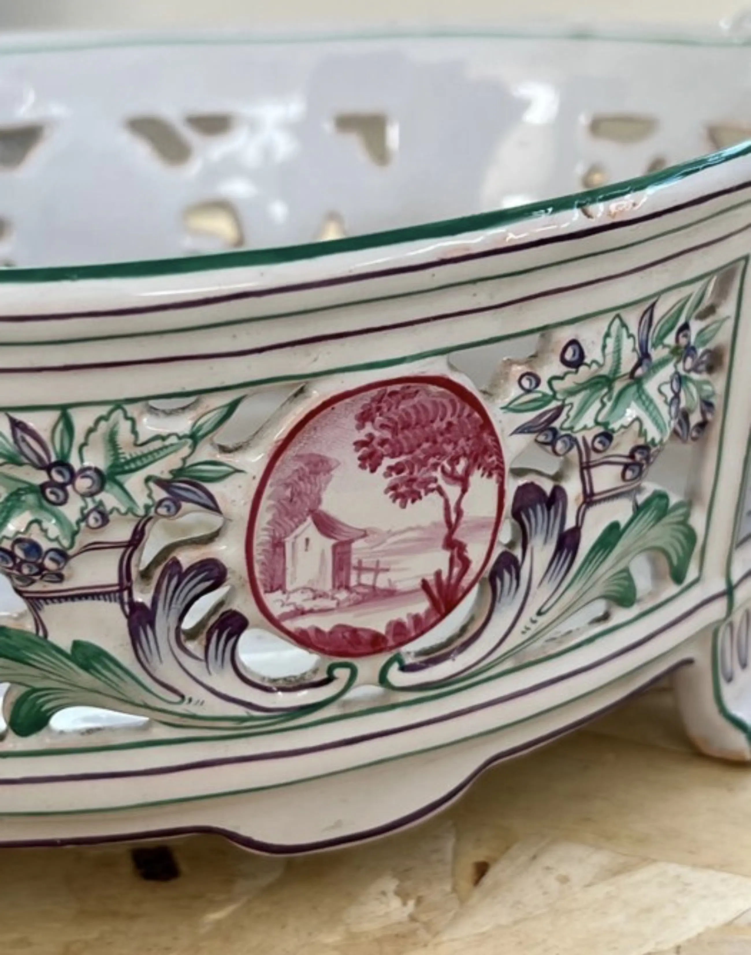 • Decoratie: Een prachtig centraal medaillon met een monochroom landschap in bordeauxrode tinten, omringd door verfijnd ajourwerk (opengewerkte details) en florale motieven in groen, blauw en paars.