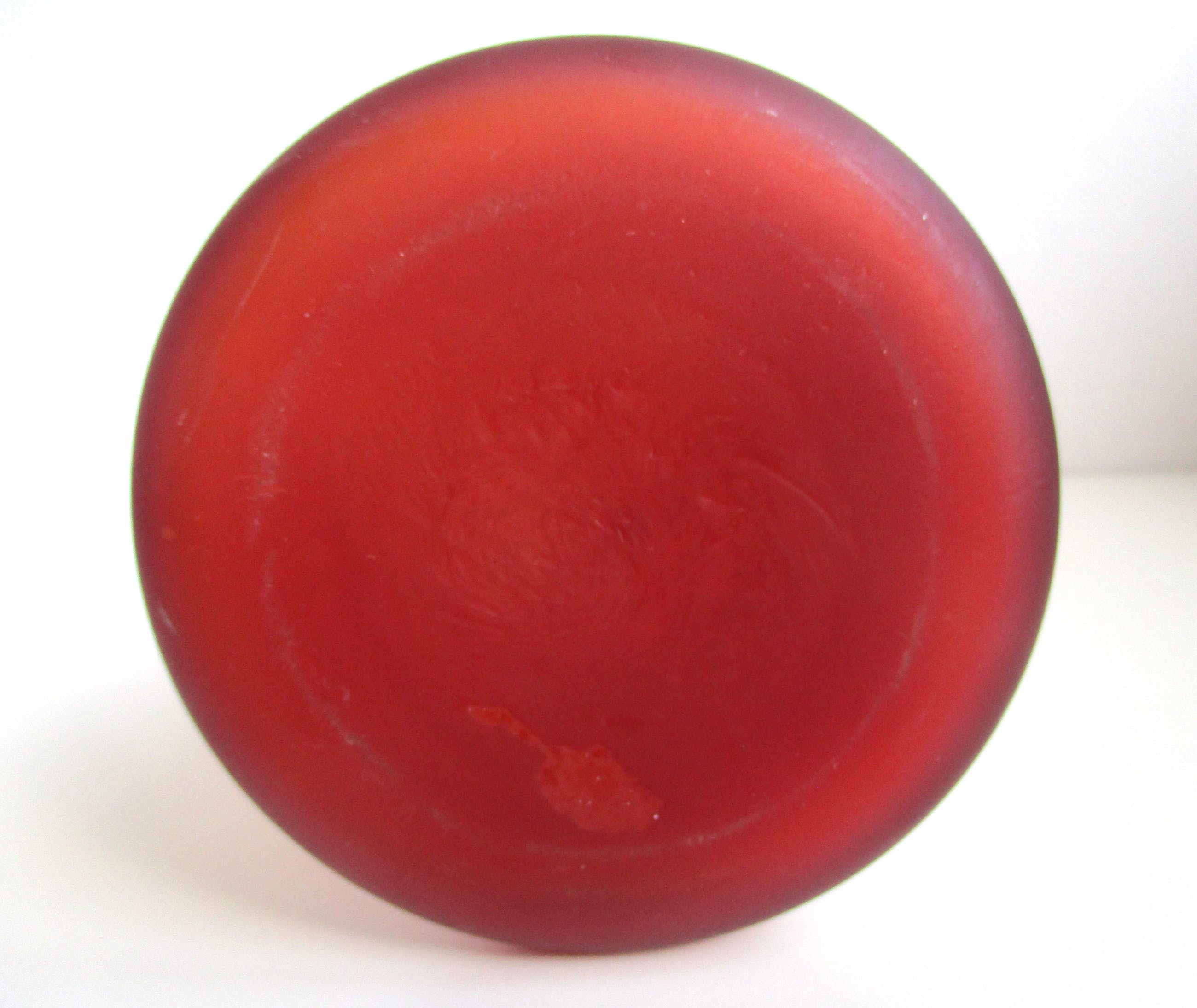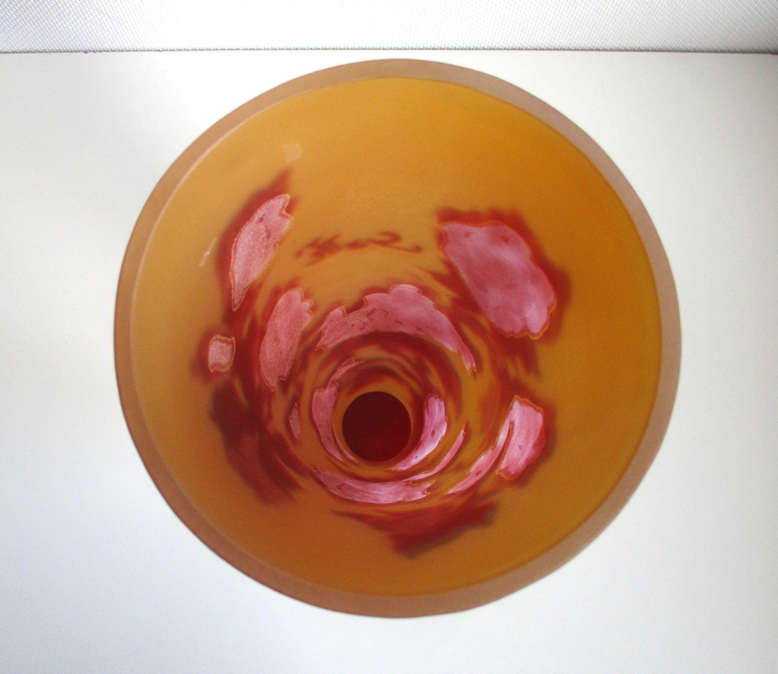 Emile Gallé 'Tip' vaas met een prachtige voorstelling van bloemen op een oranje basis. Gemaakt in Roemenië in de jaren tachtig. Deze vaas is in de stijl van Gallé gemaakt: Opgelegd glas met tussen twee lagen een door een ets procedé aangebrachte voorstelling.