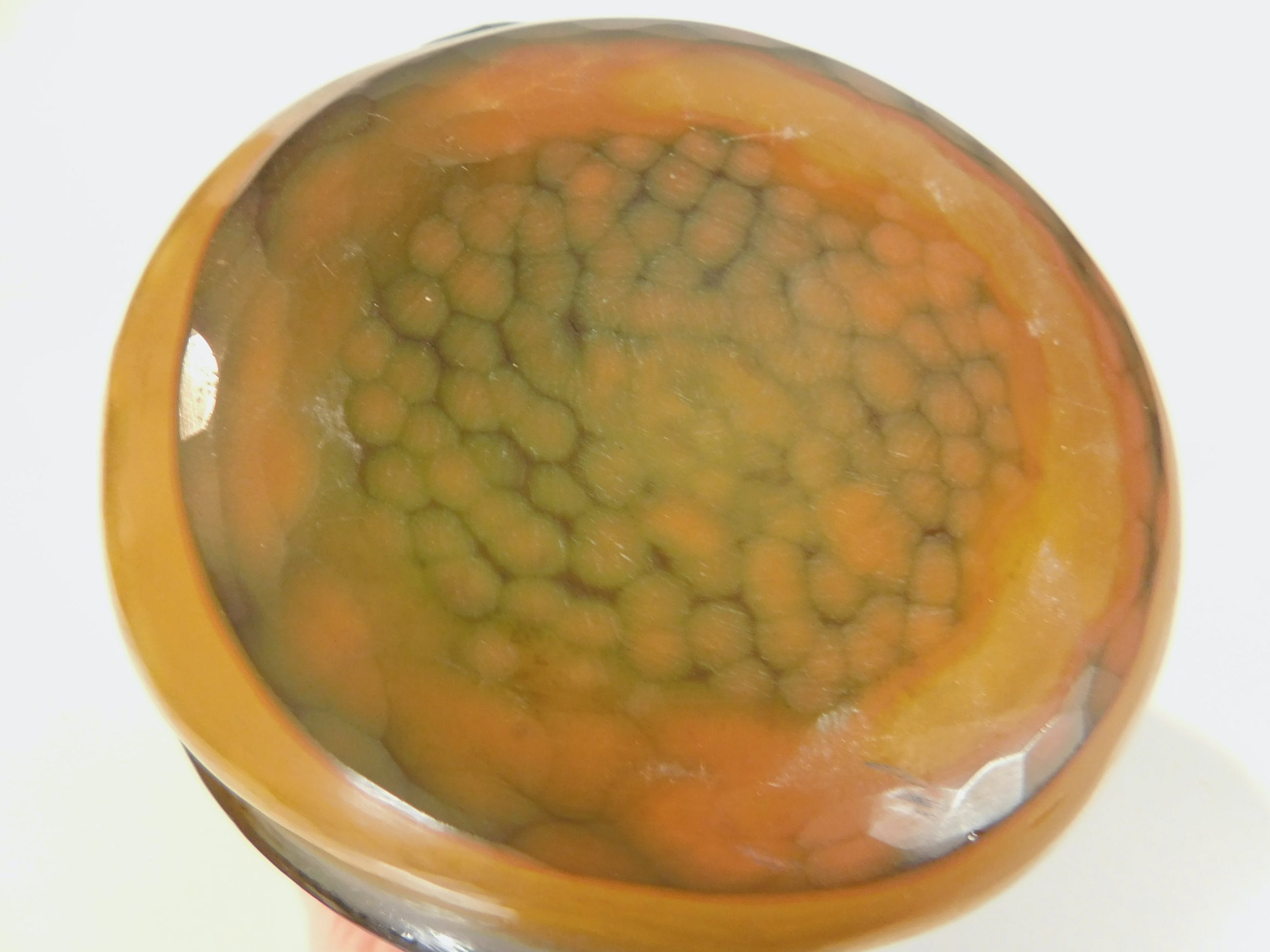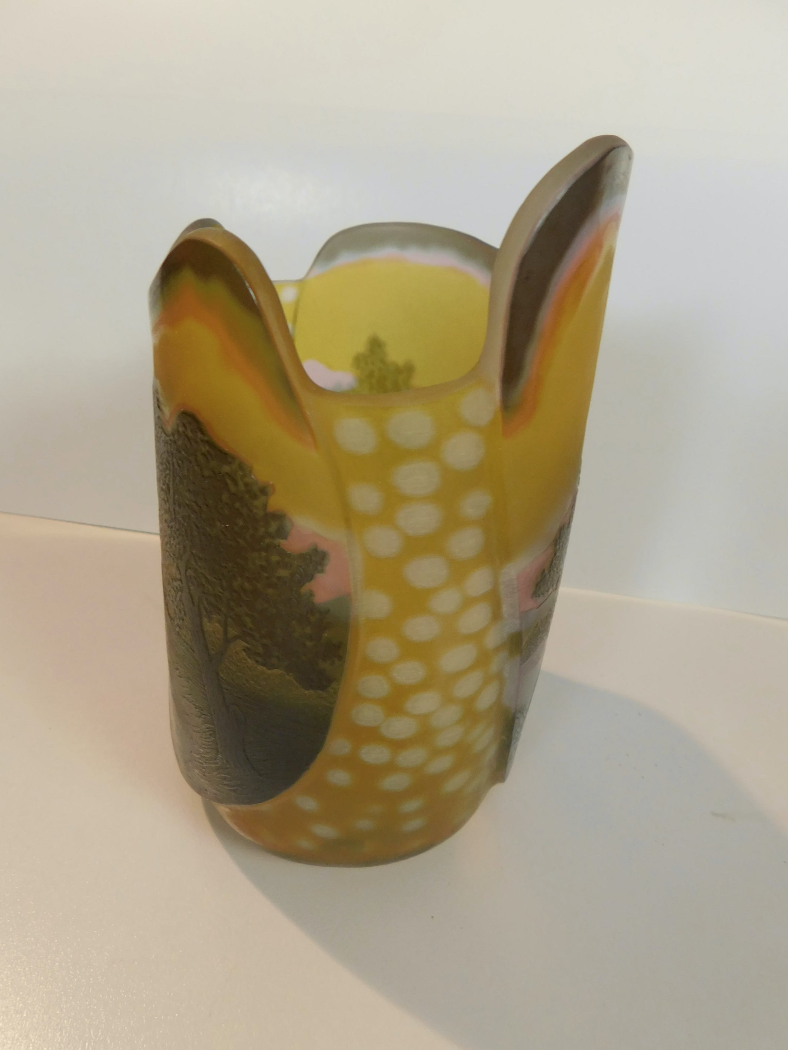 Vaas is in zeer goede staat. Afbeelding is water met een zeilboot omringd door bomen. Kleuren zijn okergeel met roze tinten, witte stippen en bruin.