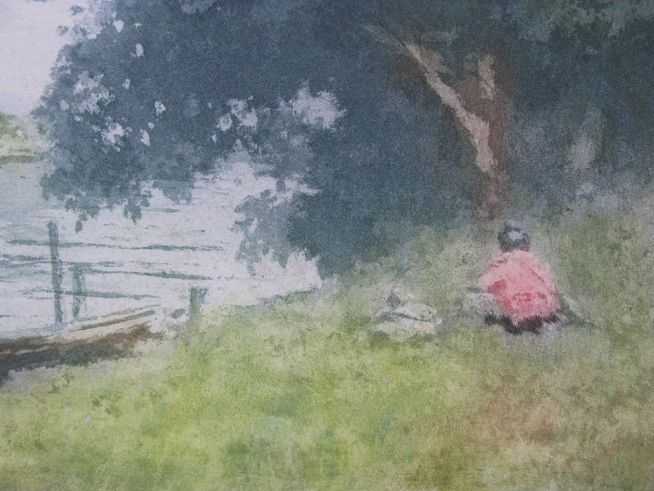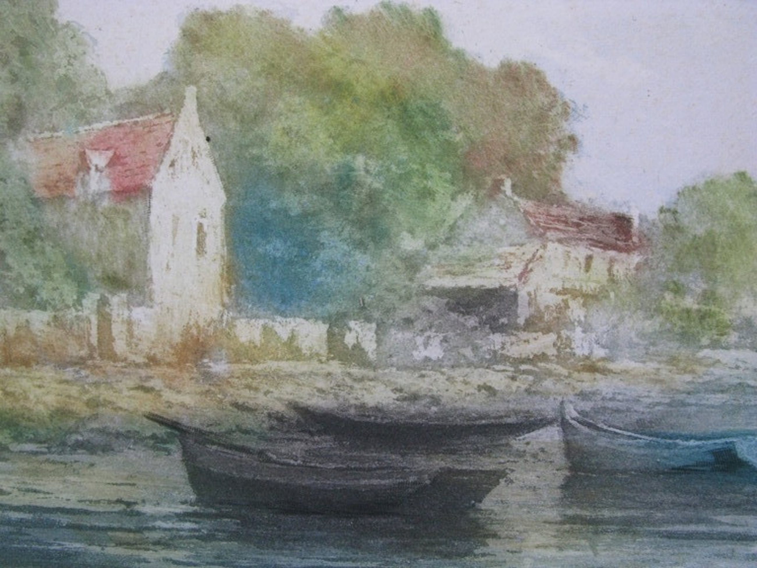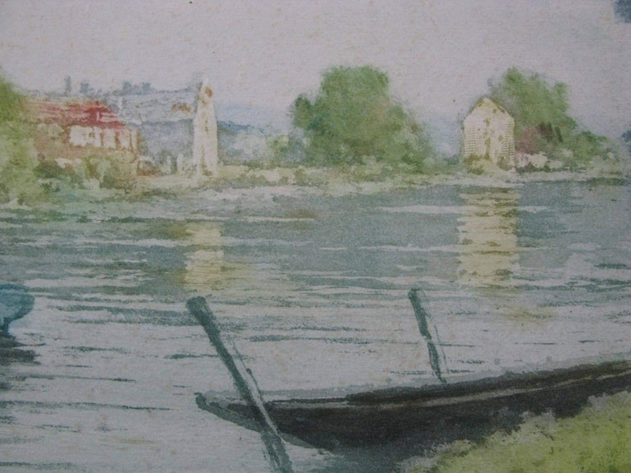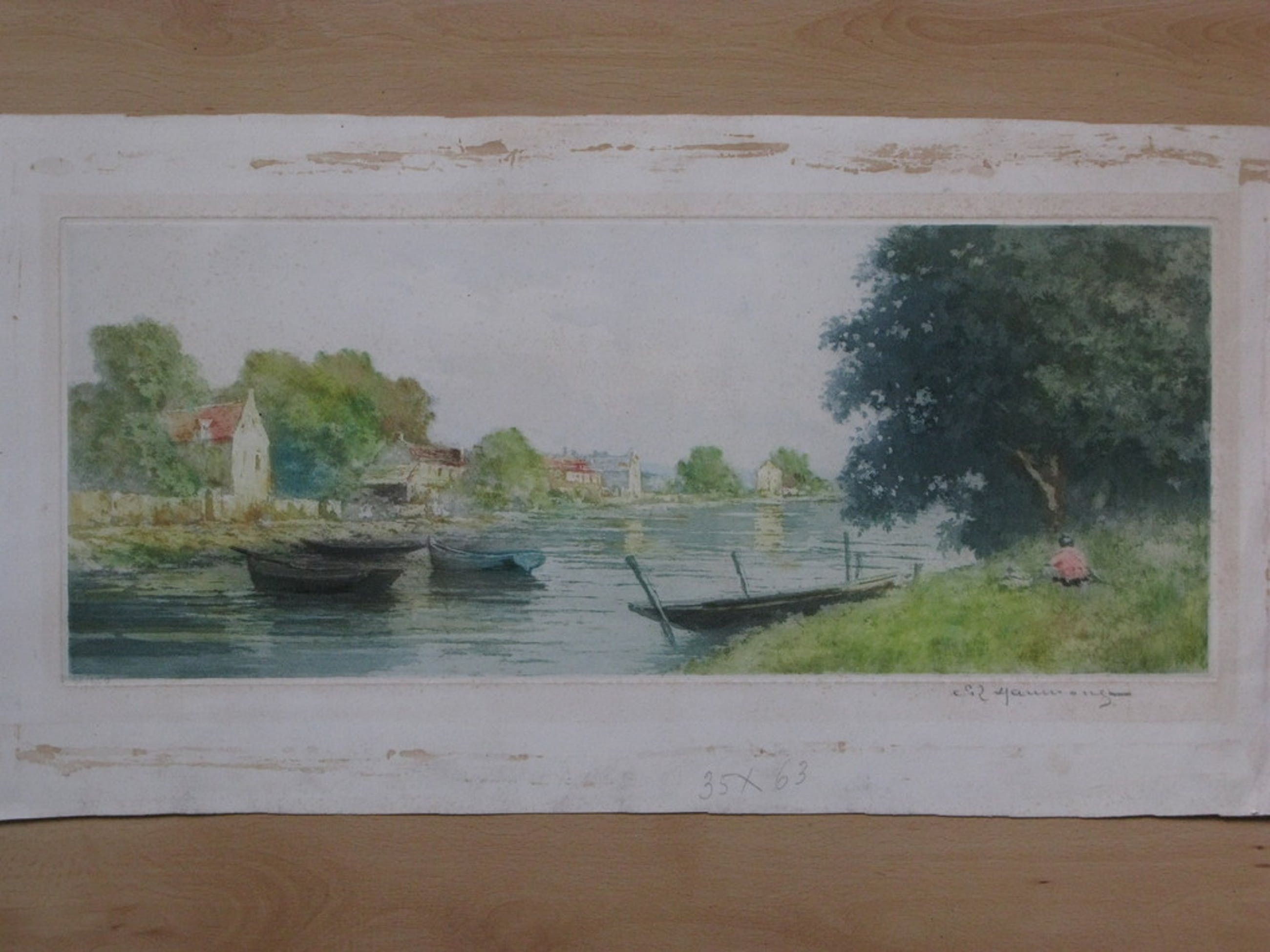 Émile Richard HAUMONTS is een Franse Impressionist die vooral tussen Parijs en Bretangne werkte. Ook in Belgie heeft hij zijn sporen achtergelaten. Hij deed regelmatig mee met exposities en in 1889 kreeg hij zelfs een " Mention honorable " op de Exposition Universelle te Parijs. Deze ets zal ergens langs de Seine zijn gemaakt. Je komt zijn naam met en zonder S tegen in de encyclopediën. De ets is in perfecte staat. Buiten 2 centimeter van het etsbeeld zijn er 2 randscheurtjes en enige oude montagelijm die volledig onder het passepartout zullen verdwijnen. De kleuren zijn nog zeer helder en fris. Het papier is stevig en strak. De ets is gesigneerd in potlood en genummerd, 58/250. Een heel aantrekkelijke grote impressionistische ets origineel uit de 19e eeuw! Maat beeld: 19x49 cm, totaal: 30x62 cm.
