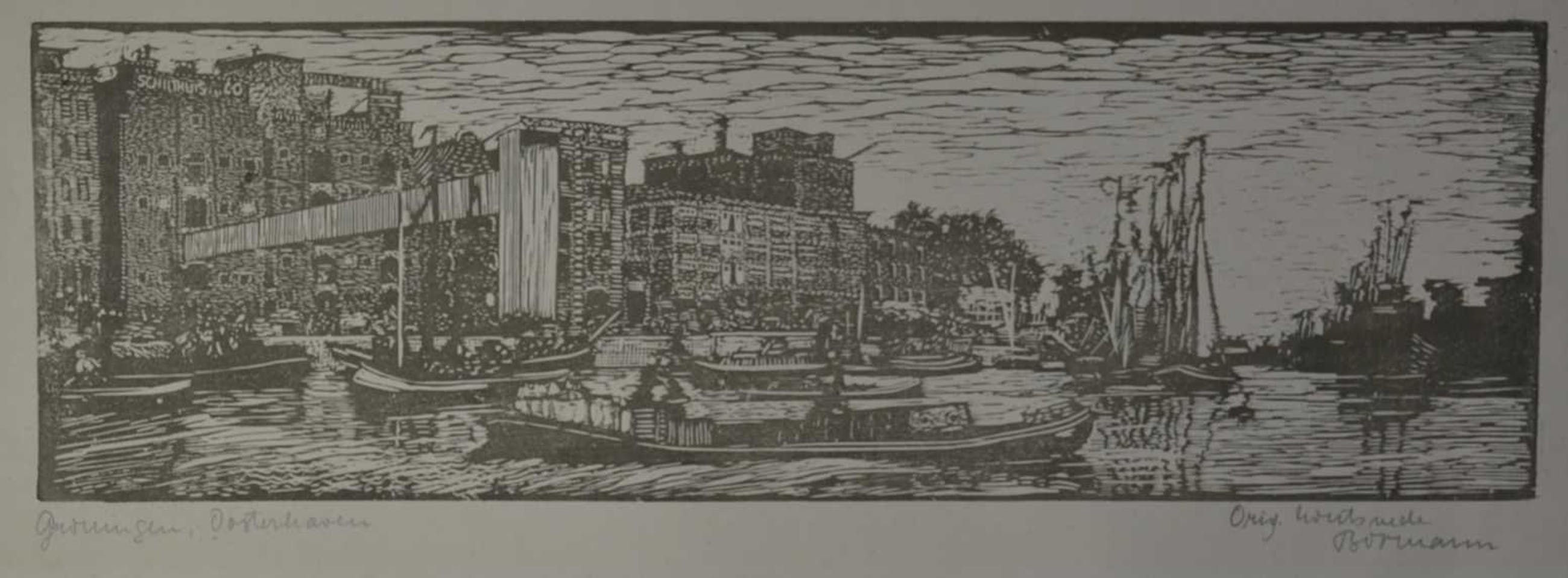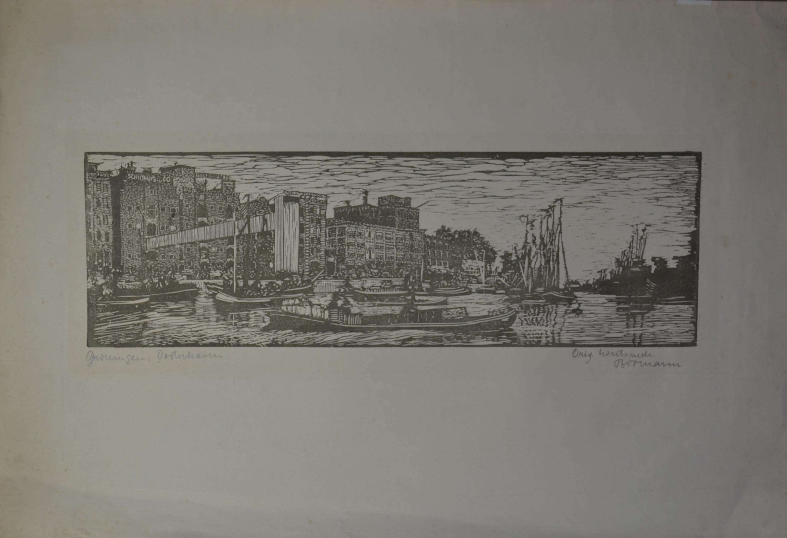 Mooie houtsnede door Emma Bormann. In 1920 visiteerde zij Groningen. Zij heeft in dat jaar verschillende houtsnedes gemaakt, deze werden ongeveer twee jaar later geëxposeerd. Formaat is van de afbeelding van de houtsnede.