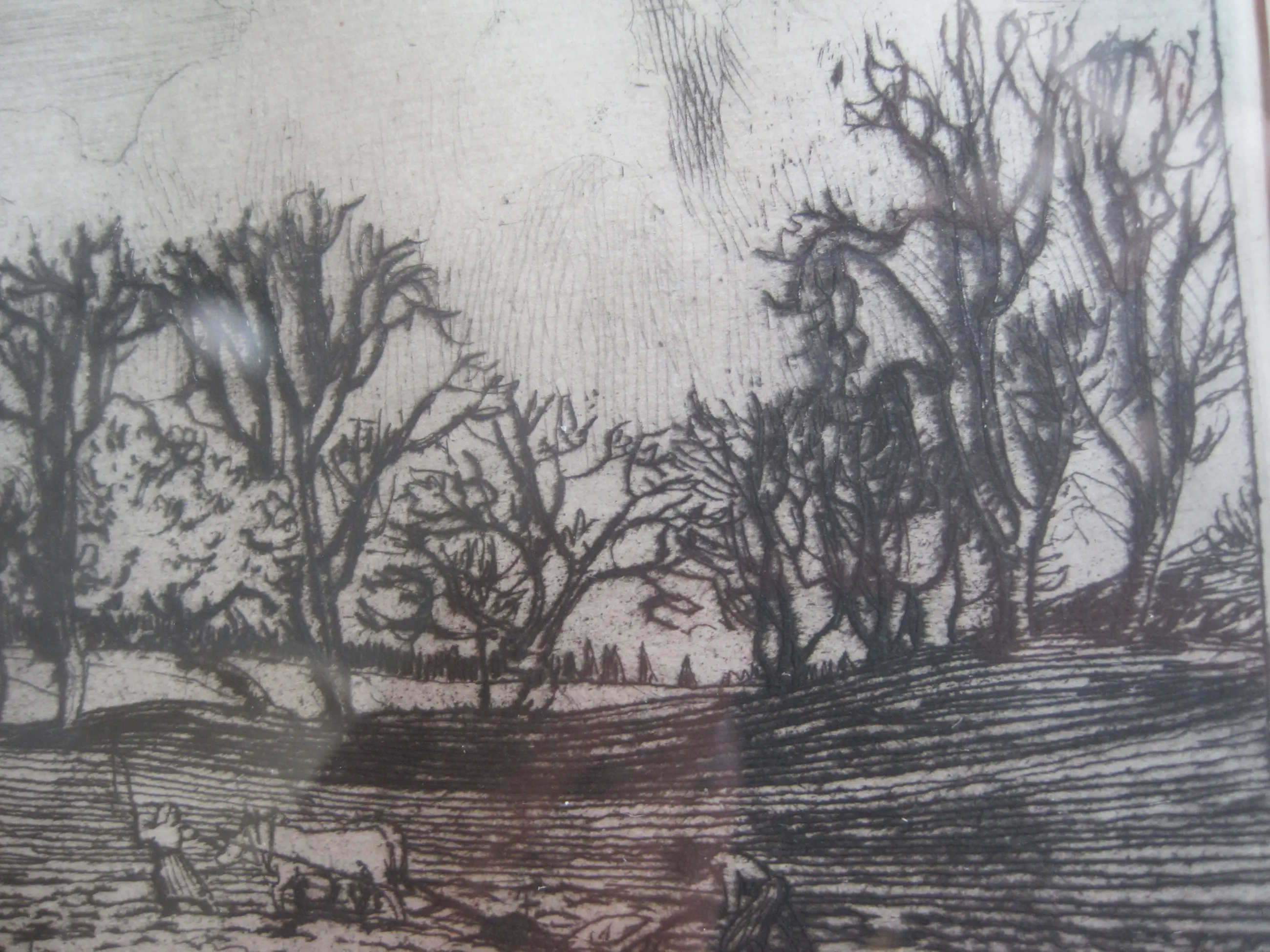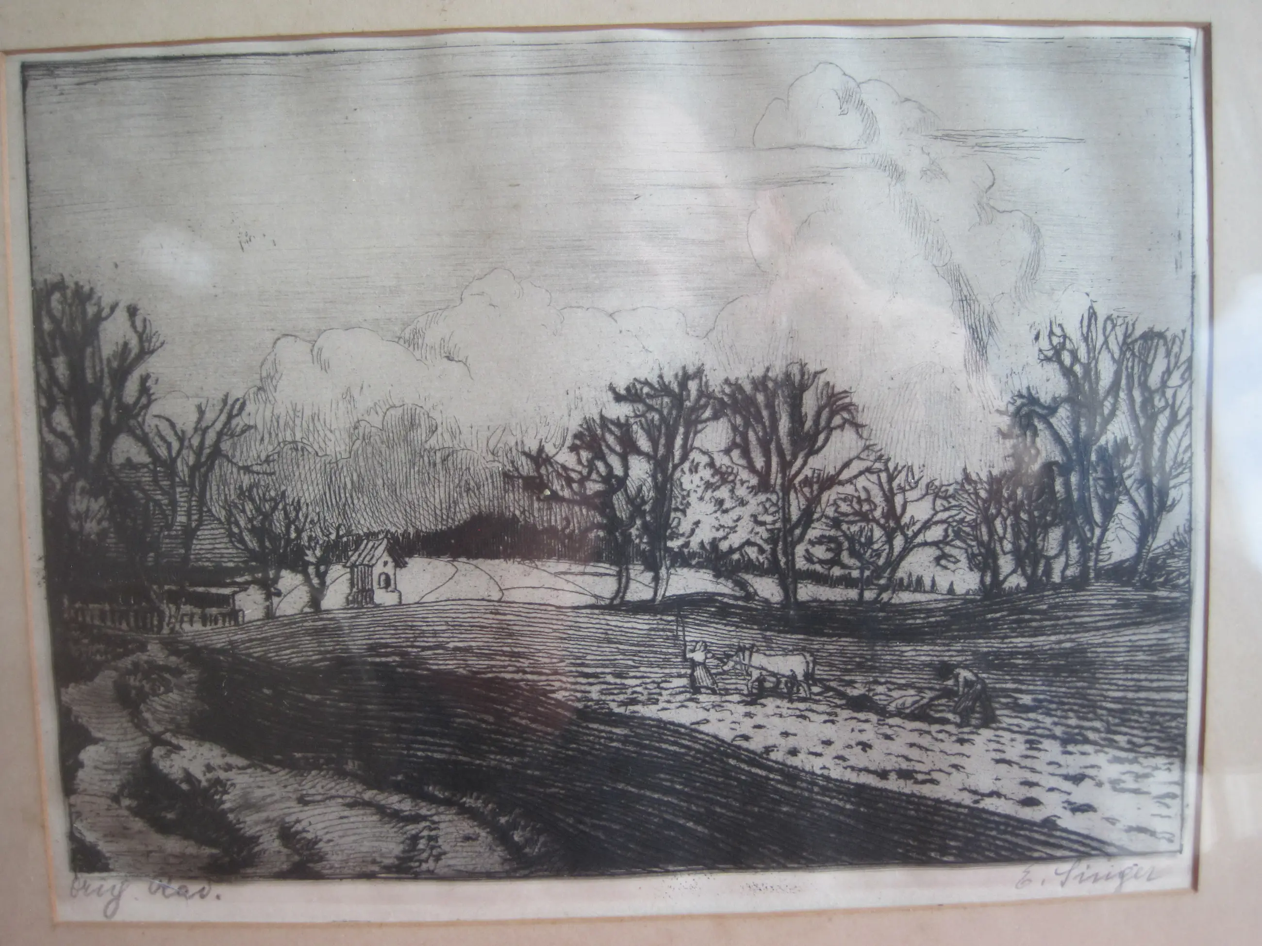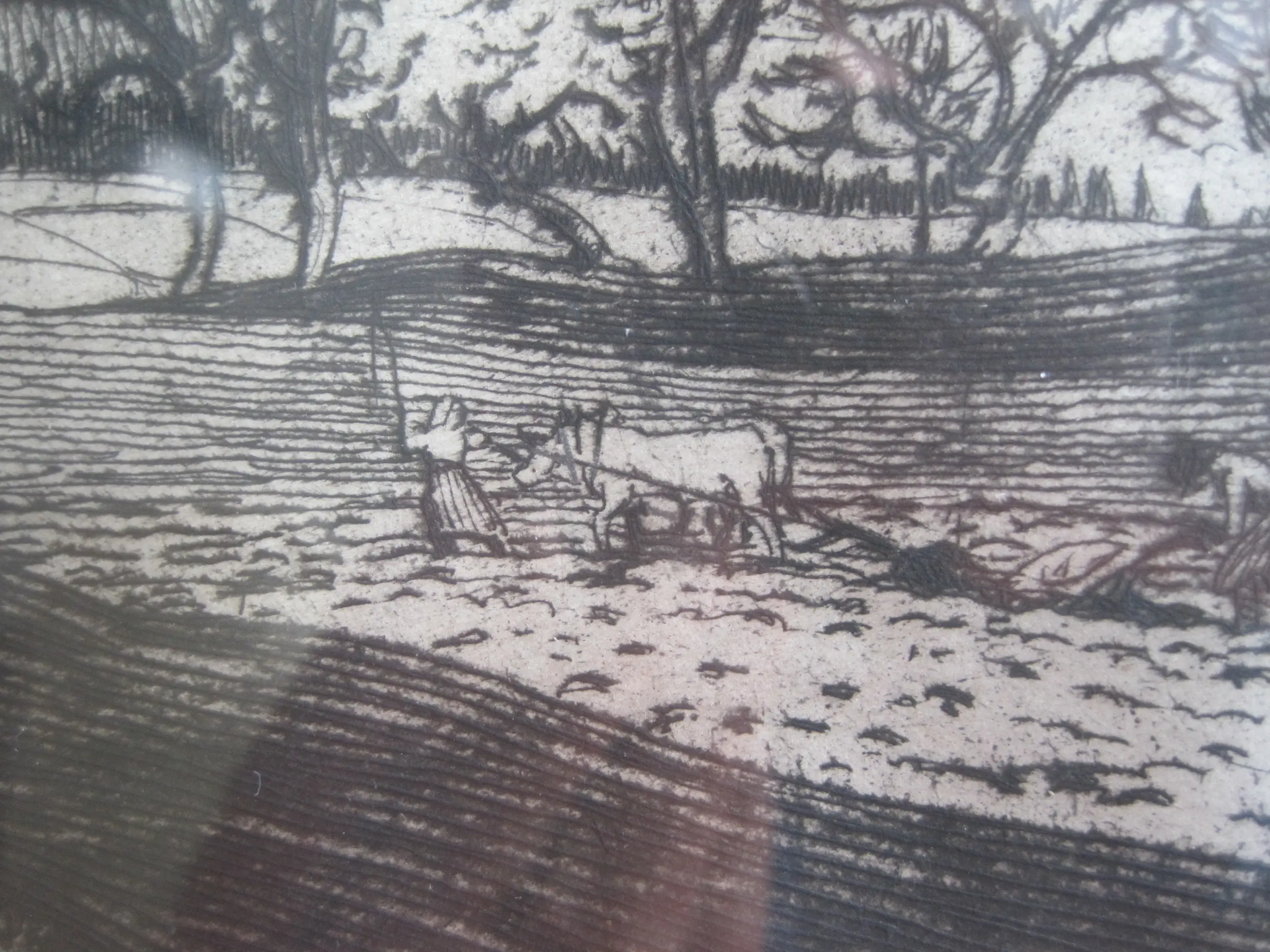 Landelijke omgeving met een ploegende en ploeterende boer en boerin op hun akker. Scherpe details van deze figuren.