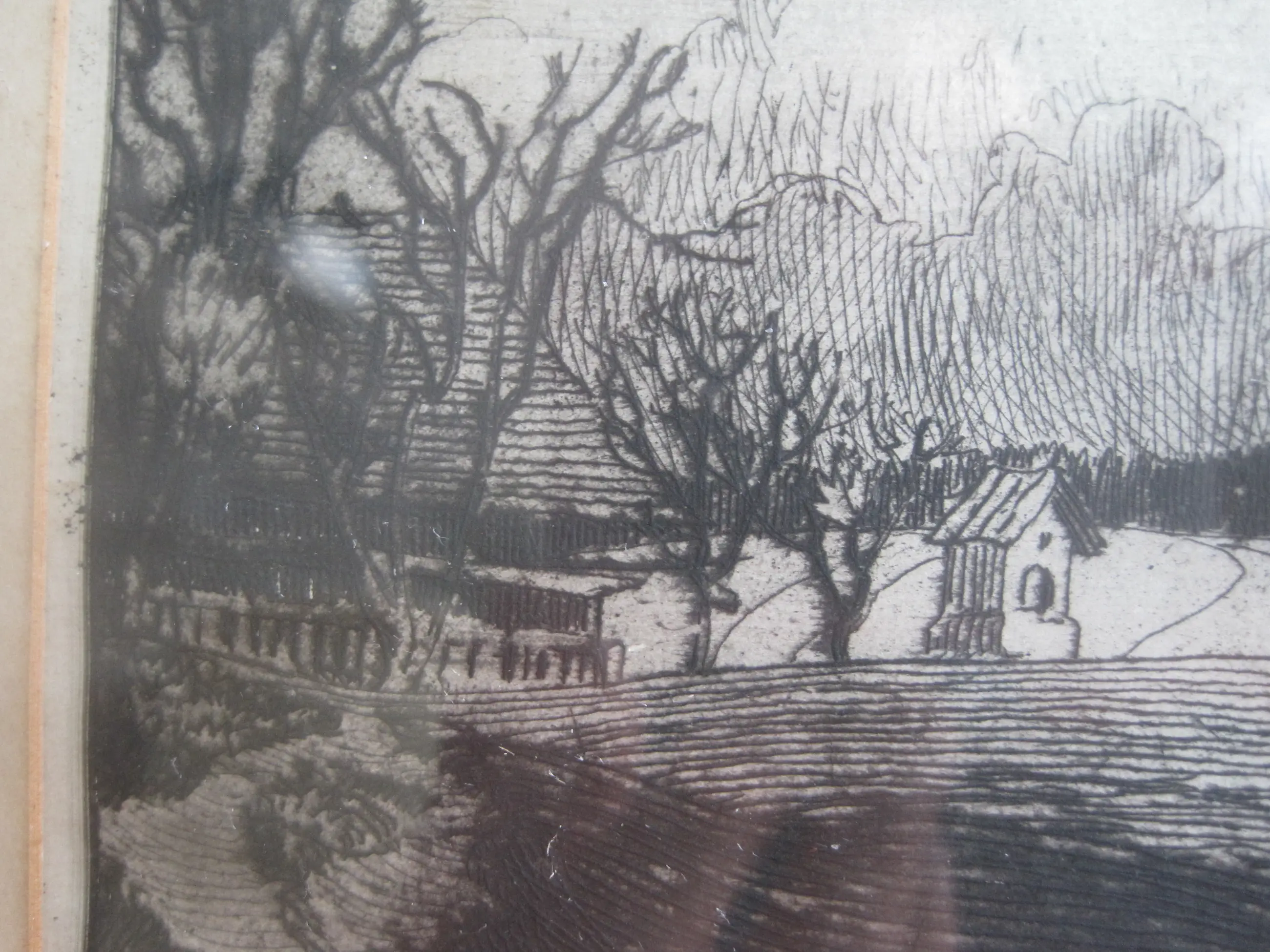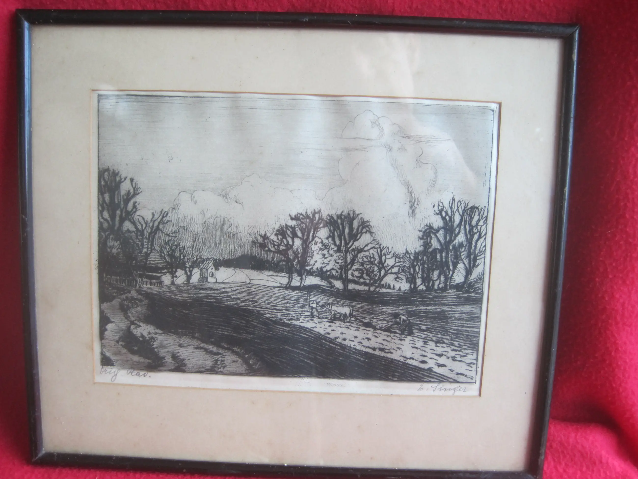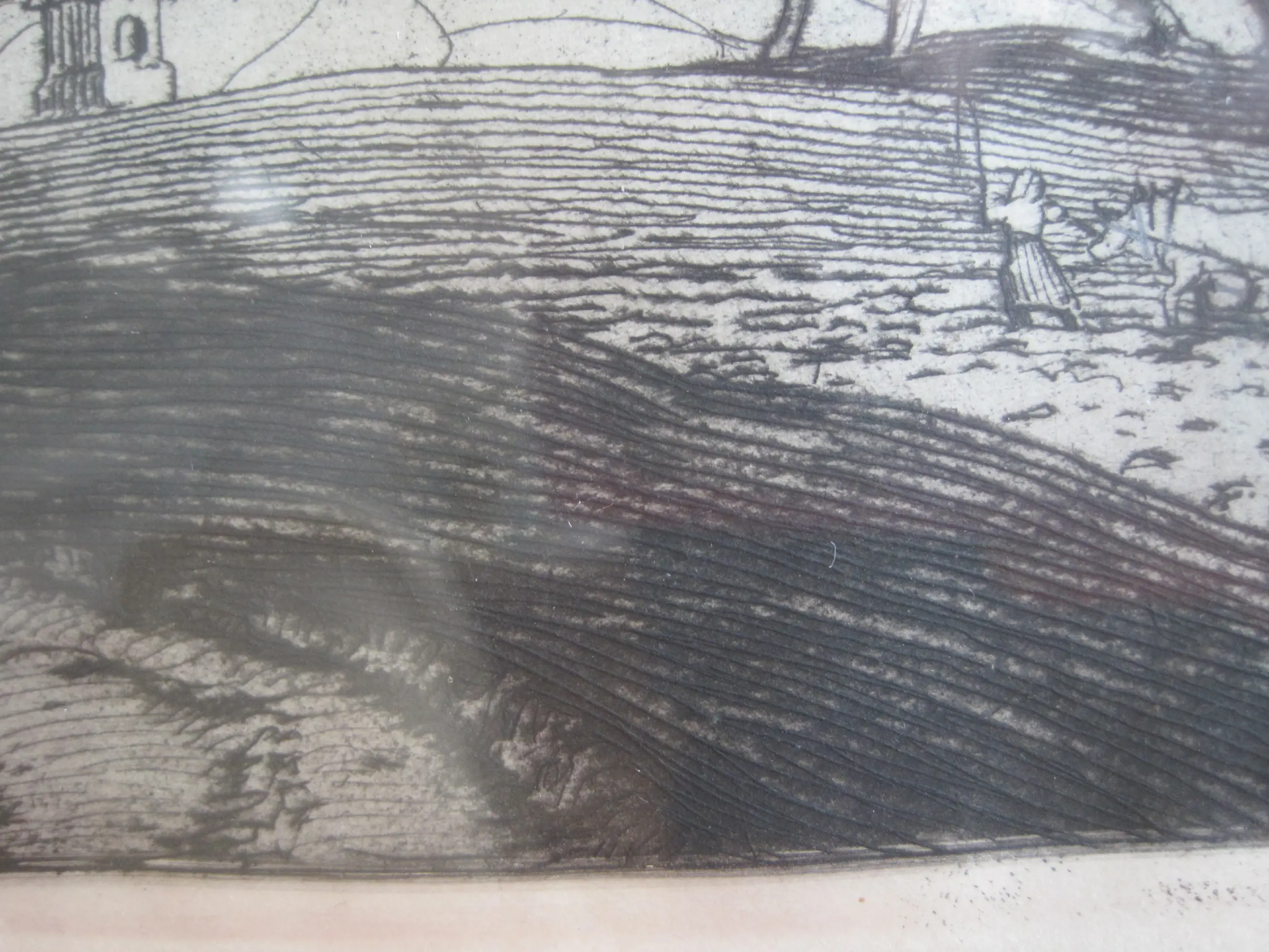 Landelijke omgeving met een ploegende en ploeterende boer en boerin op hun akker. Scherpe details van deze figuren.