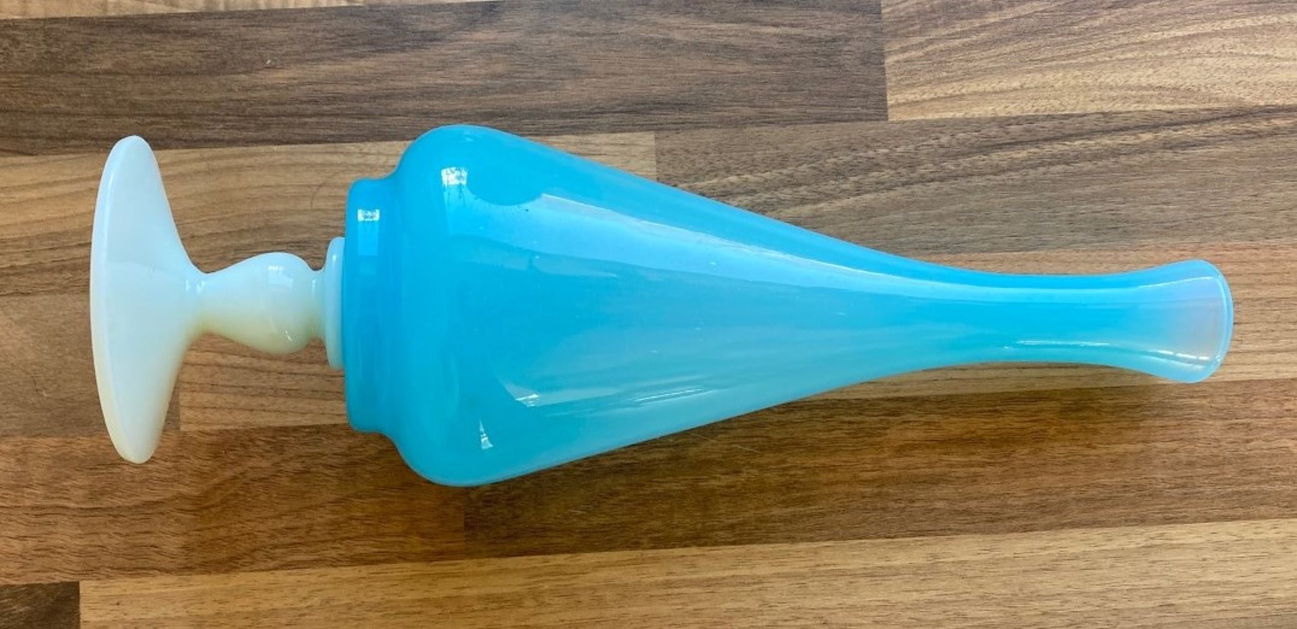 Florentijnse opaline glazen vaas uitgevoerd in lichtblauw met witte voet. Voorzien geweest van merksticker, maar deze is niet meer aanwezig. In zeer goede gebruikte conditie.