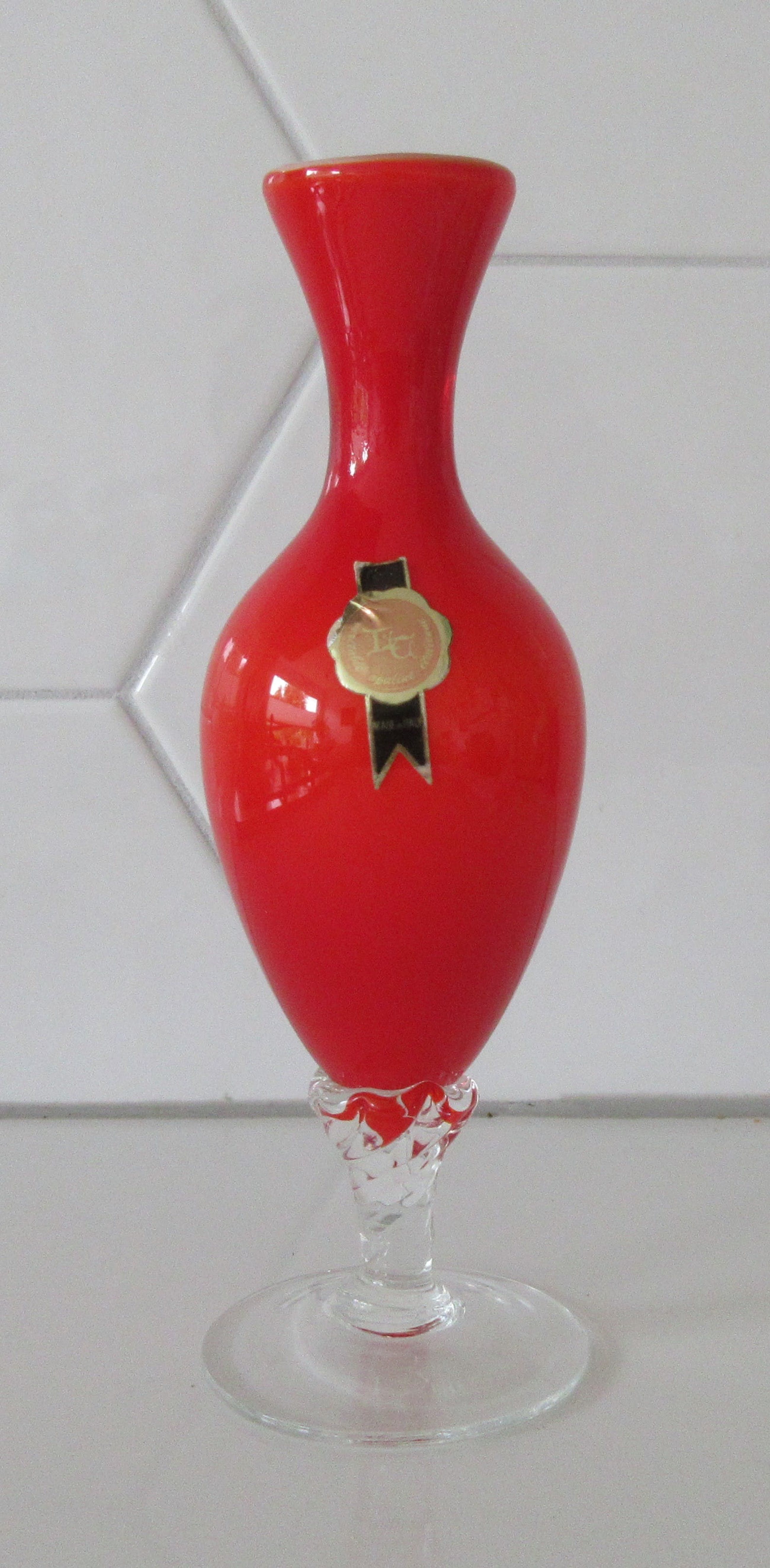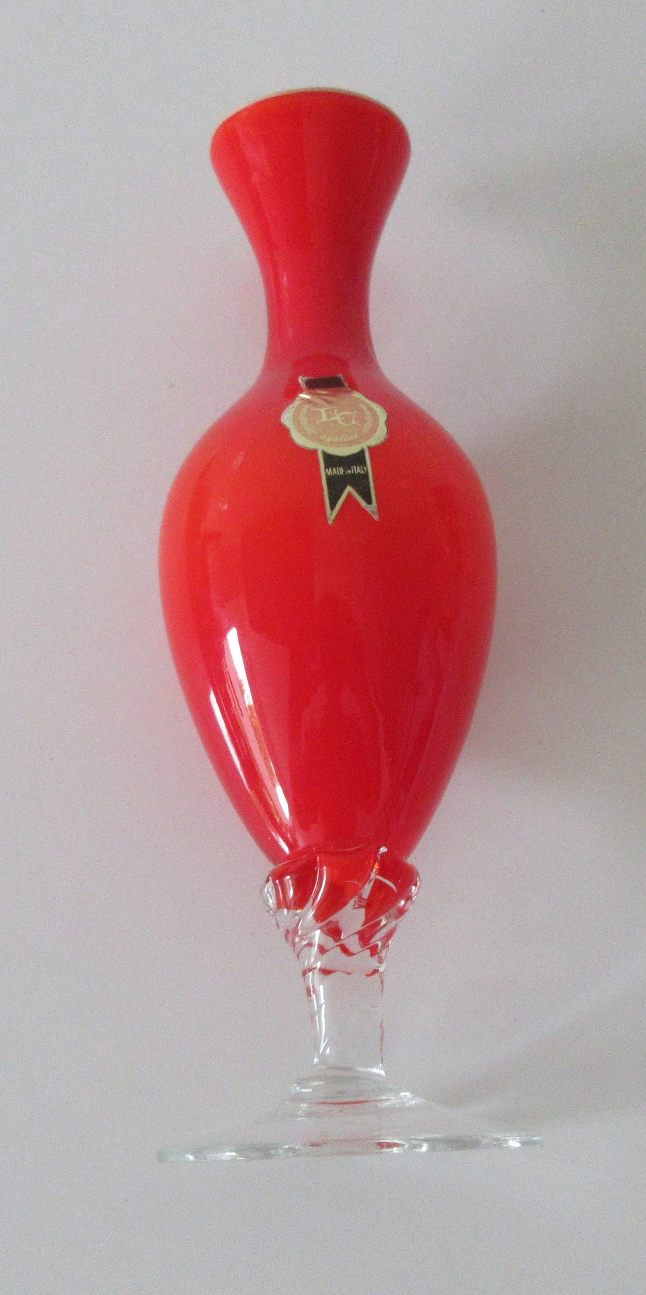 Oranje opaline solifleur vaasje van Empoli glas uit Italie. Voorzien van gouden zwarten papieren merksticker.