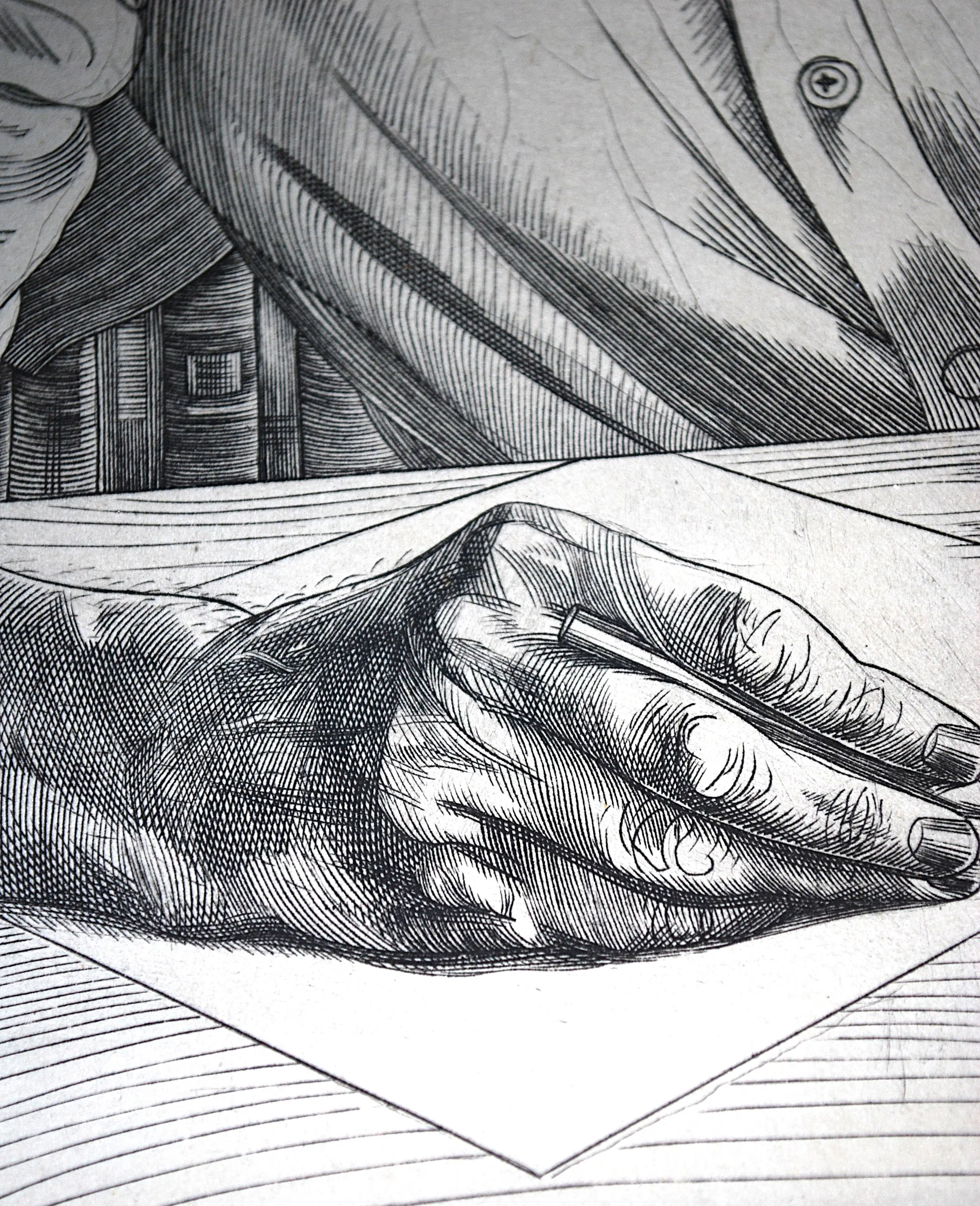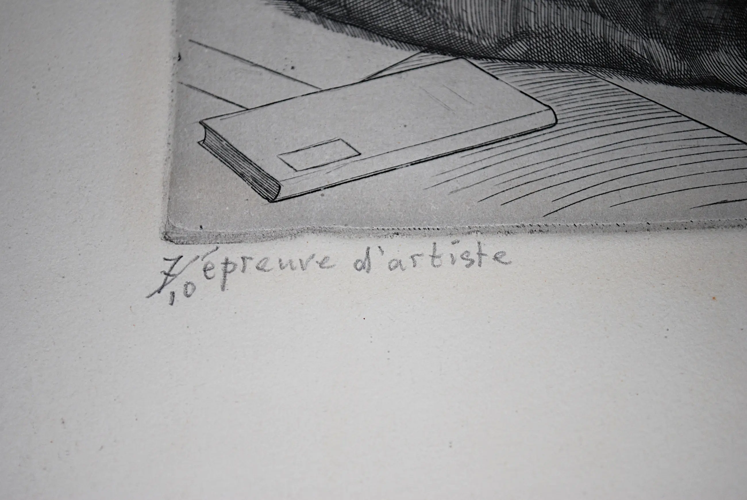 Fraaie kopergravure, oplage slechts 10 (épreuve d'artiste). Het blad zit achter glas, in een strakke hardhouten lijst.