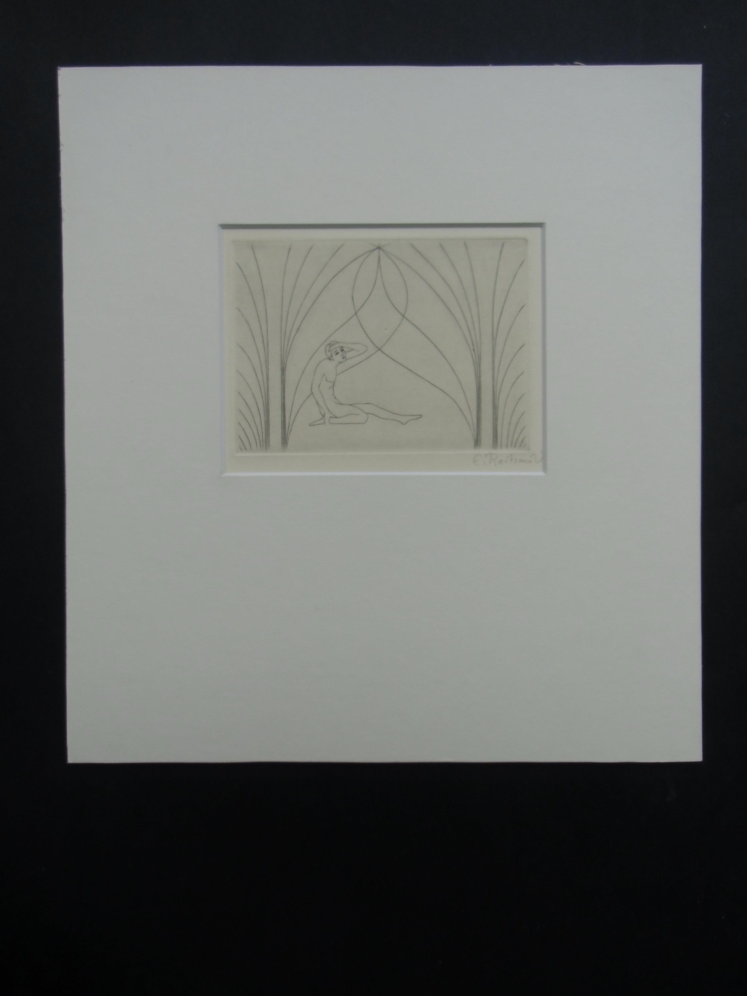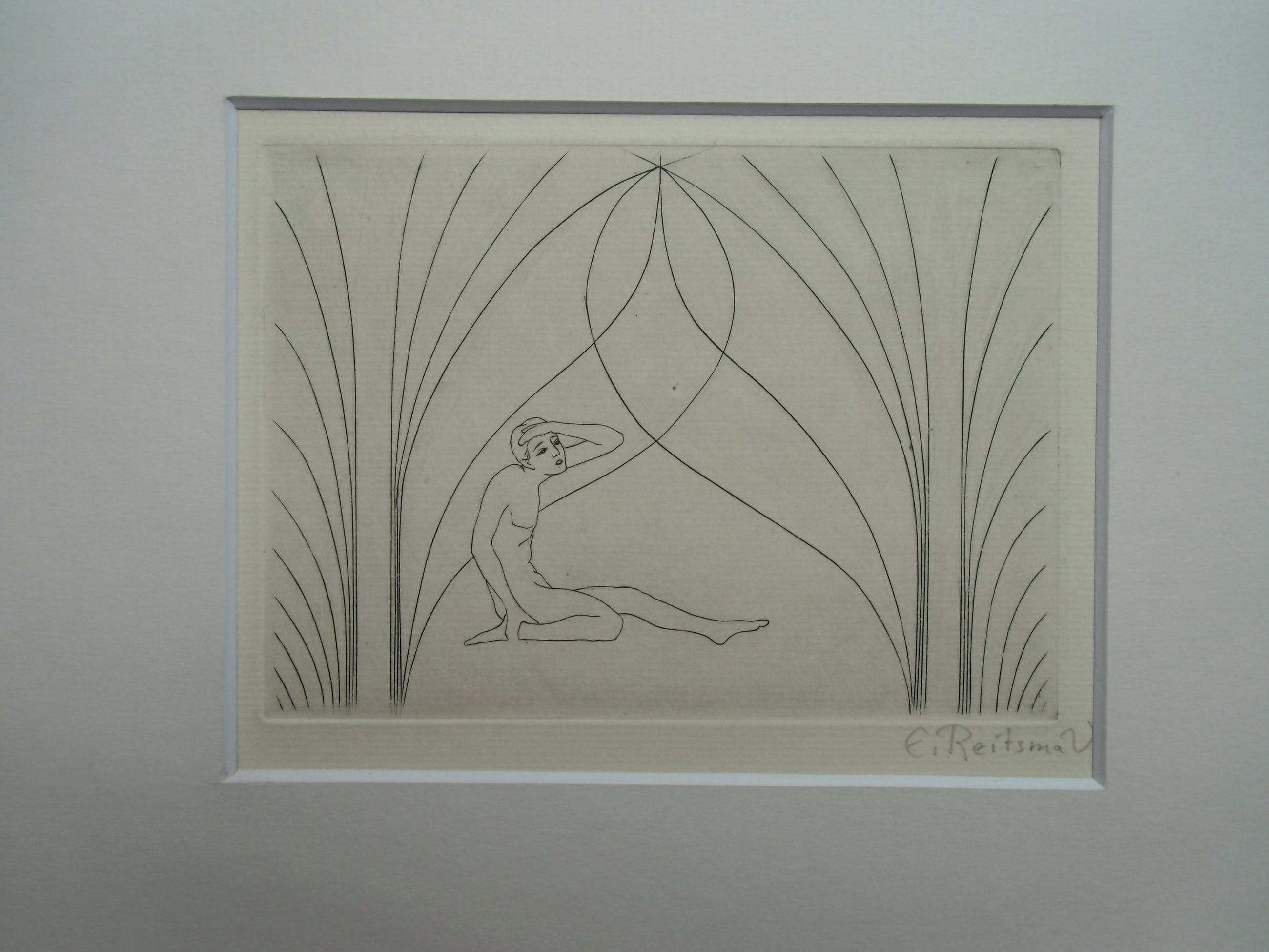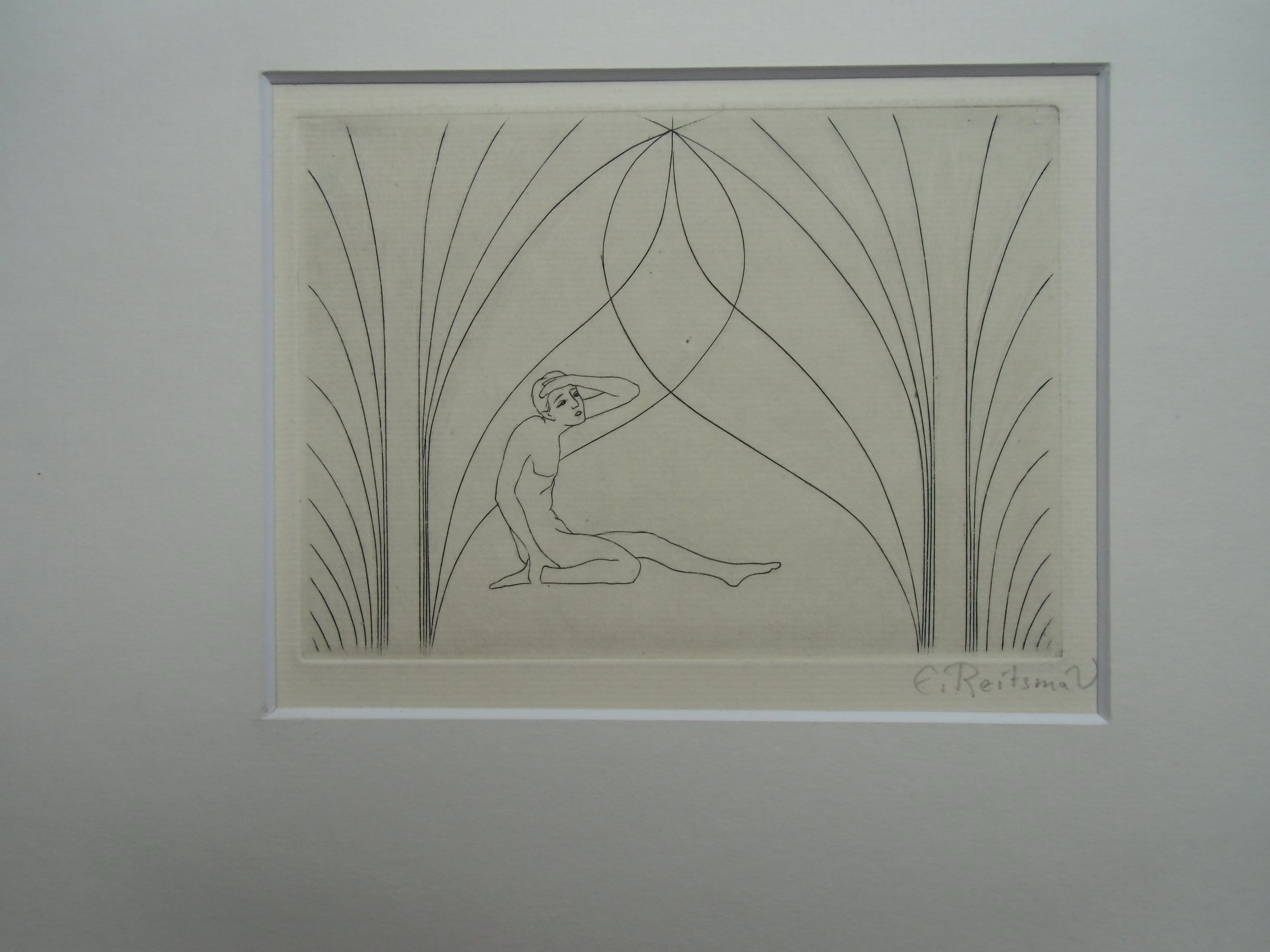 Van Engelien Reitsma-Valenca worden hier twee kopergravures aangeboden. - Vrouwelijk naakt met opgeheven armen. Gedateerd 1918. Gesigneerd met potlood en opgenomen in passepartout met achtervel. Uitstekende conditie.Deze kopergravure is geïnspireerd door de Wijzingen van R.Tagore. - Jongen met poedel in zijn armen. Gedateerd 1933. Beeldafmeting 7.8 x 7.8 cm. In passepartout met de afmetingen 28 x 24 cm. Monogram in potlood.(gegevens afkomstig uit Michel Kersten "De Nederlandse Kopergravure ").
