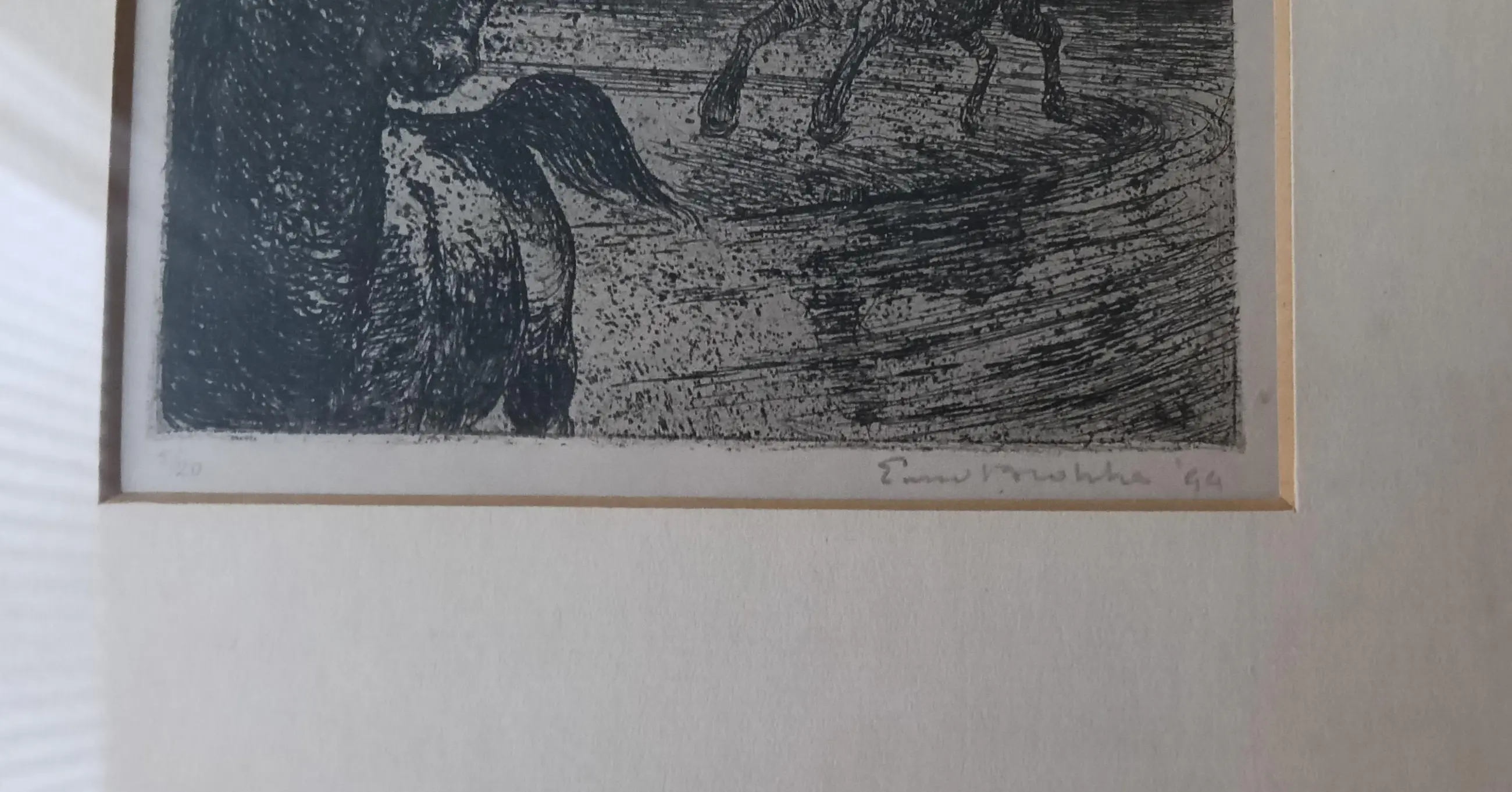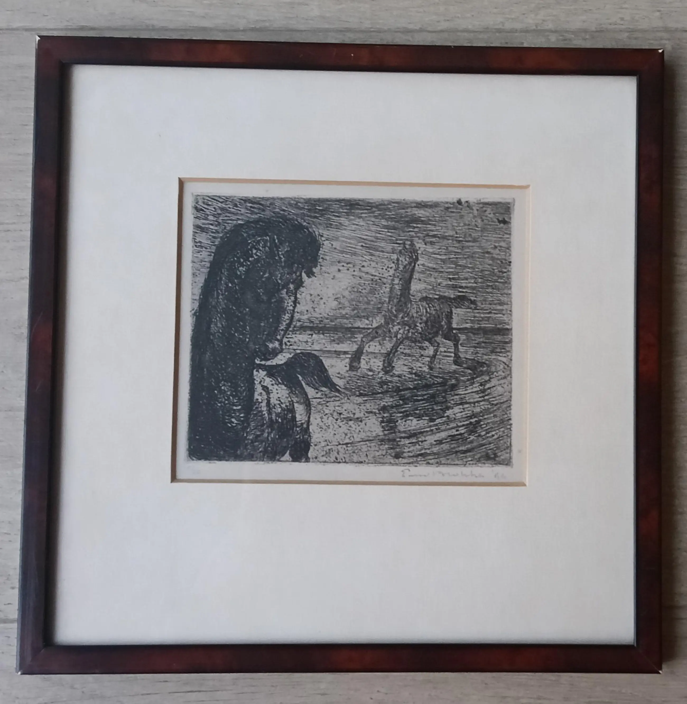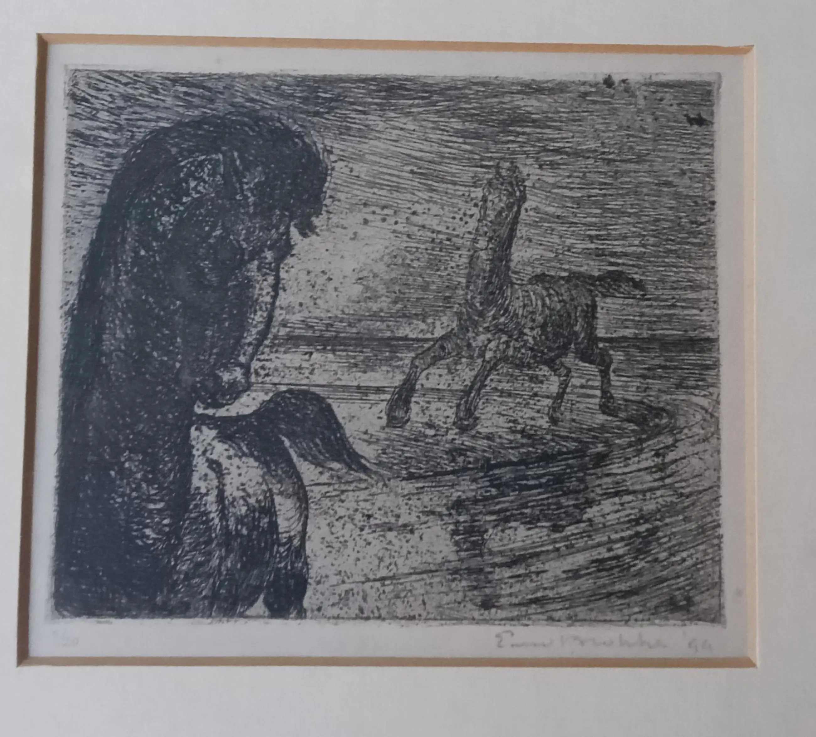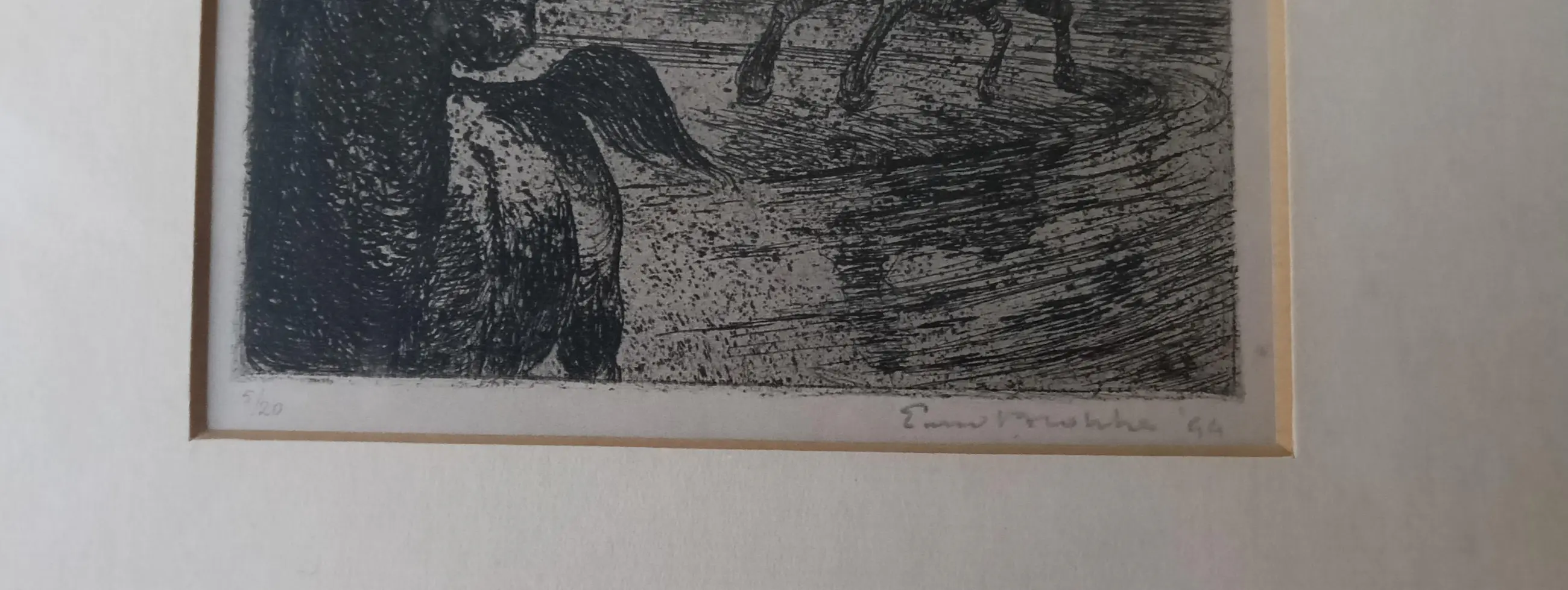 Mooie ets van twee paarden op geschept papier van Enno Brokke. Ets nr. 5 van 20. Rechtsonder met potlood gesigneerd.